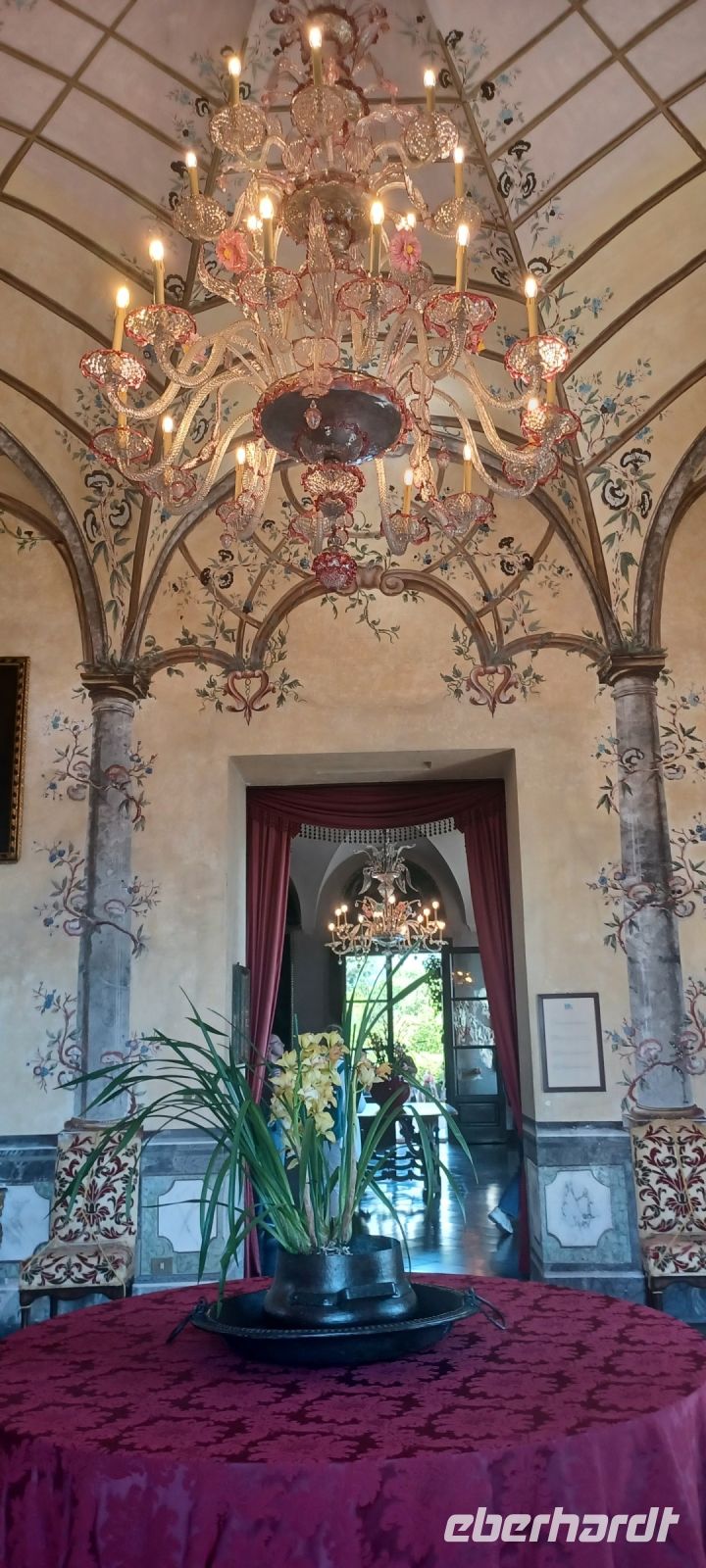 Den 2. Stopp machen wir mit dem Boot auf der Isola Pescatori -der Fischerinsel. Wir schwärmen zur Mittagspause aus bei einem Kaffee u. Eis oder in einem der zahlreichen Fischrestaurants. Sehr zu empfehlen ist der fangfrische Tagesfisch - Wolfs-oder auch Seebarsch genannt an mediterranem Gemüsebouquet. Es gibt nicht mehr viele Fischer, weil es an beruflichem Nachwuchs fehlt. Ein Spaziergang durch die kleinen Gäschen zum See rundet unseren Aufenthalt ab. Das Boot bringt uns nun zur Insel Isola Bella, die der Graf Vitaliano Borromeo 1650 begann zu gestalten. Über vier Jahrhunderte dauerten die baulichen u. gestalterischen Aktivitäten, die uns Besuchern heute bezaubern: der Thronsaal, die Bildergalerie des Generals Berthier mit 130 Bildern in barocker, Flächenhängung, der Musiksaal u. der Raum von Napoleon, wo die Konferenz von Stresa 1935 der ehemals Weltkriegsverbündeten (Frankreich, Großbritanien u. Italien mit Gastgeber Mussoloni) gegen die Aufrüstungspolitik Deutschlands stattfand. Wie wir wissen-leider erfolglos.