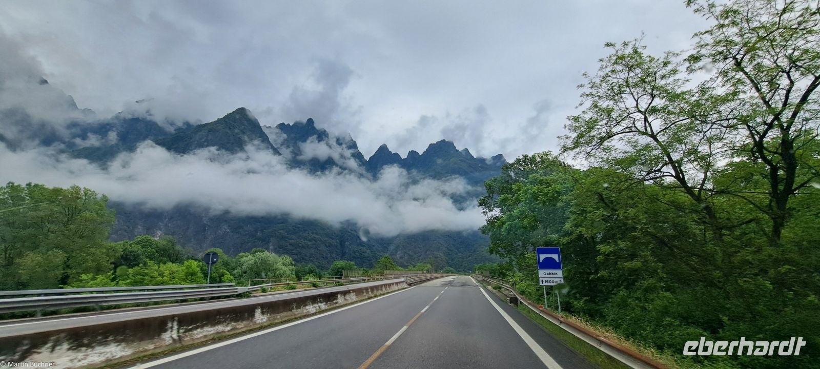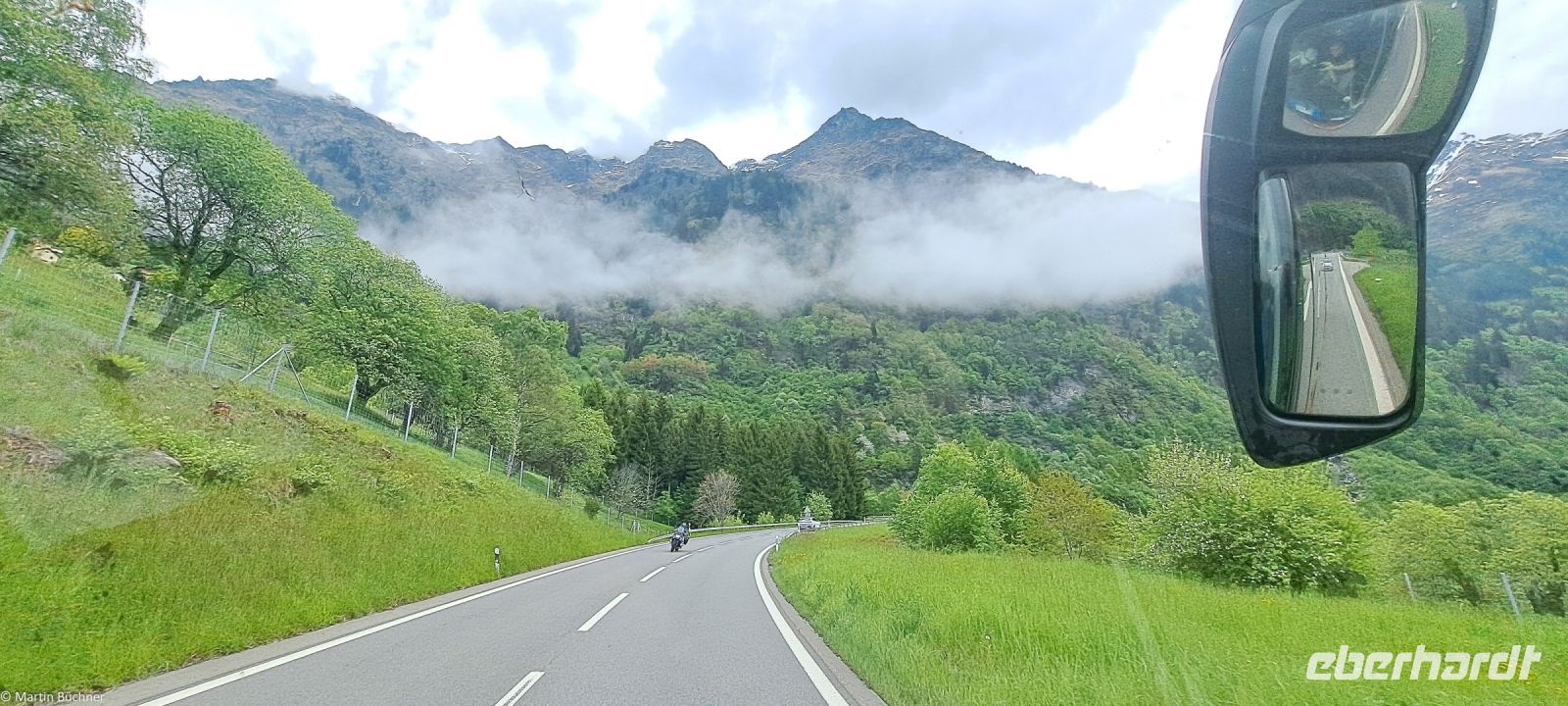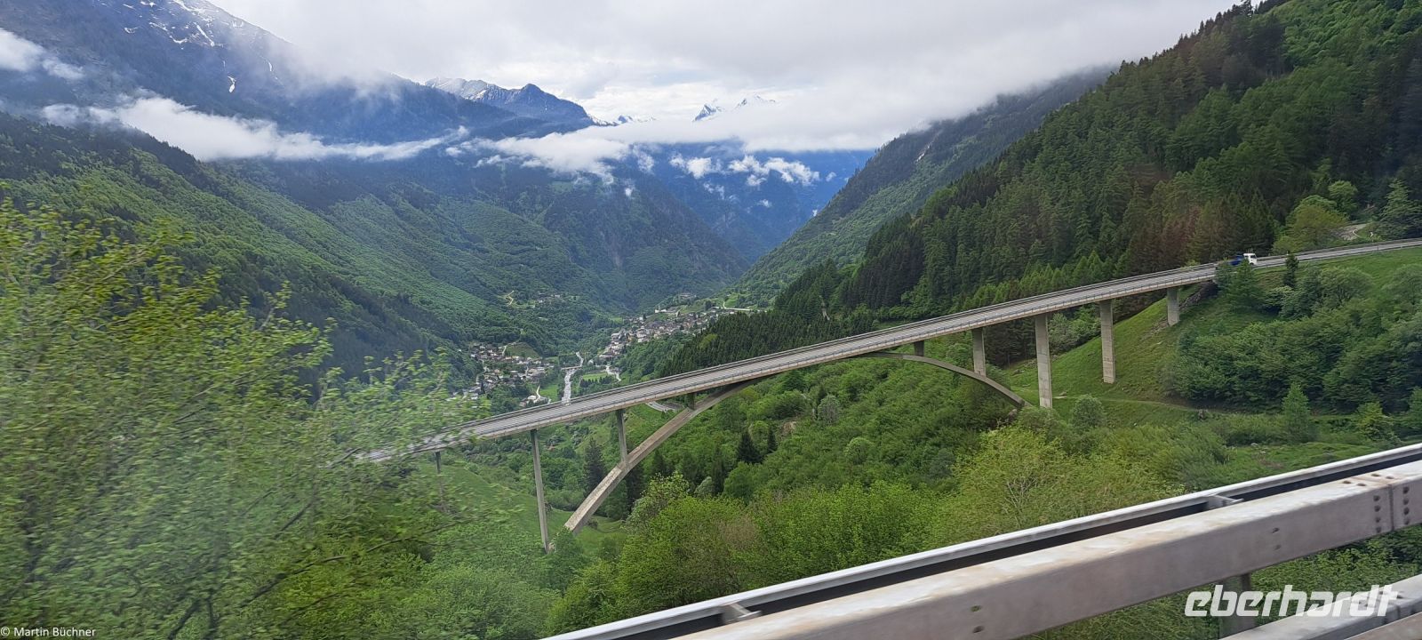 Ähnlich wie bereits am Tag der Hinreise geht es ein letztes Mal entlang des Ufers des Lago Maggiore nach Locarno und Bellinzona In Richtung San Bernardino. Der für uns höchsten Stelle bei etwa 1600 Metern der queren wir den zirka 6 Kilometer langen San Bernadino Tunnel. Damit verlassen wir die Italienischsprachige Schweiz und das Tessin und erreichen den Kanton Graubünden und damit das Rheintal. Über Hinterrhein, Splügen, die Via Mala Schlucht, Reichenau und Chur erreichen wir die „Heidi-Berge“ bei Mayenfeld. Kurz darauf das Fürstentum Liechtenstein. Wir überqueren den Rhein und erreichen Österreich im Bundesland Vorarlberg. Bei Bregenz am Bodensee erreichen wir durch den Pfändertunnel Deutschland. Vorbei an Lindau am Bodensee, dem ersten Ausstieg bei Ulm geht es über Nürnberg bis nach Mitteldeutschland.