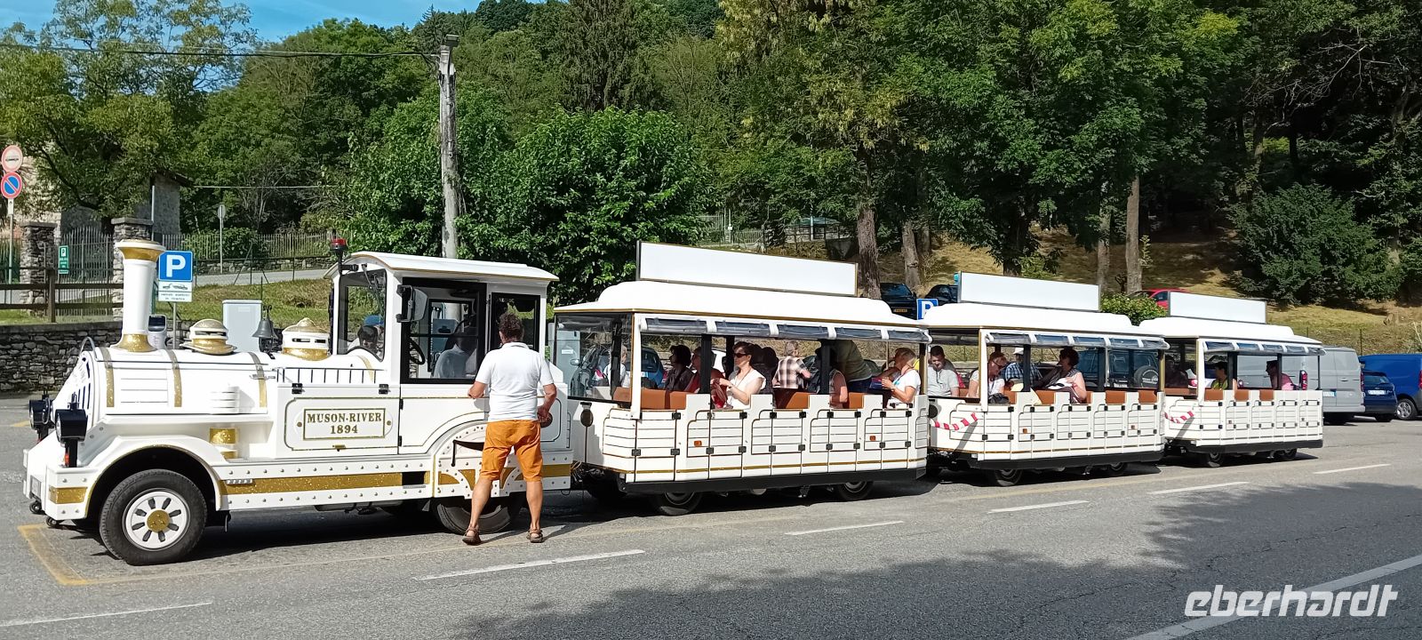 Orta, um dort vom Bus-Parkplatz mit dem „Trenino“, einem Bimmelzug, zum „Sacro Monte“ zu fahren.