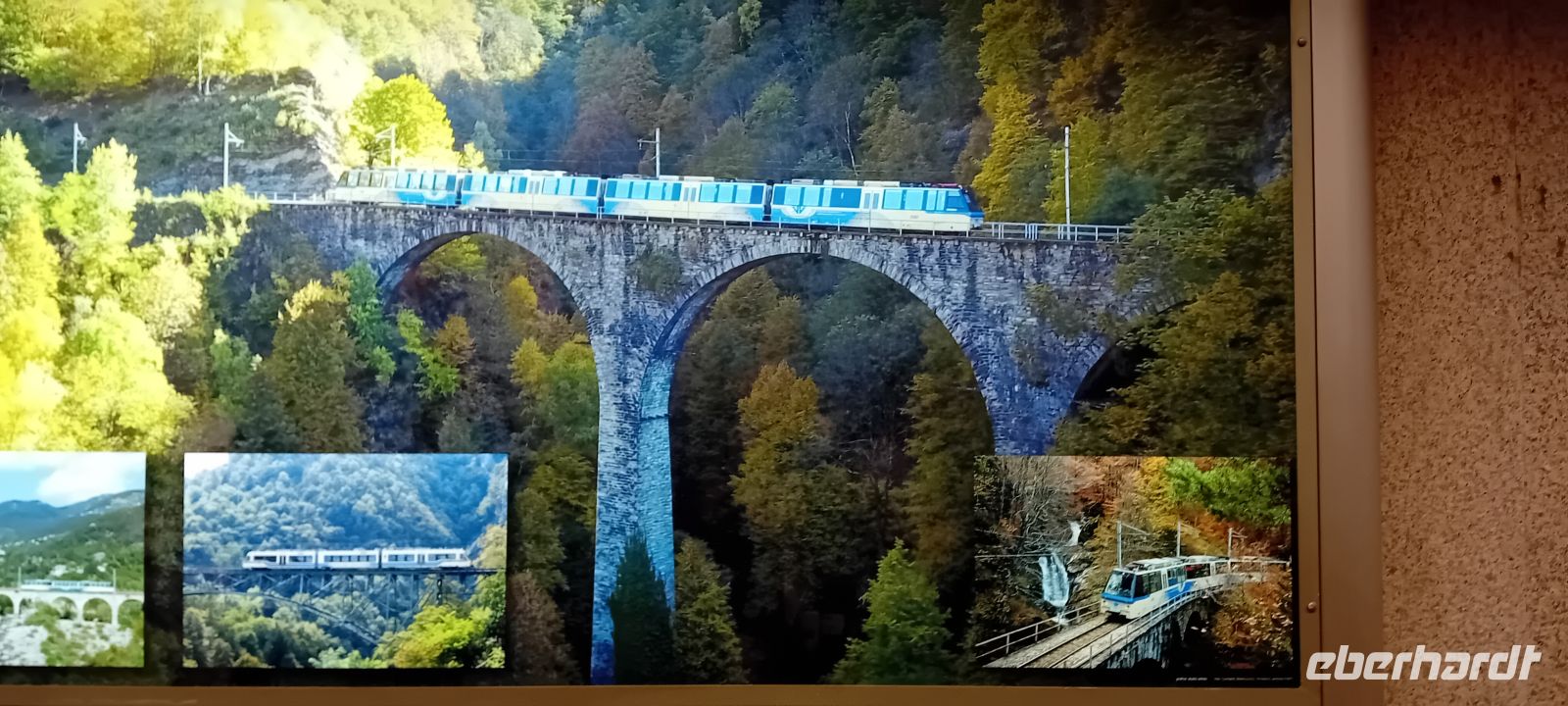 Die Centovallibahn ist eine Meterspur-Panoramastrecke, die die Gotthard- mit der Simplonstrecke verbindet und dabei durch die wildromantischen Täler Centovalli und Valle Vigezzo führt. Und wir hören von unserer örtlichen Reiseleiterin Barbara immer wieder: „Und jetzt die Fotoapparate bereithalten“, denn die etwa 52 Kilometer lange und landschaftlich spektakuläre Strecke überquert 83 Brücken und passiert 31 Tunnel in etwa anderthalb Stunden. Sie ist bekannt für ihre atemberaubende Fahrt durch Kastanienwälder, entlang von Flüssen und durch malerische Dörfer und gilt als eine der schönsten Bahnstrecken der Alpen.