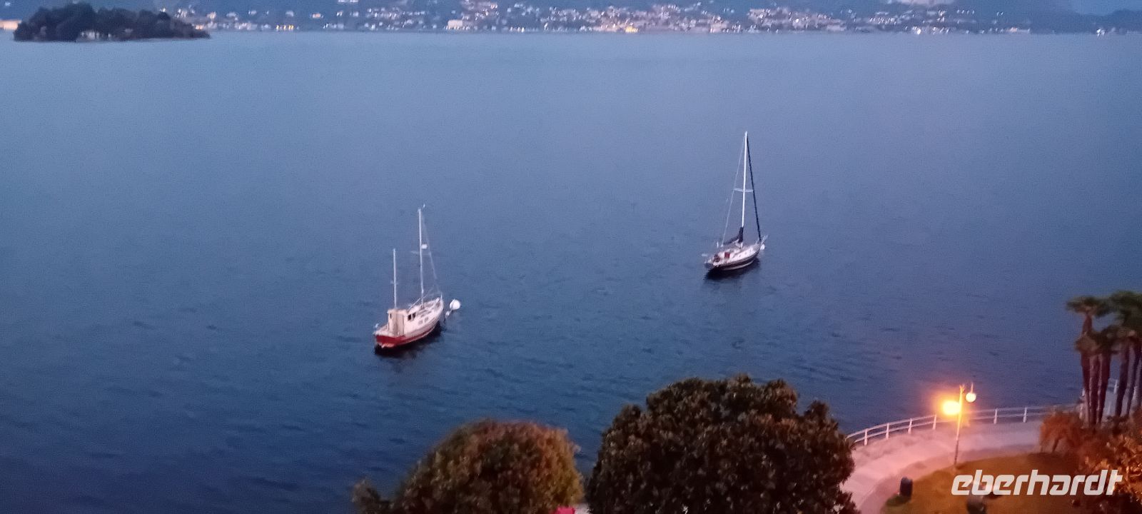 Und nach dem Abendessen entdecken wir Verbania: Palmen am Seeufer, elegante Villen, die historische Altstadt und alle 20 Minuten Lichtinstallationen am Hafen, nur 150 m von unserem Hotel entfernt.