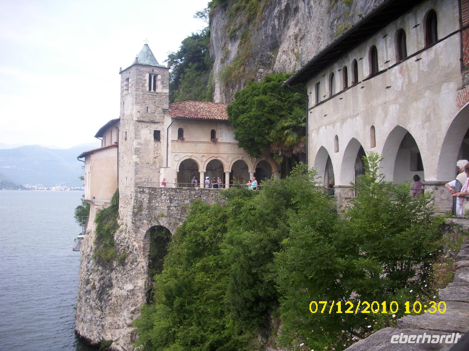 der Inseln ist ein von Menschenhand geschaffenes Kunstwerk. Ein Palazzo mit einem terrassenförmig angelegtem Barockgarten. Während der Besichtigung sehen wir u.a. den „Saal der Medaillen“, den „Saal Napoleons“ und steigen schließlich in die Grotten hinab deren Wände und Decken mit Steinmosaiken versehen sind. Nach einem ausgiebigen Bummel durch den „Italienischen Garten“ bringt uns das Schiff zurück nach Verbania. Santa Caterina del Sasso Rocca di Angera Arona Nach dem Frühstück bringt uns der Bus wieder zur Anlegestelle der Schifffahrtsgesellschaft, doch diesmal nehmen wir ihn mit, den Bus, auf die Fähre von Intra nach Laveno.Die Überfahrt ermöglicht uns auch Ausblicke über den Lago Maggiore bis hin zum Monte Rosa Massiv.Von Laveno führt uns die Reise durch das Hinterlandes des Sees, nach Leggino. Diese Gemeinde hat etwas besonders zu bieten. Die kleine Einsiedelei „Santa Caterina del Sasso“, bestehend aus mehreren Gebäudekomplexen deren Ursprung bis in das 13. Jahrhundert zurück reicht.