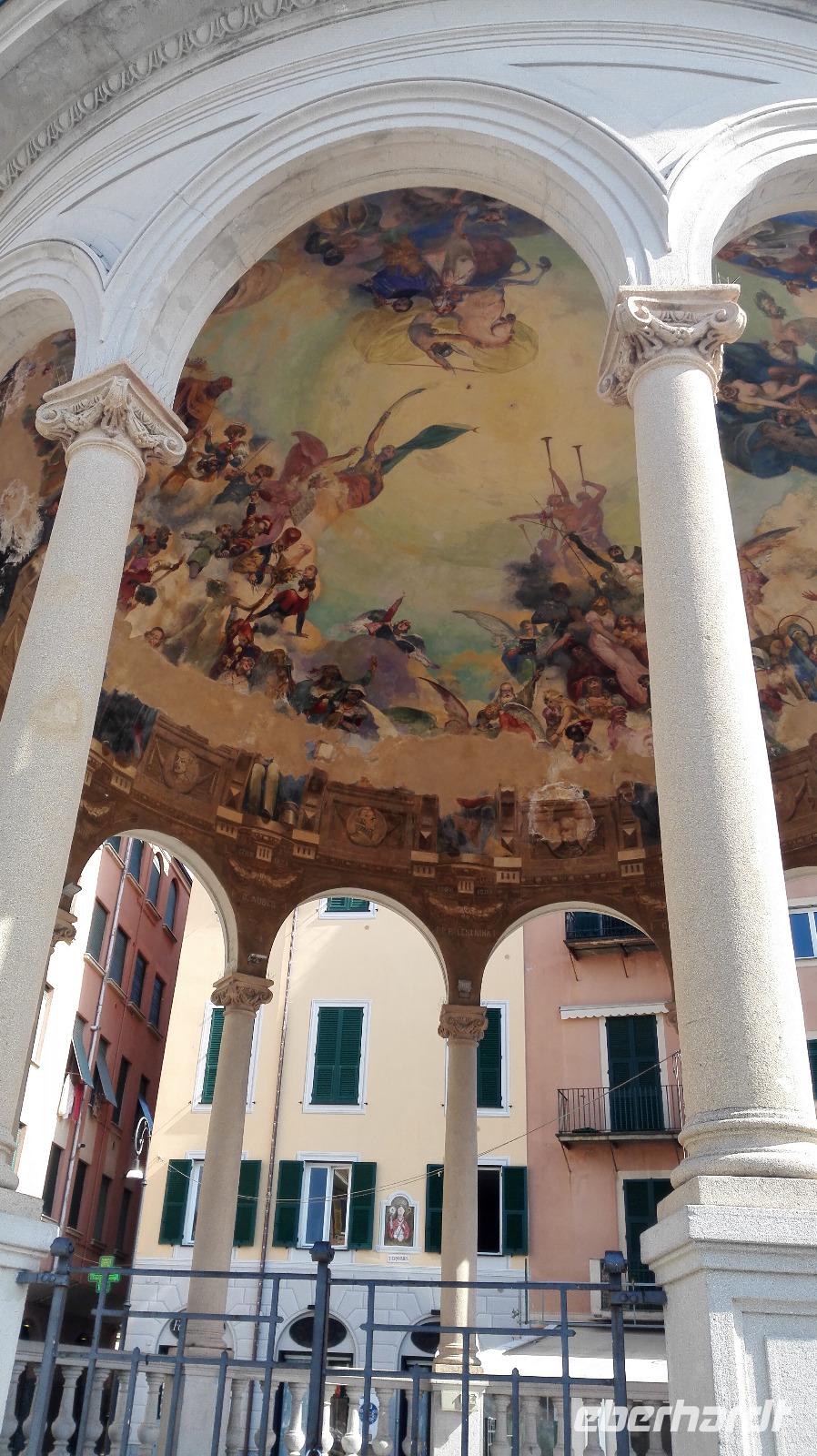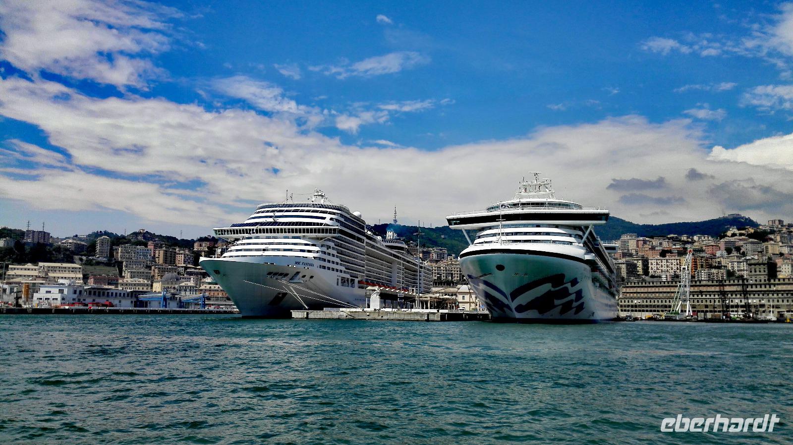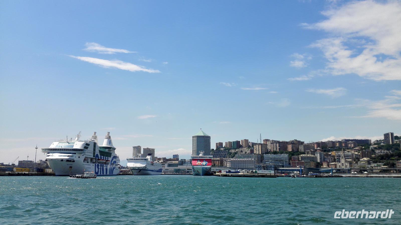 Gemeinsam stärken wir uns am heutigen Pfingstsonntag beim Frühstück vom Buffet im Hotel, bevor wir erneut durch die zahlreichen Tunnel nach Genua fahren. Dort angekommen, huscht Vittoria unsere Stadtführerin kurz in den Bus und schon lauschen wir bei einer Rundfahrt ihren interessanten Erzählungen. Am Hafen steigen wir aus und gehen gemeinsam mit Vittoria zu Fuß weiter. Viele Menschen sind hier am heutigen Sonntag unterwegs - Ein Sportfest findet am Hafen statt und die beiden großen Kreuzfahrtschiffe „Sapphire Princess" und „MSC Fantasia" liegen im Hafen. Nach unserem gemeinsamen Rundgang konnte sich jeder besser orientieren und so machten alle im Anschluss das, worauf sie gerade Lust hatten - durch die Gässchen bummeln, eine Kleinigkeit zu Mittag essen oder im Hafen an der Uferpromenade entlang flanieren. Am Nachmittag trafen wir uns wieder zu einer Rundfahrt mit dem Schiff durch den größten und wichtigsten Hafen des Mittelmeeres. Ganz schön zugig ging es zu auf dem Schiff, der eine oder andere Hut verabschiedete sich! Zurück im Hotel genossen wir wieder ein gemeinsames Abendessen und schwatzten fröhlich über diesen gelungenen Tag bei herrlichem Wetter!