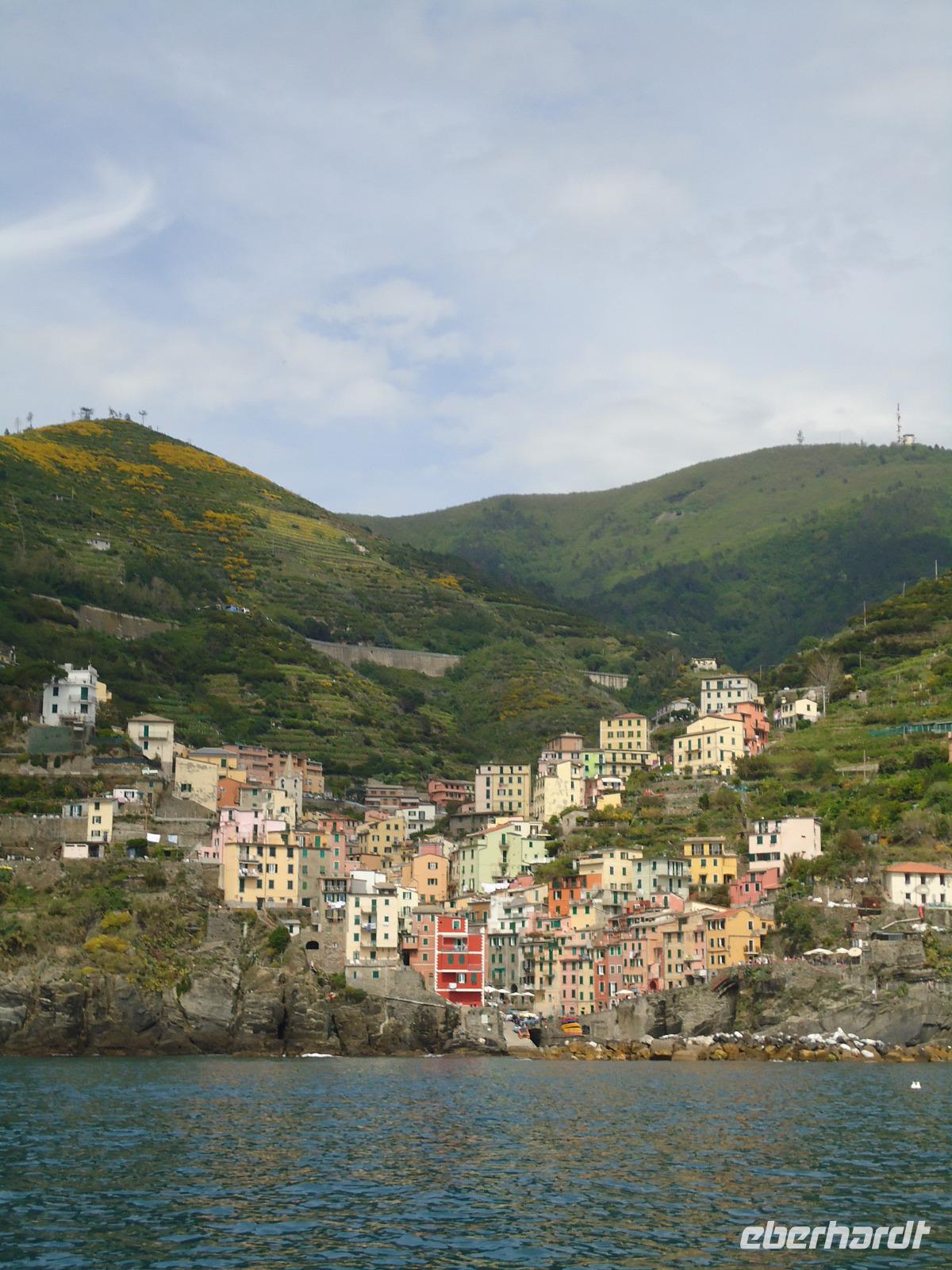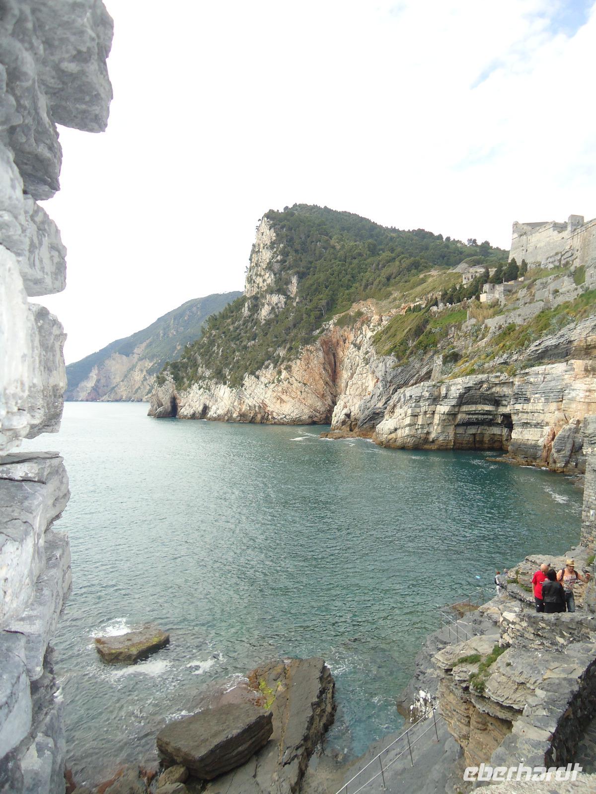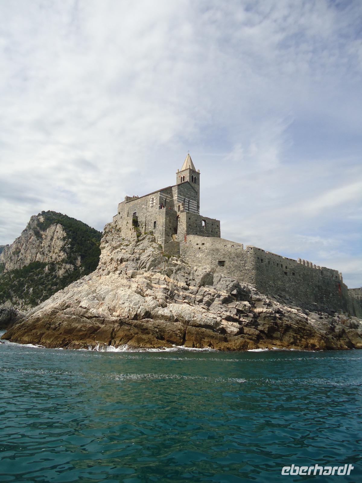 Vom Wasser her zeigt sich der Küstenabschnitt zwischen Monterosso (er ist übrigens der einzige Ort der Cinque Terre, der über einen Badestrand verfügt) und Riomaggiore, wie wir ihn uns immer vorgestellt haben bzw. von zahlrichen Bildern her kennen. Adlerhorsten gleich scheinen die Dörfer mit ihren bunten zusammengewachsenen Häusern an der Felsküste zu kleben, umrahmt von terrassenartig angelegten Weinhängen. Wir saugen diese einzigartige Landschaft auf, lassen uns die mitunter etwas kühle Brise um die Ohren wehen und sind gespannt wie sich uns Portovenere, der nach der Göttin Venus benannte Ort, wohl präsentieren wird.