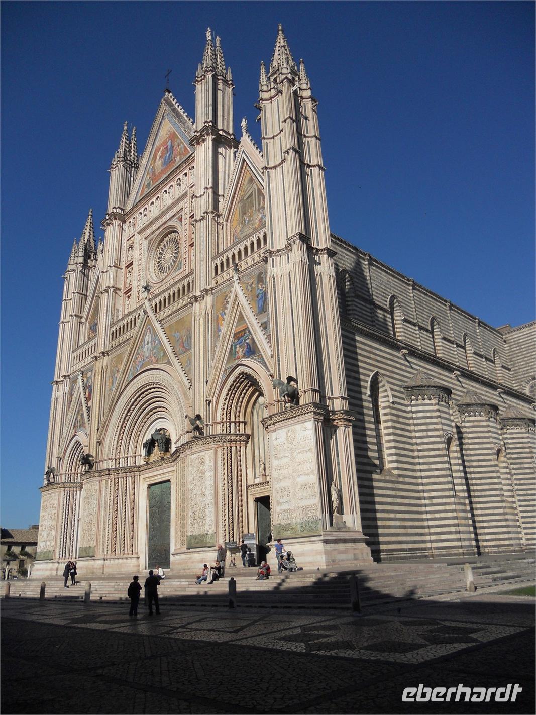 Am 2. Tag der Anreise führte die Fahrt durch die Po-Ebene der Emilia-Romagna, die Toscana und weiter nach Umbrien, mit Zwischenaufenthalt in Orvieto. Ein malerischer Ort, wie ein Adlerhorst wurde er hoch oben auf einem Bergmassiv errichtet. Wir fahren mit der Standseilbahn in wenigen Minuten nach oben und werden dann von unserer örtlichen Stadtführerin charmant und sachkundig durch den Ort geführt. Besonders beeindruckend ist der riesige Dom, ein Meisterwerk der gotischen Steinmetzkunst. Wieder zurück am Bus, haben wir noch das letzte Tagesstück durch Latium und den Autobahn-Stadtring von Rom bis ins südliche Marino vor uns. Unser Hotel ist traumhaft gelegen, wir schauen auf die erleuchtete Stadt Rom zu unseren Füßen.