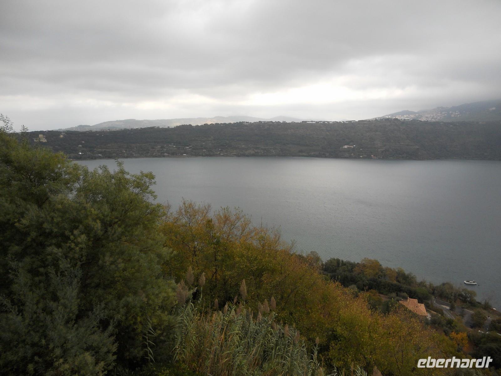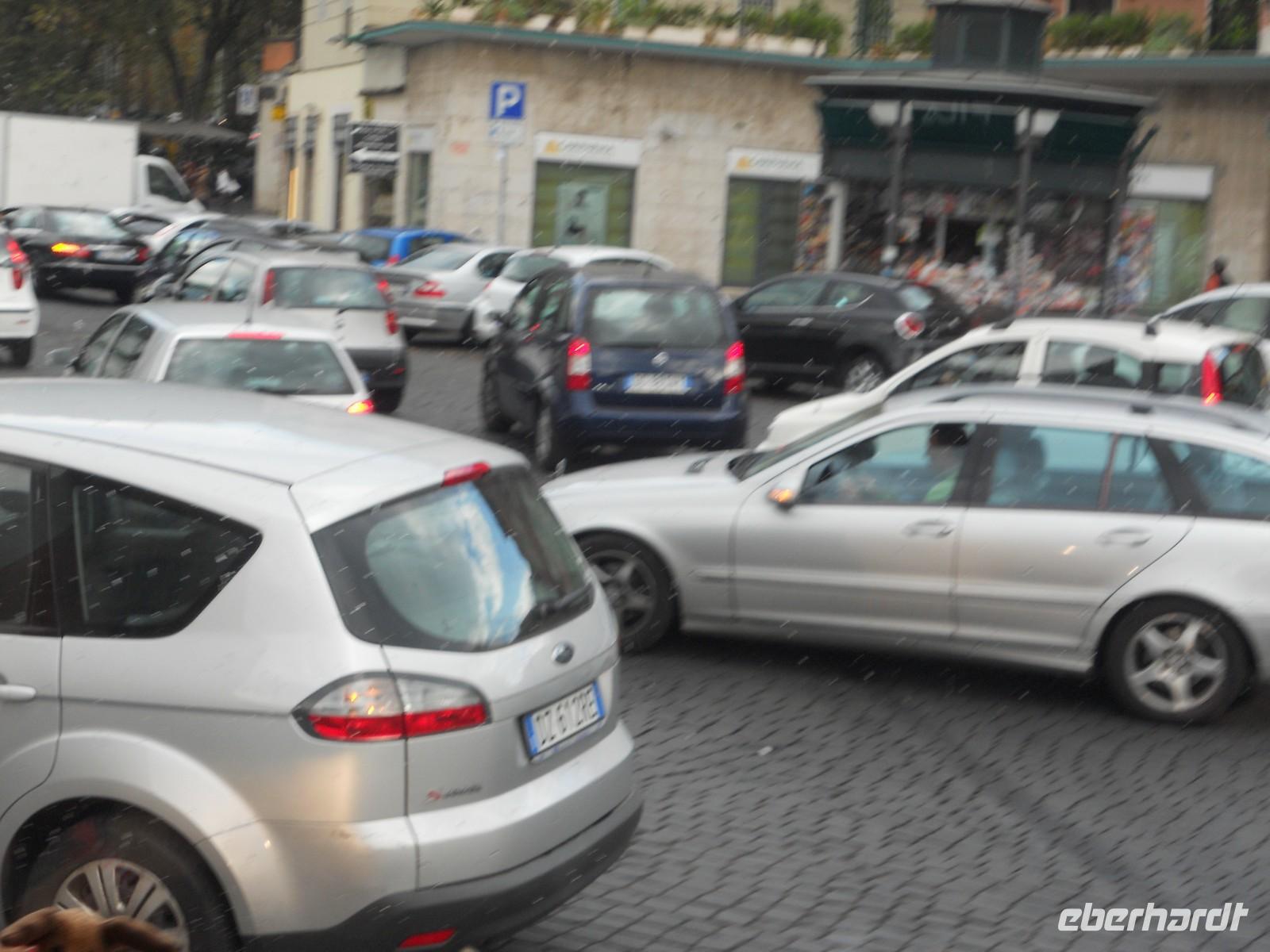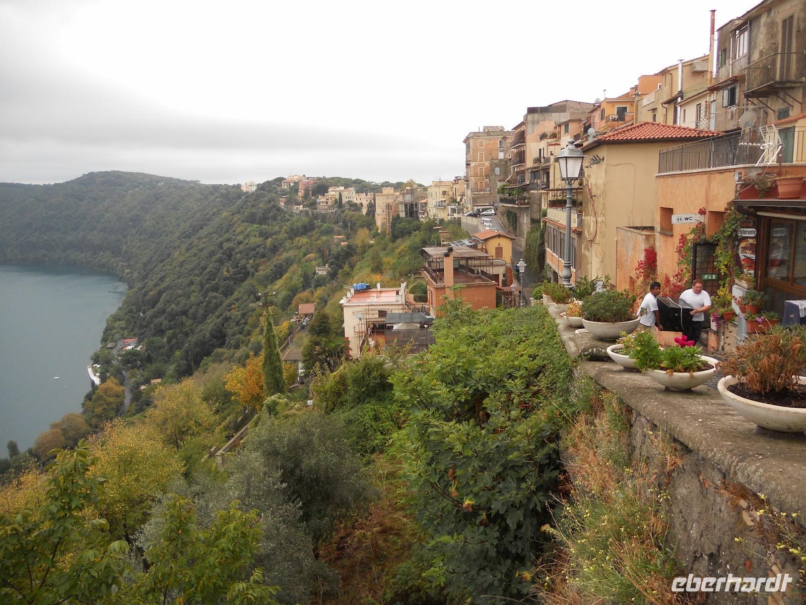 Über Nacht gab es Regen, am Morgen sah es wieder ganz gut aus, doch schon bald hing der Himmel voller Gewitterwolken. Wir hatten die Ausgrabungsstätte von Ostia, der antiken Hafenstadt 30 km südlich von Rom, auf dem Programm. Bis zum Stadtring von Rom ging es bereits nur schleppend, aber das war uns ja schon bekannt. Doch der Regen wurde immer stärker, das Verkehrschaos ebenfalls, und bald sahen wir die ersten Straßen unter Wasser. Unsere beiden örtlichen Reiseleitungen für Ostia steckten in Rom fest, und meldeten von dort: Rom unter! Und auch in Ostia stand das Wasser in den Straßen. Das gesamte Ausgrabungsgelände wurde für Besucher gesperrt. Uns blieb nur der Weg in die Albaner Berge, anfangs noch entlang der Küstenstraße bis Anzio. Dann fuhren wir nach Castelgandolfo, dem kleinen Ort mit Sommerresidenz des Papstes. Der Regen hatte aufgehört, und so konnten wir noch den Ausflug nach Rocca di Papa fortsetzen. Abenteuerliche Rückfahrt durch teils sehr beengte Straßen aber mit wunderbaren Ausblicken in diese Berglandschaft. Ein ungewöhnlicher aber erlebnisreicher Tag geht zu Ende.