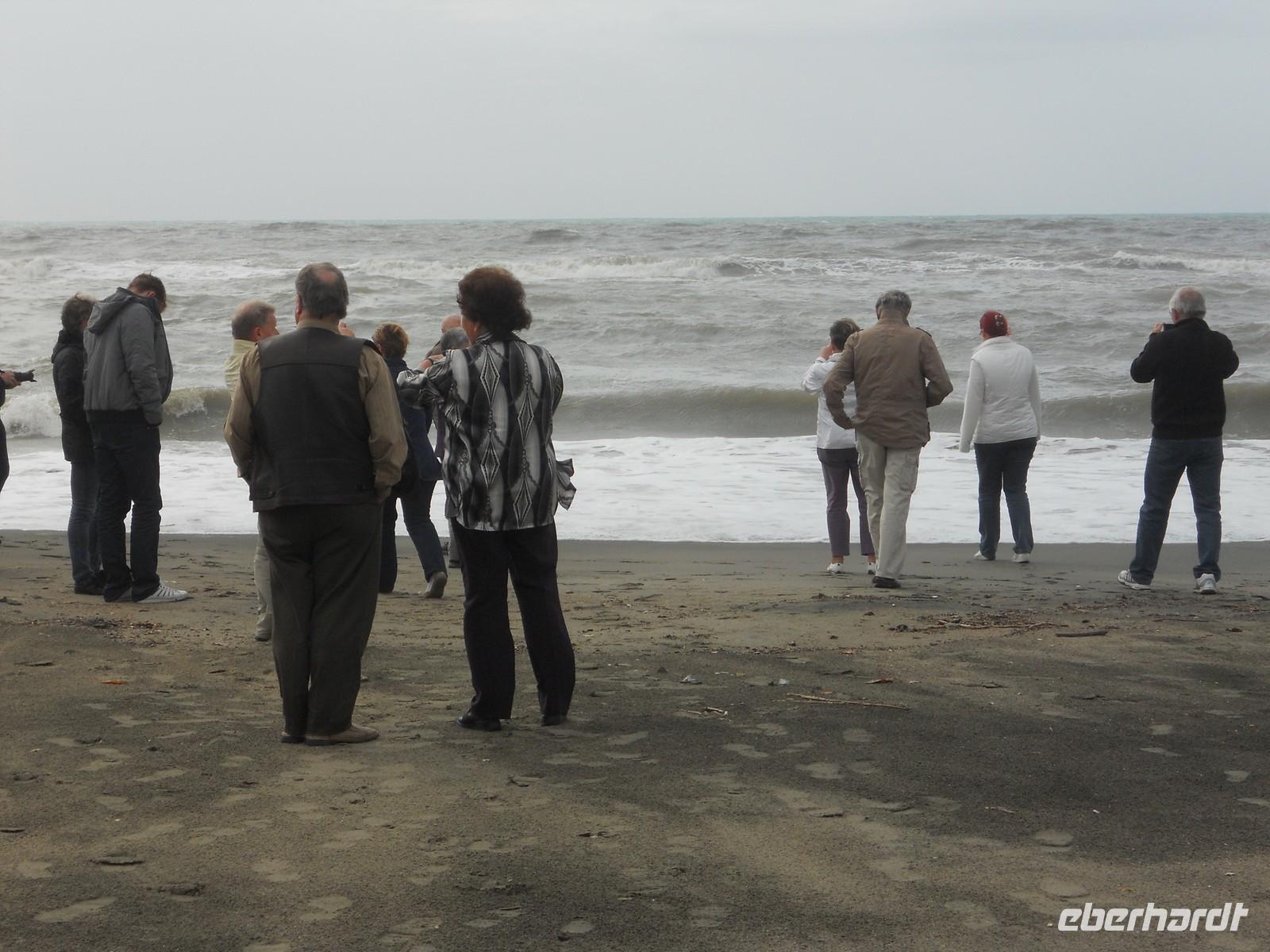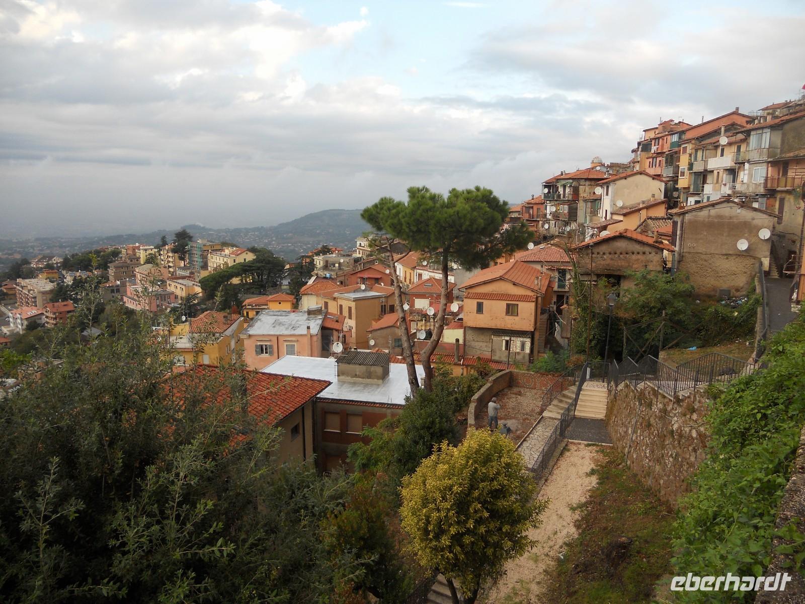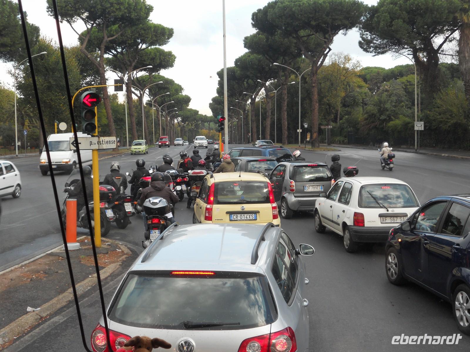 Über Nacht gab es Regen, am Morgen sah es wieder ganz gut aus, doch schon bald hing der Himmel voller Gewitterwolken. Wir hatten die Ausgrabungsstätte von Ostia, der antiken Hafenstadt 30 km südlich von Rom, auf dem Programm. Bis zum Stadtring von Rom ging es bereits nur schleppend, aber das war uns ja schon bekannt. Doch der Regen wurde immer stärker, das Verkehrschaos ebenfalls, und bald sahen wir die ersten Straßen unter Wasser. Unsere beiden örtlichen Reiseleitungen für Ostia steckten in Rom fest, und meldeten von dort: Rom unter! Und auch in Ostia stand das Wasser in den Straßen. Das gesamte Ausgrabungsgelände wurde für Besucher gesperrt. Uns blieb nur der Weg in die Albaner Berge, anfangs noch entlang der Küstenstraße bis Anzio. Dann fuhren wir nach Castelgandolfo, dem kleinen Ort mit Sommerresidenz des Papstes. Der Regen hatte aufgehört, und so konnten wir noch den Ausflug nach Rocca di Papa fortsetzen. Abenteuerliche Rückfahrt durch teils sehr beengte Straßen aber mit wunderbaren Ausblicken in diese Berglandschaft. Ein ungewöhnlicher aber erlebnisreicher Tag geht zu Ende.