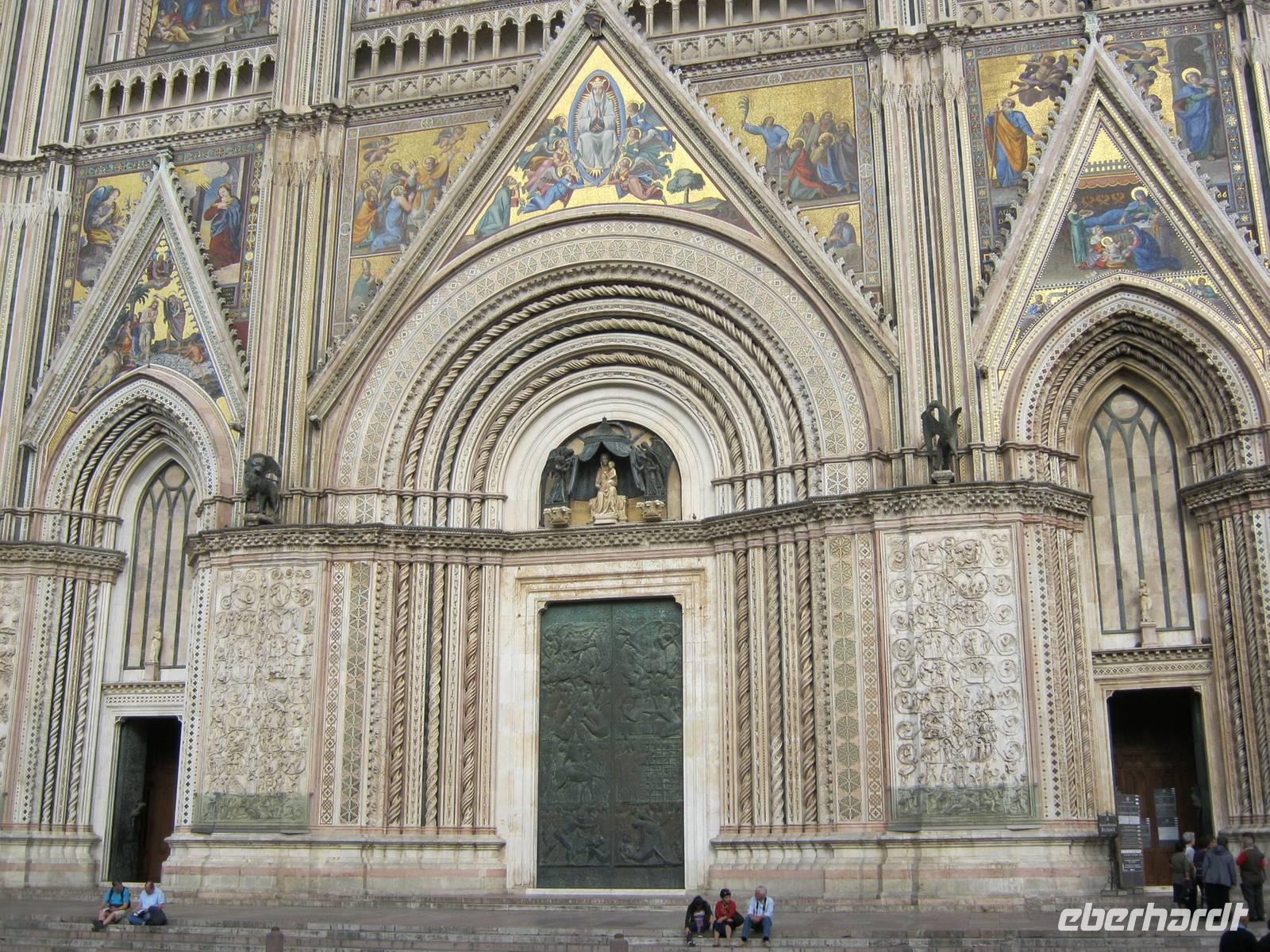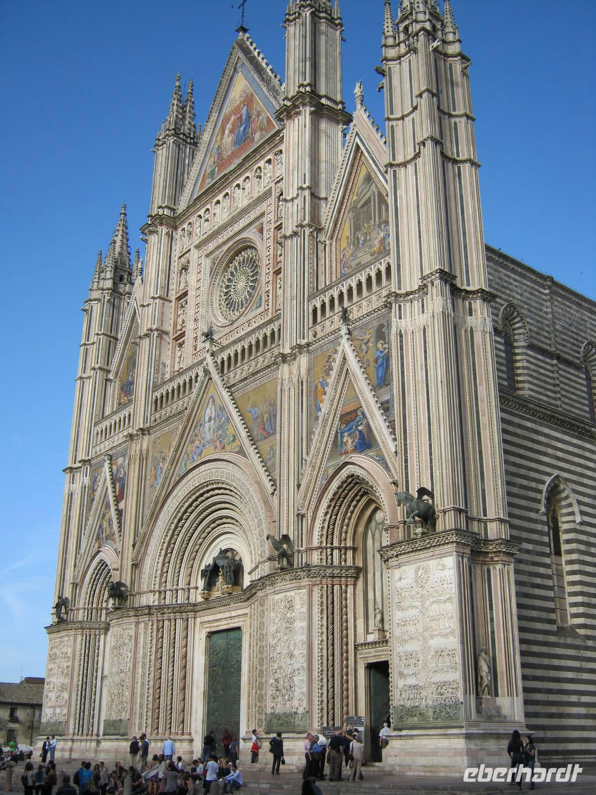 Doch schön der Reihe nach: durch Bayern, an München vorbei und schließlich den Inn aufwärts - die Tiroler Grenzfestung Kufstein passierten wir ganz ohne Schwierigkeiten - von Innsbruck aus unter dem legendären Berg Isel mit seiner neuen Sprungschanze und dem alten „Andreas-Hofer - und Tiroler-Kaiserjäger-Museum" hindurch, über die Europa-Brücke (deren Rastplatz diesmal so voll war, dass wir nicht parken konnten, um uns ein Stück der alten Römerstraße anzuschauen) ging es über den Brenner (die klassische Route!) hinüber nach Südtirol, heute autonome Region Italiens. Das Eisack-Tal abwärts durch die „Sachsenklemme" und vorbei an der mächtigen Franzensfeste, ab Bozen die Etsch entlang und schließlich von Rovereto über einen kleinen Pass ins parallele Tal, wo sich von Nago aus zum ersten Mal der überaus romantische Blick auf den Gardasee bot. Schließlich zur ersten Zwischenübernachtung in den von den pittoresken Ruinen der Skaliger-Burg überragten traditionsreichen Kurort Arco. Am nächsten Morgen das (um diese Jahreszeit) beschauliche Ostufer des vielbesungenen Gardasees hinab, an Verona, der Stadt von Romeo und Julia, vorbei, um in Vigasio noch Gäste aufzunehmen. Über die behäbige und reiche Fruchtebene der Emilia-Romagna, vorbei an Bologna, der Heimstatt einer der ältesten Universitäten Europas, durch den nördlichen Apennin, quer durch das Tal des Arno - Florenz querab, dessen Kuppel des Domes von weitem grüßte - bis hin zu dem auf einem von Kellern und Gängen durchzogenen Tuffsteinplateau thronenden Orvieto, wo Marco - mal dramatisch, mal ganz leise - für uns den Marmor an der Domfassade zum Reden brachte. Es wurde dann ein bisschen später bis wir in unserem Hotel in der Via Appia Nuova ankamen, einer modernen Parallele zur alten hochberühmten und ersten römischen Fernstraße.