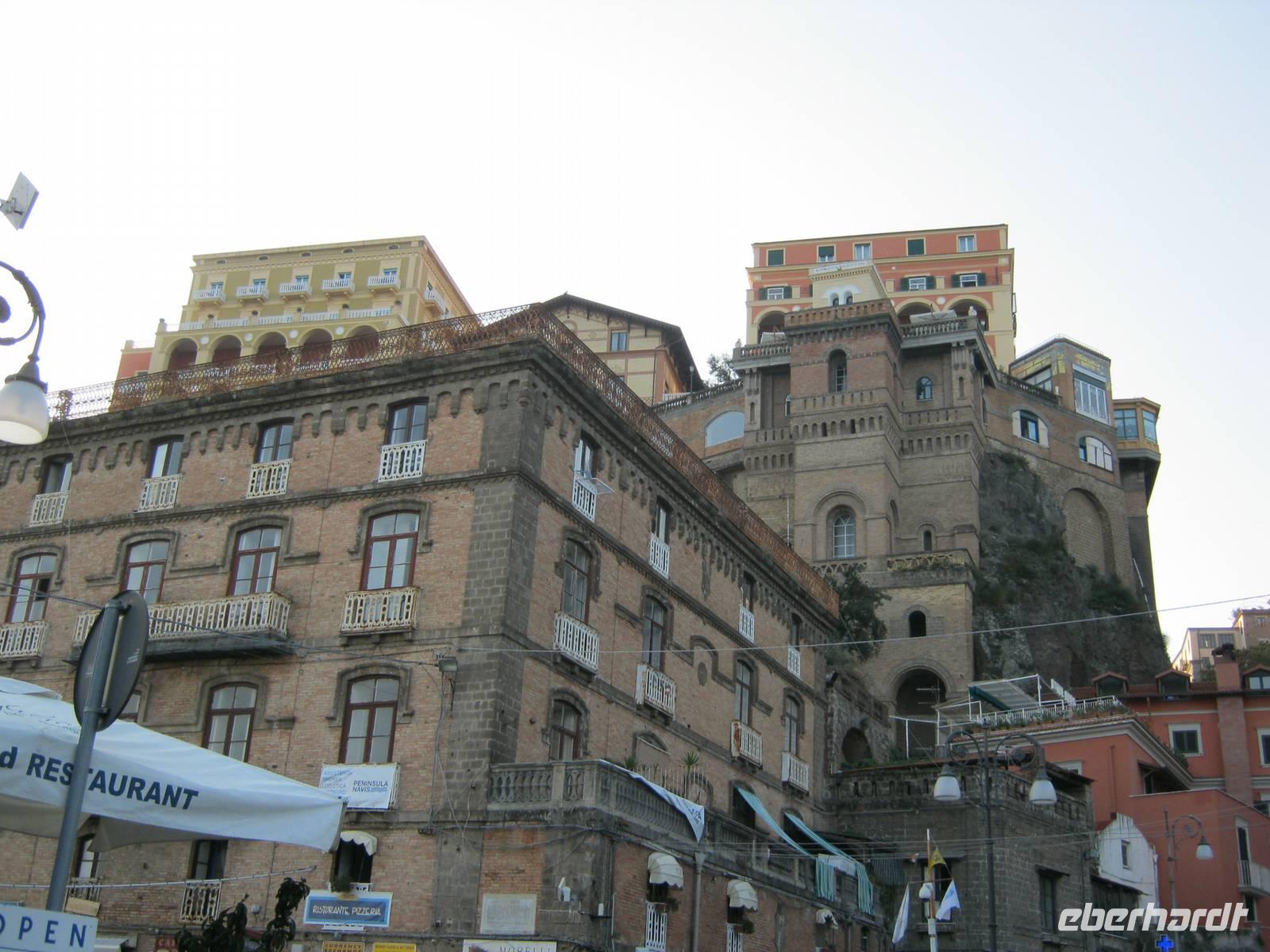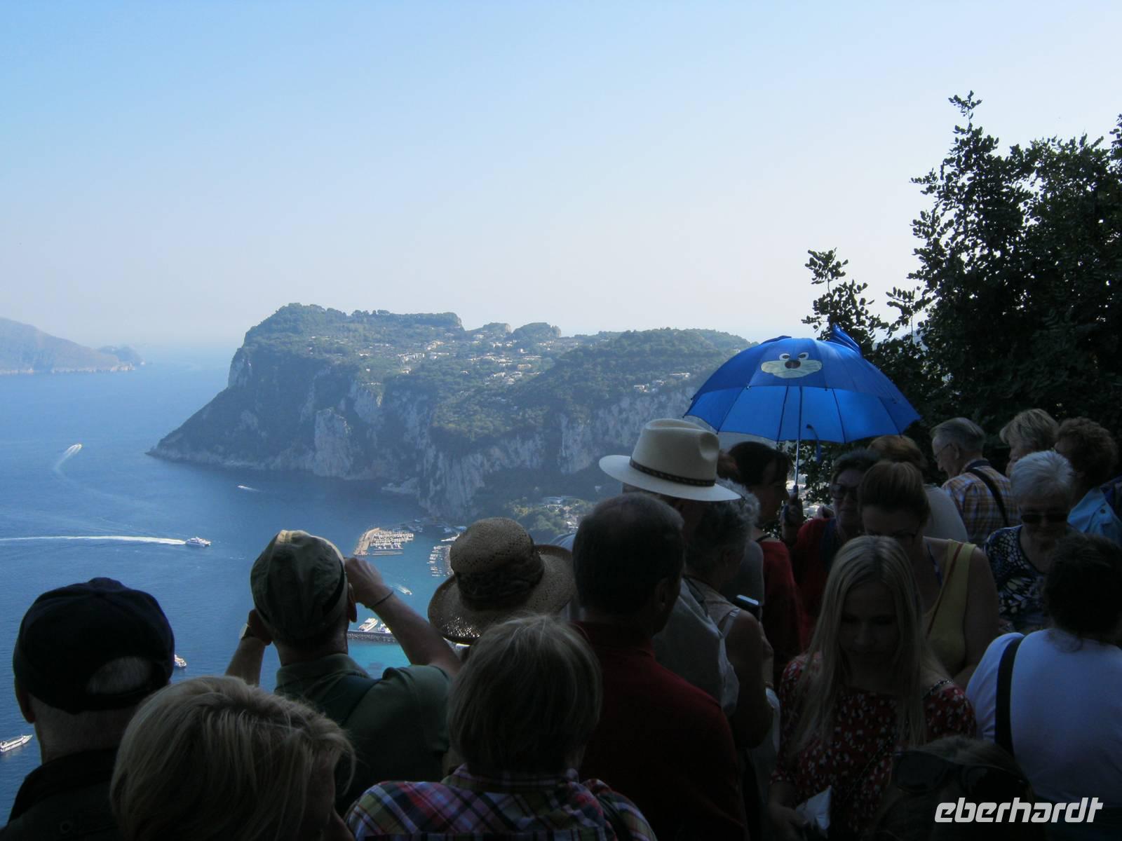 Durch die romantischen Milchberge ging es in schwindelerregenden Serpentinen hinauf nach Agerola, wo das Grand Hotel Sant' Orsola für die nächsten Tage unser Domizil sein sollte. Es liegt ein paar hundert Meter oberhalb des Anwesens von Sofia Loren, für die ich schon von Jugend an schwärme. Der unvergleichliche Stefano hat uns schon vor der Tür empfangen und alles getan, damit unser Aufenthalt rundherum zum Genuss wurde. Dass wir in seinem Hause einen veritablen Sturm erlebten, dessen Folgen sogar die Zufahrtsstraße in Gefahr brachten, dafür konnte er nichts, aber es war ein veritables Naturschauspiel. Glücklicherweise hatten wir für unseren fakultativen Ausflug nach Sorrent und Capri noch schönes Wetter, so dass wir auch mit einem kleinen Schiff eine Rundfahrt um die Insel machen konnten, bei der wir all die Attraktionen wie die diversen Grotten und die Faraglioni von der Wasserseite aus nächster Nähe sahen. Dann ging es in sausender Fahrt mit den speziellen Inselbussen hinauf zunächst nach Anacapri, wo es neben der Villa Munthe noch Limoncello zu kosten gab. Wer wollte konnte mit dem Lift noch höher hinaus auf den Monte Solaro. Der Hauch von Mondänität umweht Capri noch immer, auch wenn tagsüber ganze Massen von Touristen sich auf der Insel drängen.