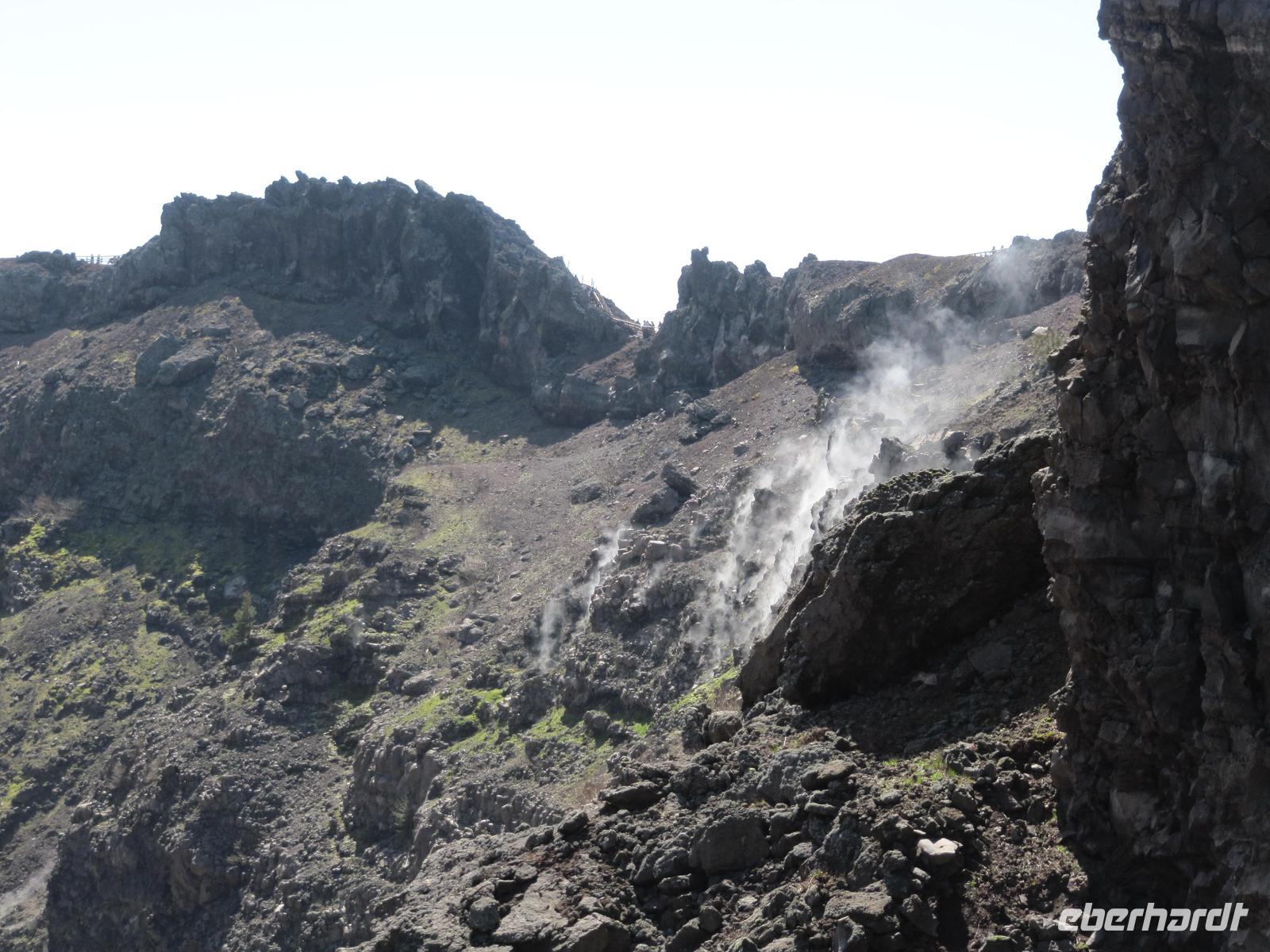Unser Weg führt uns heute weiter in den Süden, nach Kampanien. Zuerst geht es auf den Vesuv. Die Auffahrt auf 1017 m Höhe ist schon ein Erlebnis. Das Wetter ist ideal und wir haben einen traumhaften klaren Blick auf den Golf von Neapel. Alle Gäste wandern auf den Vulkan, um einen Blick in den Krater zu werfen und der Vulkan stößt heute viele Dämpfe aus.