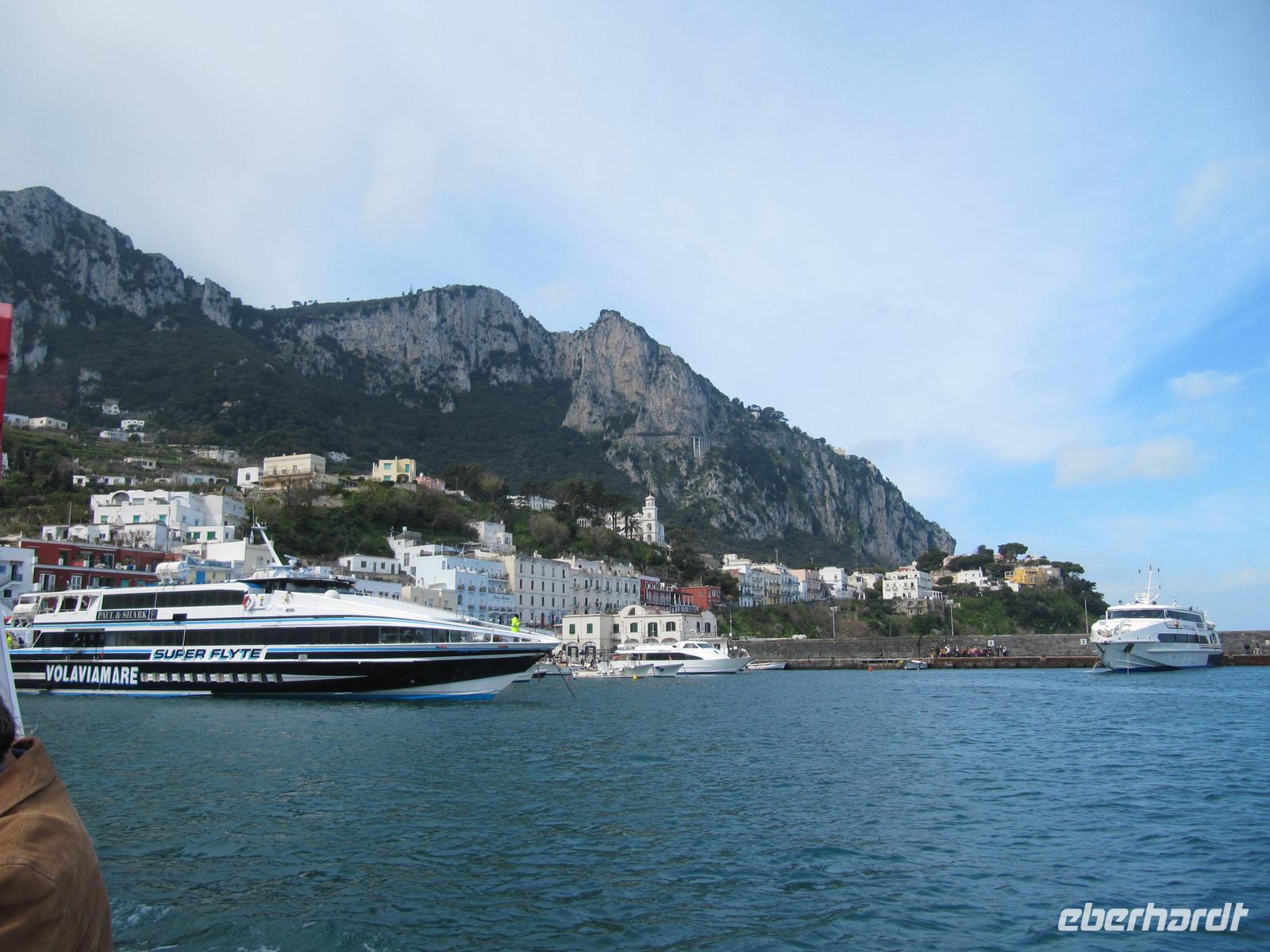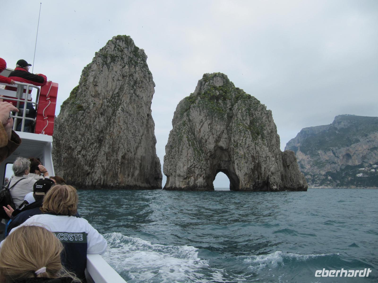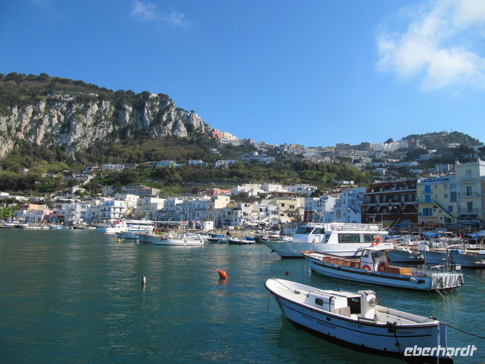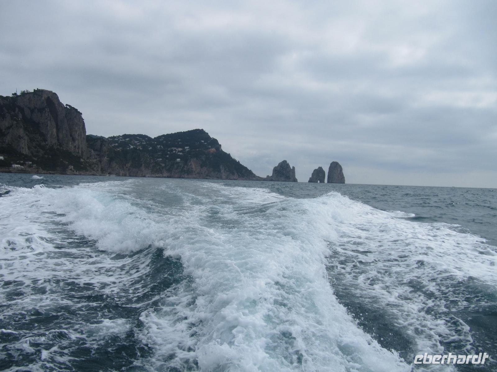 Heute müssen wir früh aufstehen und Roy bringt uns nach Sorrent. Mit unserer Insel-Führerin Dagy geht es mit dem Schiff nach Capri. Wir besteigen gleich das nächste Schiff und machen eine Bootstour um die Insel. Vom Meer aus kann man erst so richtig die Schönheit der Insel entdecken, die Kalksteinfelsen, die Grotten mit ihren orangefarbenen Korallen. Wir bewundern die verschiedenfarbigen Blautöne des Meeres! Mit einem Elektrobus fahren wir dann hinauf nach Anacapri. Dagy gibt uns Informationen, was man so alles tun kann. Zum Aussichtspunkt an der Villa Munthe spazieren, um einen Blick über die Insel Capri zu werfen und die Villa besichtigen. Manche nehmen mit Dagy in der Mittagspause ein kleines Mahl ein. Viele probieren die Spezialitäten der Insel, Zitronenlikör, Zitronengrappa, Zitronenschokolade... Einige Gäste fahren mit dem Sessellift auf den Monte Solaro, leider liegt der Gipfel heute in den Wolken. Aber auch die Auffahrt macht Spaß und man kann bis zur Insel Ischia blicken.