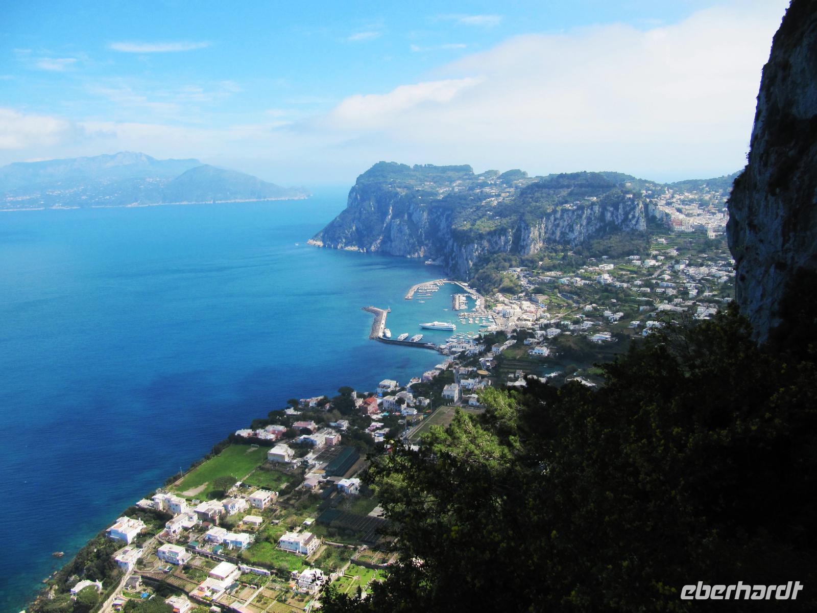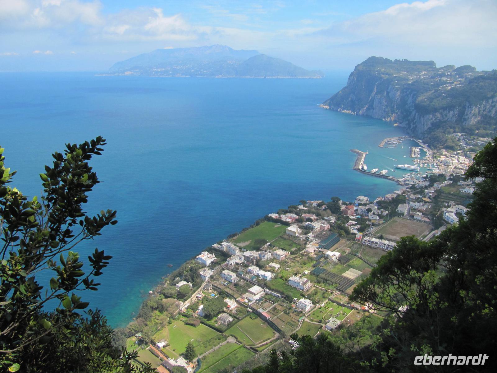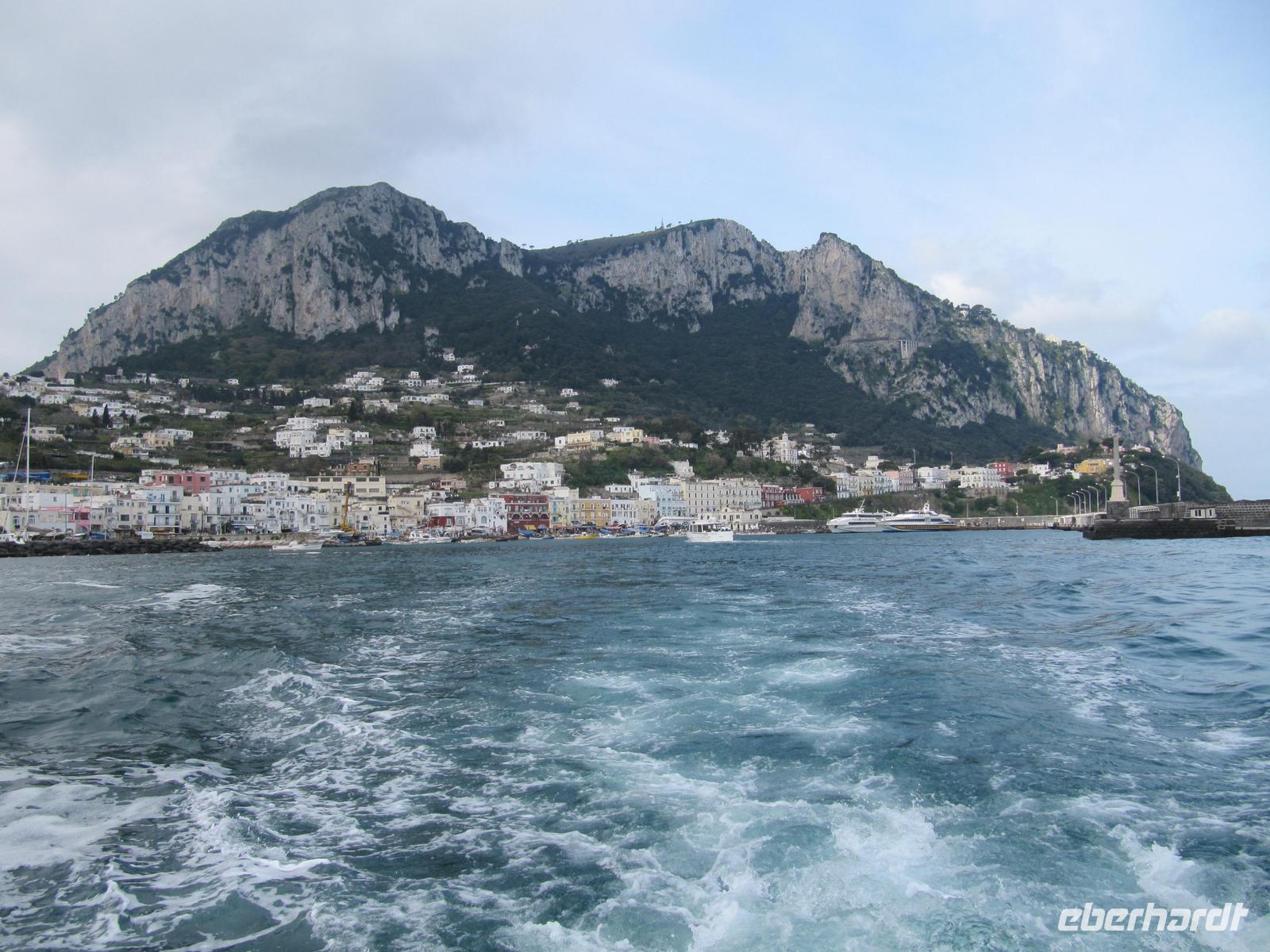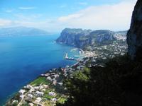 Heute müssen wir früh aufstehen und Roy bringt uns nach Sorrent. Mit unserer Insel-Führerin Dagy geht es mit dem Schiff nach Capri. Wir besteigen gleich das nächste Schiff und machen eine Bootstour um die Insel. Vom Meer aus kann man erst so richtig die Schönheit der Insel entdecken, die Kalksteinfelsen, die Grotten mit ihren orangefarbenen Korallen. Wir bewundern die verschiedenfarbigen Blautöne des Meeres! Mit einem Elektrobus fahren wir dann hinauf nach Anacapri. Dagy gibt uns Informationen, was man so alles tun kann. Zum Aussichtspunkt an der Villa Munthe spazieren, um einen Blick über die Insel Capri zu werfen und die Villa besichtigen. Manche nehmen mit Dagy in der Mittagspause ein kleines Mahl ein. Viele probieren die Spezialitäten der Insel, Zitronenlikör, Zitronengrappa, Zitronenschokolade... Einige Gäste fahren mit dem Sessellift auf den Monte Solaro, leider liegt der Gipfel heute in den Wolken. Aber auch die Auffahrt macht Spaß und man kann bis zur Insel Ischia blicken.