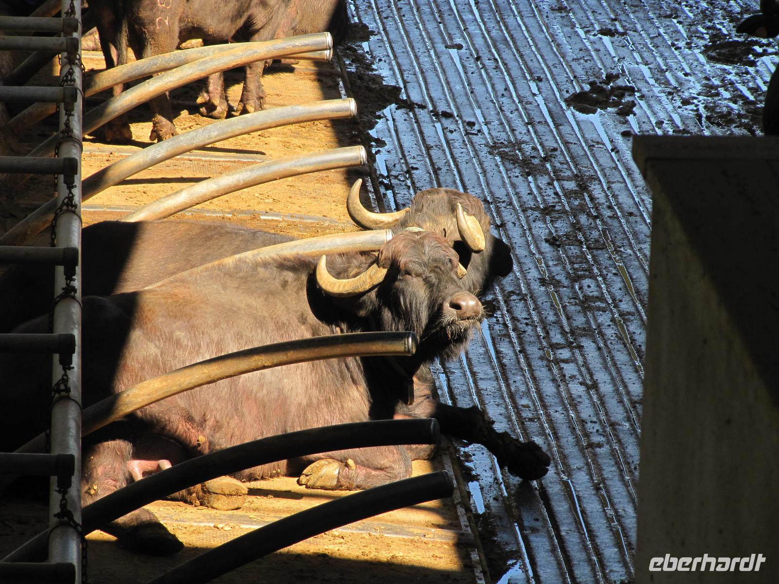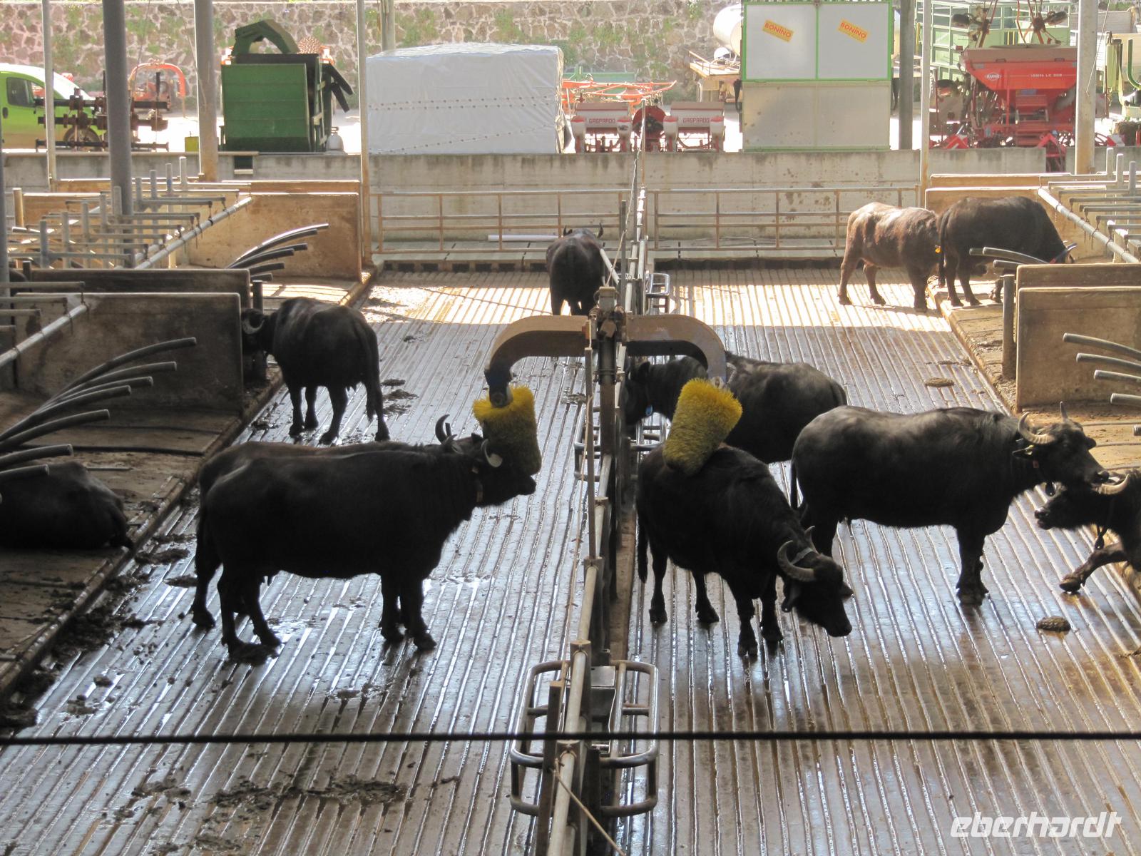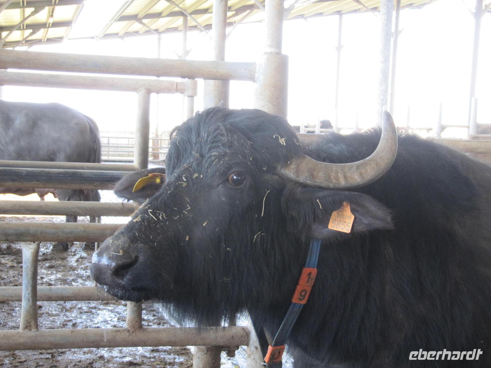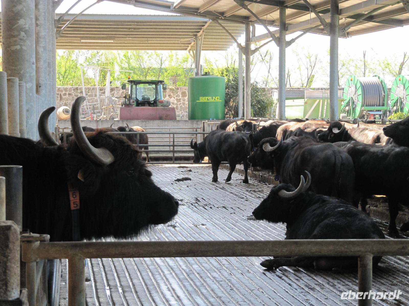 Über Castellamare fahren wir auf der Autobahn nach Salerno und machen erst mal einen Fotostopp über Salerno, um die letzte Strecke der Amalfitana zu sehen. Weiter geht es nach Paestum, ins nördliche Cilento. Dort treffen wir Angelo wieder. Zuerst besuchen wir die Büffelfarm Vanullo. Seit 1996 werden hier in biologischer Produktion feinste Büffelmozzarella, Ricotta und Joghurt hergestellt. In der kleinen Käserei können wir sehen, wie die Masse mozzare-gezupft wird. Und wir dürfen natürlich die echte frische Büffel-Mozzarella kosten, schneeweiß, mit nussigem, saftigem Geschmack. Auch ein Joghurt wird von Eberhardt spendiert.