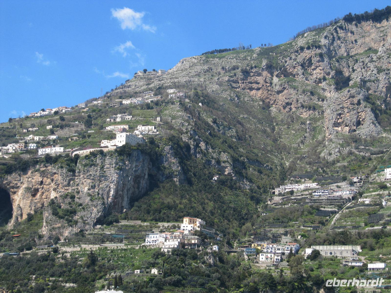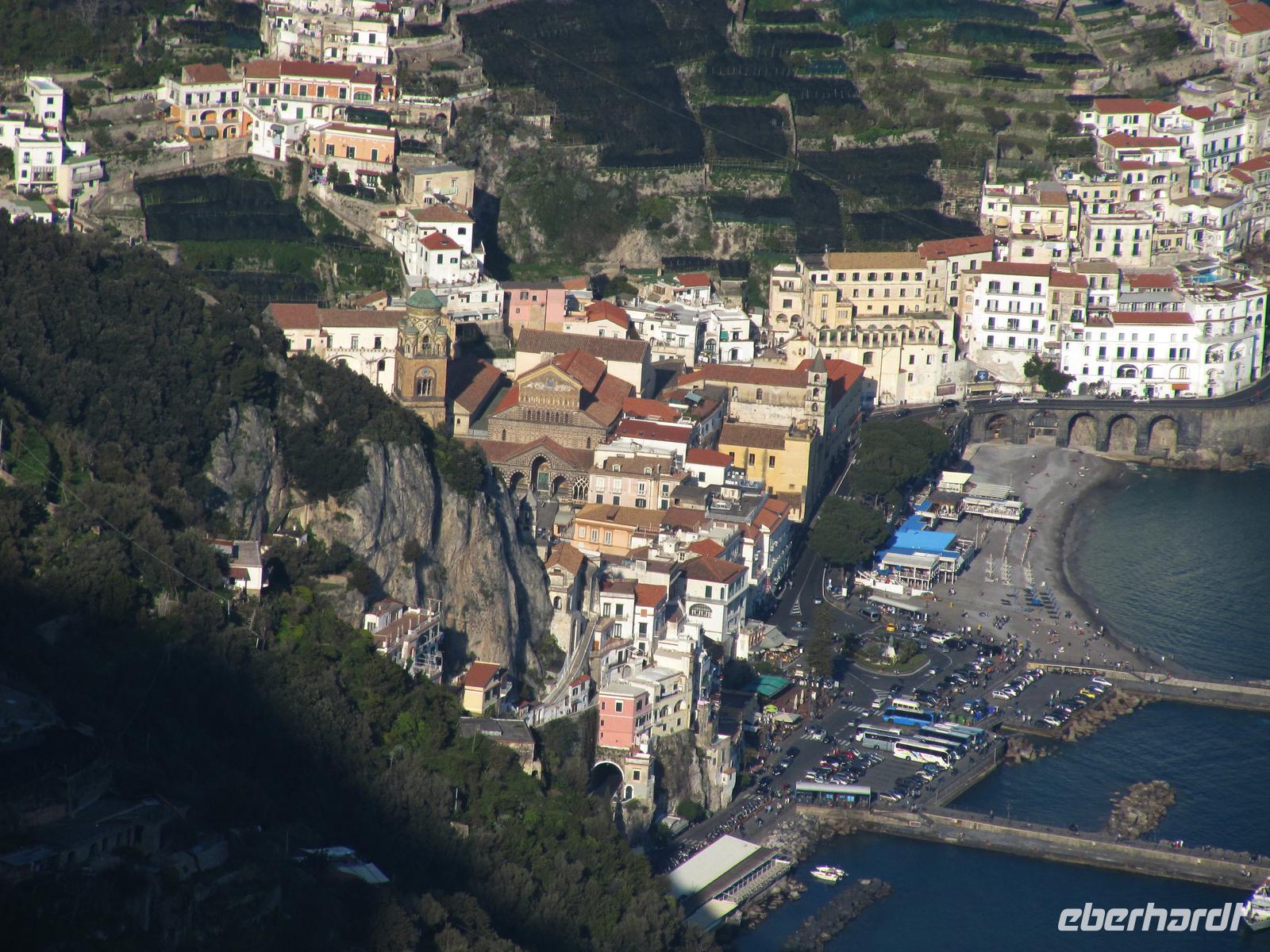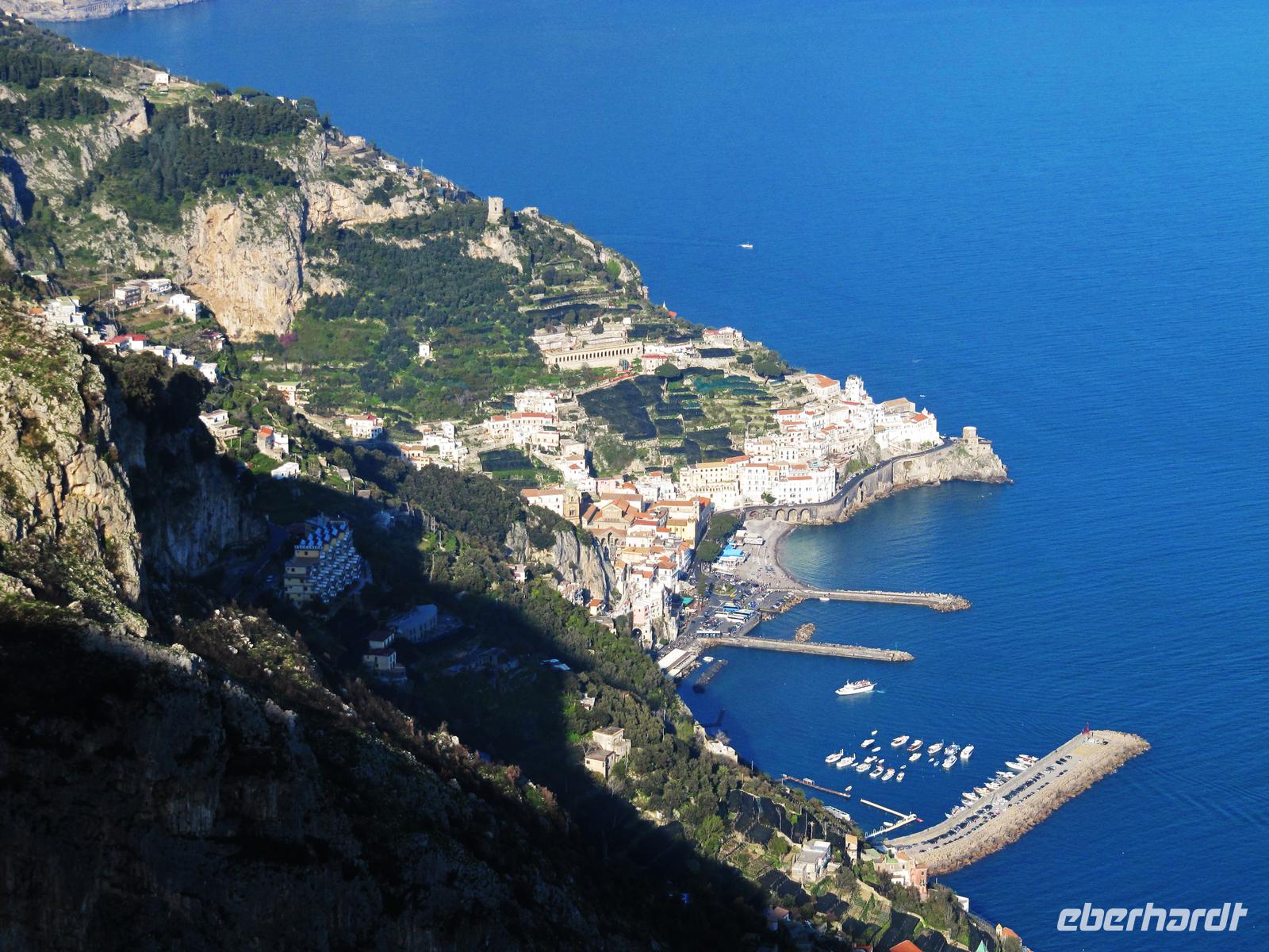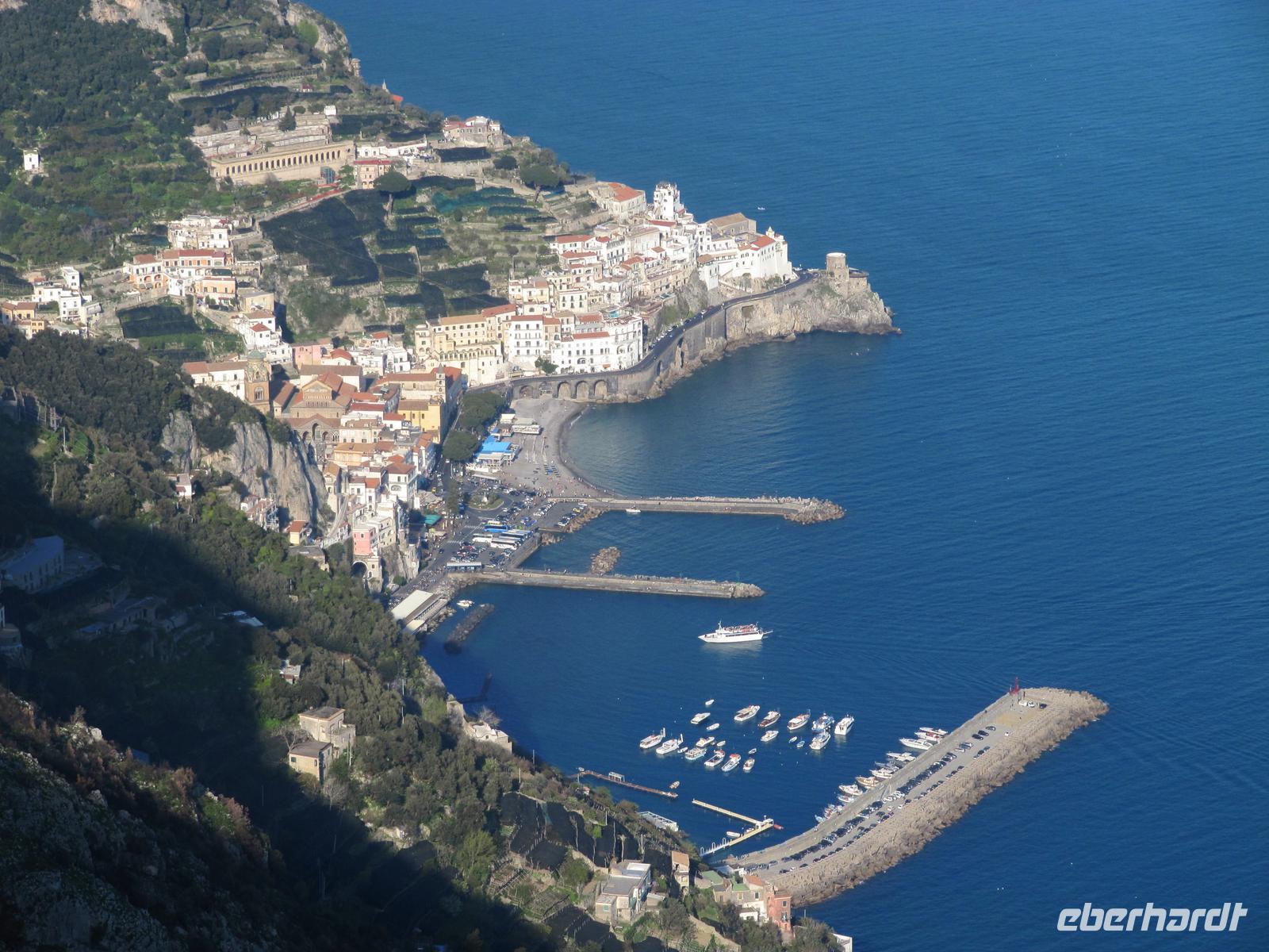 Mit einem italienischen Bus fahren wir mit Petra über Sorrent an die Amalfiküste. Zuerst ein Fotostopp am Golf von Sorrent! Auf einer engen Straße fahren wir an der Costa Divina, der Göttlichen Küste, zwischen Meer und Berg auf einer der bekanntesten Traumstraßen der Welt. Wir schauen auf die Galli-Inseln und auf das berühmte idyllische Örtchen Positano. In Amalfi hat uns Petra eine Bootstour entlang der Küste um Amalfi organisiert. Vom Meer aus können wir die Steilküste erst so richtig bewundern. Die Höhlen, die Vegetation, architektonische Kostbarkeiten, Villen berühmter Leute, das bekannte Ravello, und wir entdecken sogar unser Hotel oben auf der Steilküste. Petra bringt uns zum bekannten Dom von Amalfi, und zeigt uns ein kleines Straßencafe, wo man eine Kleinigkeit essen kann. Wir können den Dom Sant Andrea mit seinem schönen Kreuzgang und den Gebeinen des Heiligen besichtigen oder einige Souvenirs einkaufen.