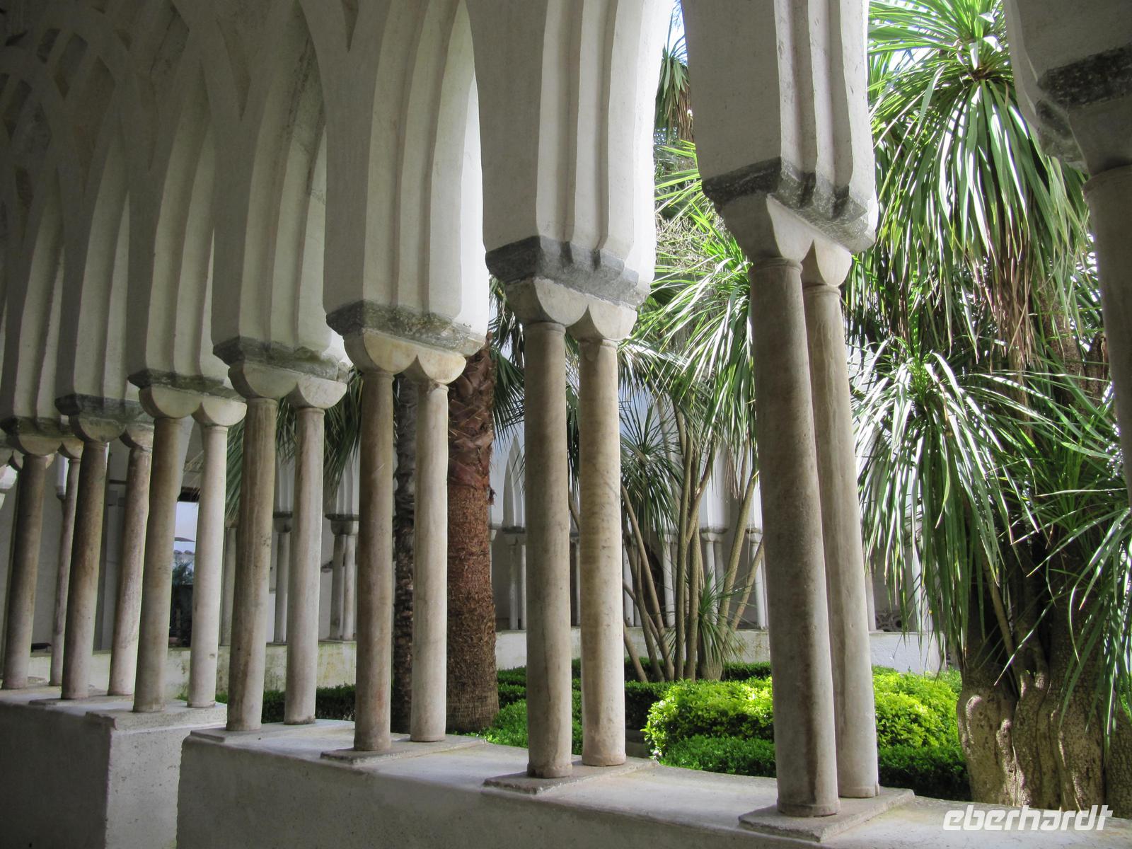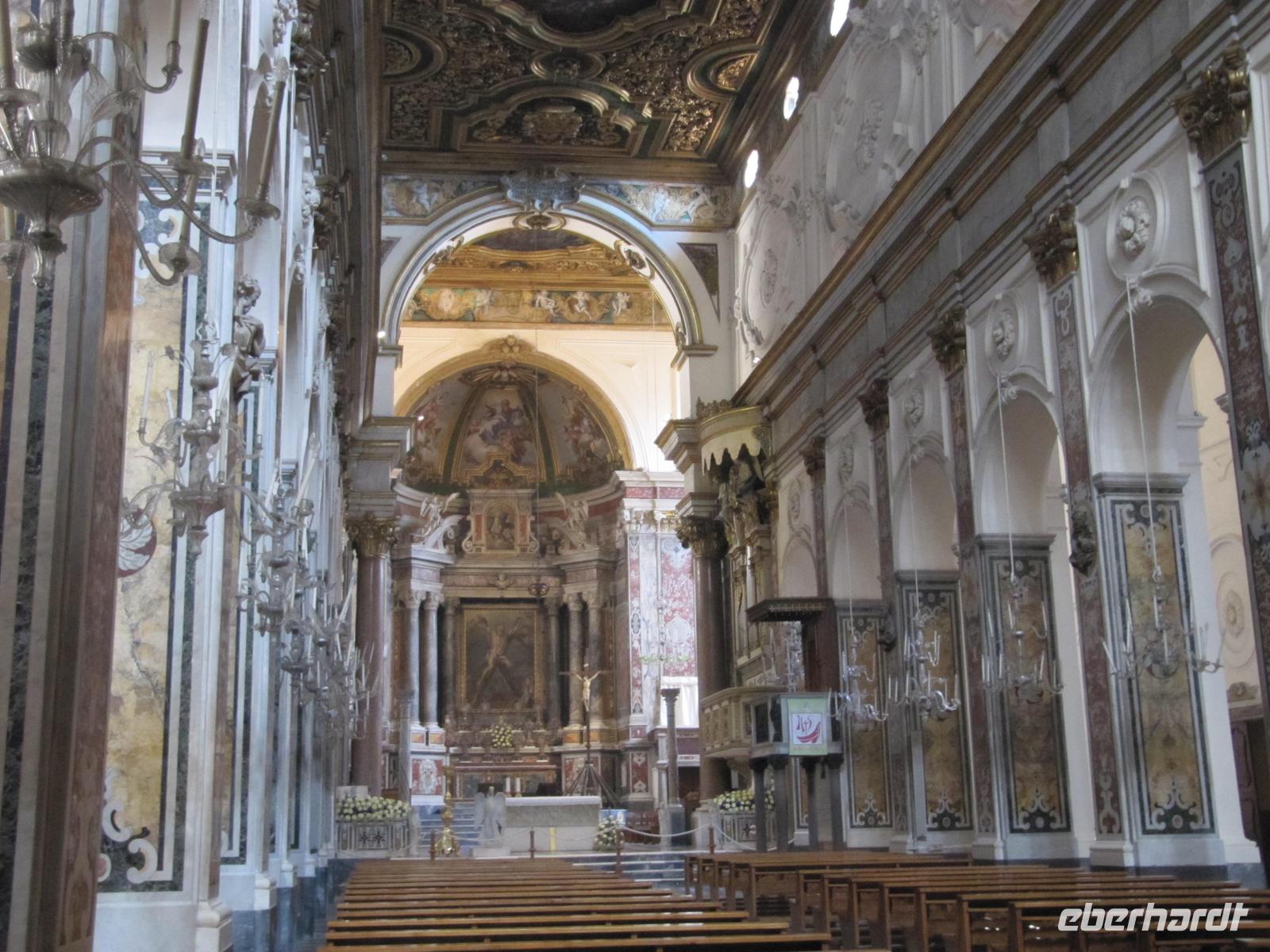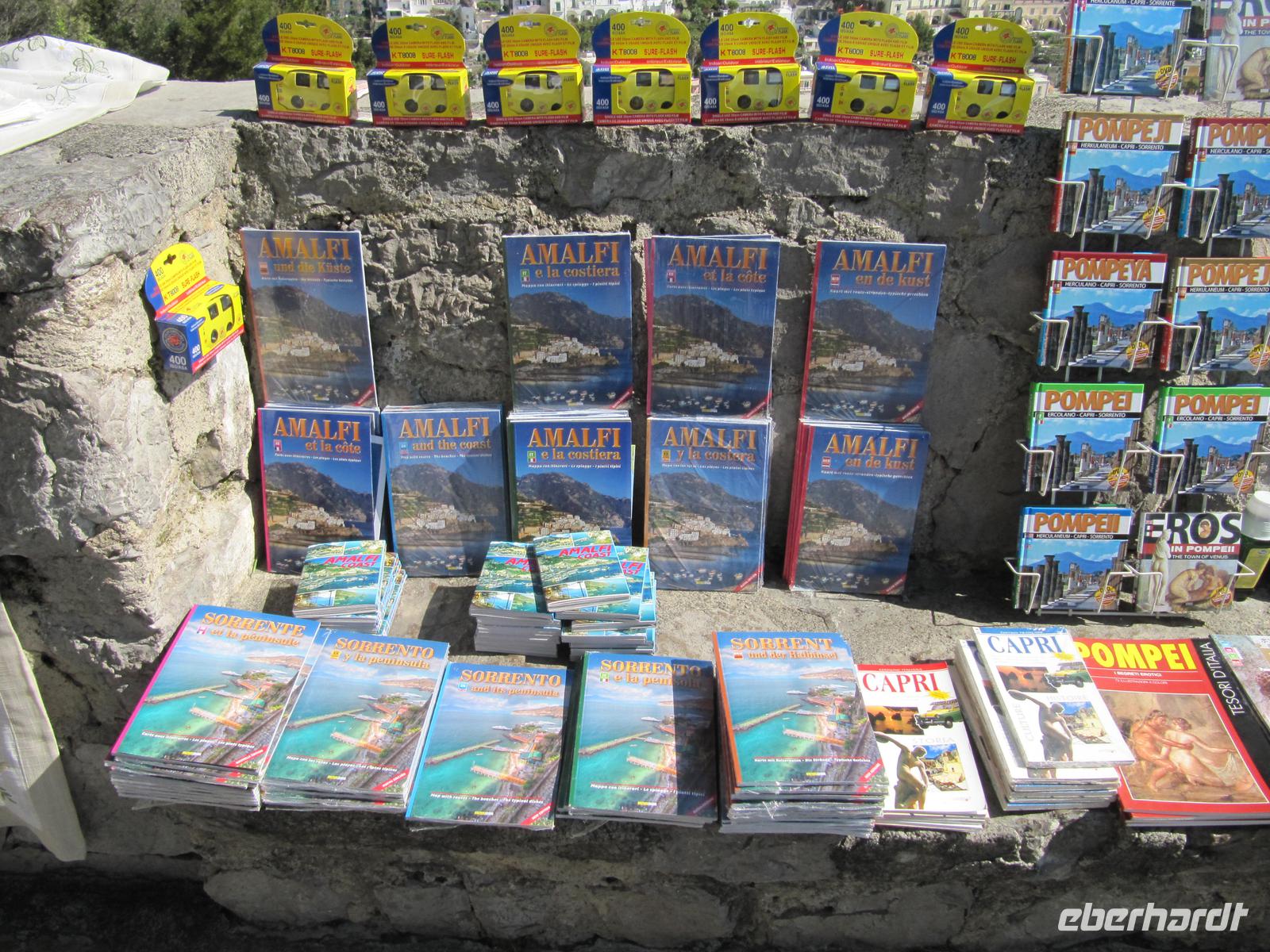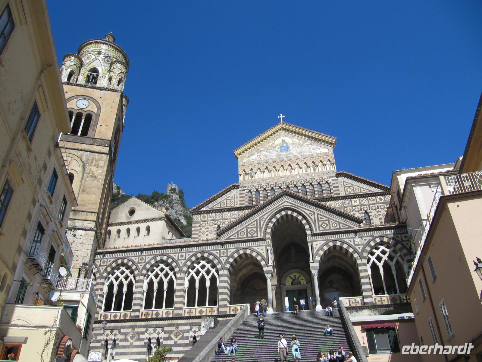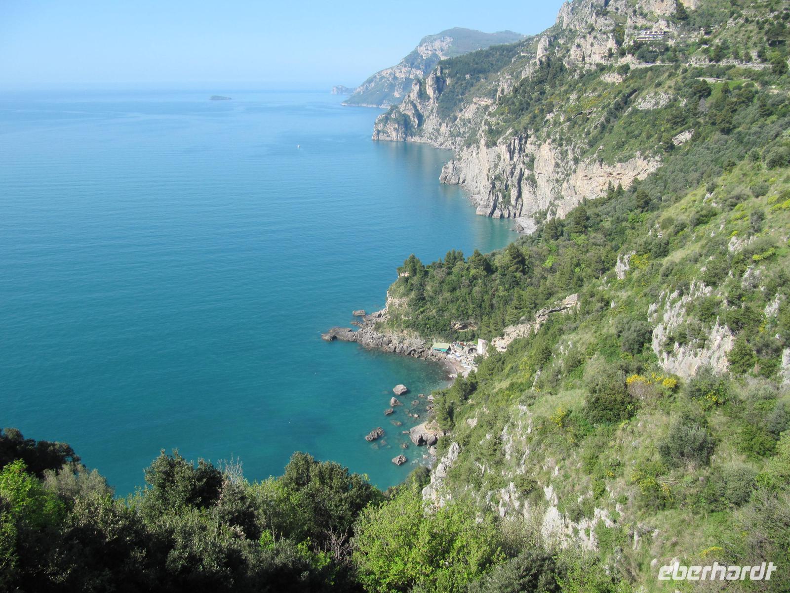 Mit einem italienischen Bus fahren wir mit Petra über Sorrent an die Amalfiküste. Zuerst ein Fotostopp am Golf von Sorrent! Auf einer engen Straße fahren wir an der Costa Divina, der Göttlichen Küste, zwischen Meer und Berg auf einer der bekanntesten Traumstraßen der Welt. Wir schauen auf die Galli-Inseln und auf das berühmte idyllische Örtchen Positano. In Amalfi hat uns Petra eine Bootstour entlang der Küste um Amalfi organisiert. Vom Meer aus können wir die Steilküste erst so richtig bewundern. Die Höhlen, die Vegetation, architektonische Kostbarkeiten, Villen berühmter Leute, das bekannte Ravello, und wir entdecken sogar unser Hotel oben auf der Steilküste. Petra bringt uns zum bekannten Dom von Amalfi, und zeigt uns ein kleines Straßencafe, wo man eine Kleinigkeit essen kann. Wir können den Dom Sant Andrea mit seinem schönen Kreuzgang und den Gebeinen des Heiligen besichtigen oder einige Souvenirs einkaufen.