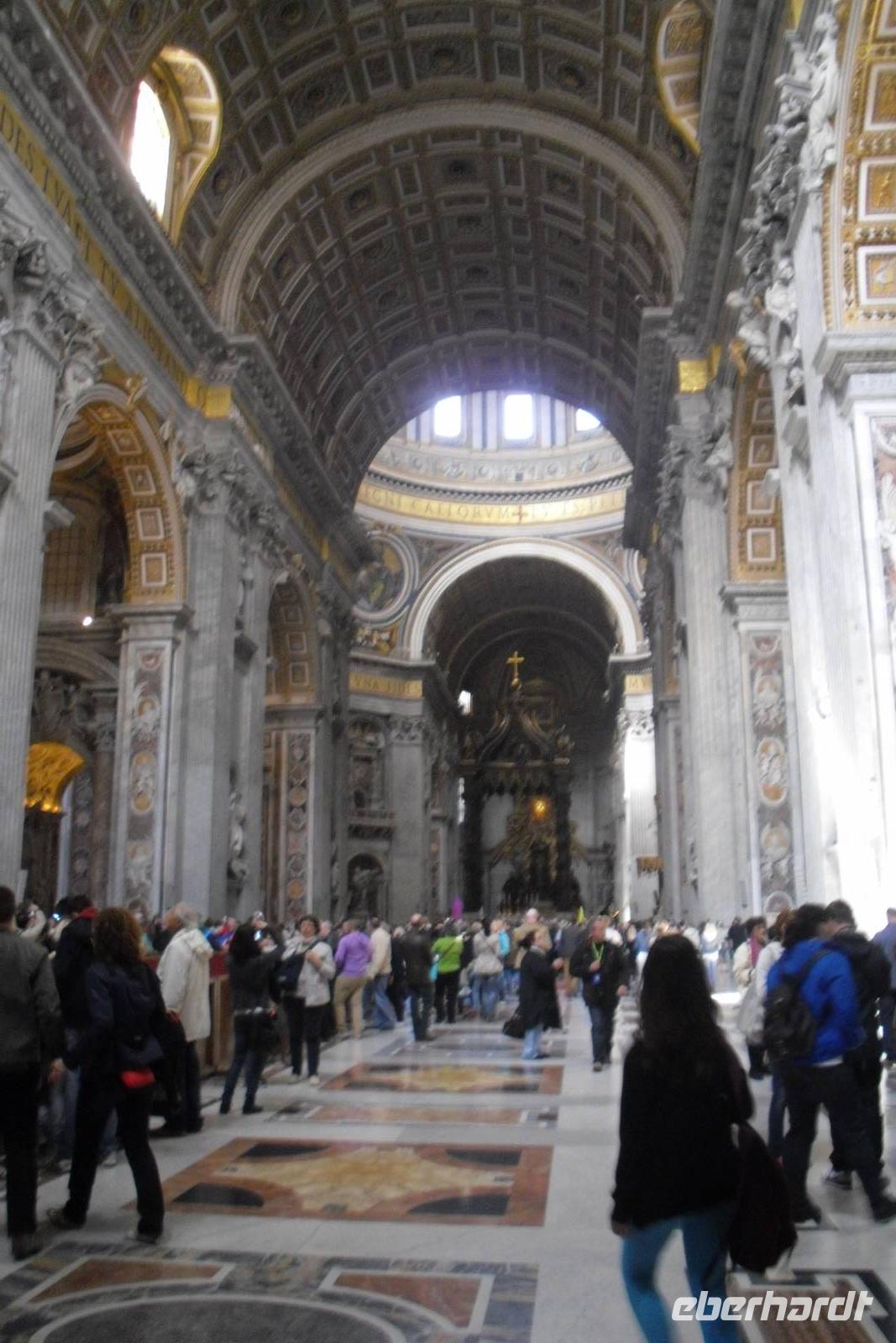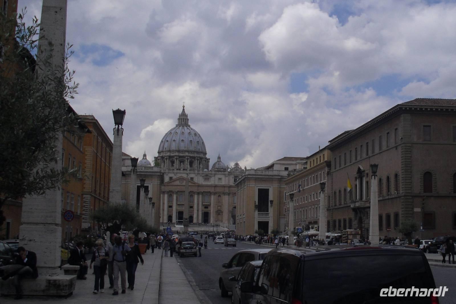 Nach dem Frühstück fuhren wir heute bei Sonnenschein mit öffentlichen Verkehrsmitteln in die Stadt hinein - der Petersplatz rief, das Zentrum der katholischen Christenheit. Achso, wir waren ja jetzt eigentlich gar nicht mehr in Rom, sondern im Vatikan. Wenn man von hier nach ganz rechts oben schaut, sieht man das Arbeitszimmer des Papstes, letzter Stock des Apostolischen Palastes, zweites Fenster von rechts. Sonntags um zwölf spricht er hier das Angelus-Gebet. Unter den Kolonnaden des Bernini erspäht man die Schweizergarde, jawohl, immer noch echte Schweizer, und die Uniform ist noch die, welche Michelangelo entworfen hat. Am anderen Ende der Piazza, majestätisch wie ein ruhender Löwe - die Peterskirche, die wir nunmehr besichtigten. Allein der Baldachin über dem Petrusgrab ist genauso hoch wie der Palazzo Farnese, einfach gigantisch! Aber die größte Kirche der Christenheit befindet sich im kleinsten Staat der Welt, denn der Vatikan ist mit 44 Hektar Staatsgebiet nicht gewaltiger als ein mittlerer Bauernhof. Seine knapp 500 Einwohner bilden das, was man andernorts eine Dorfgemeinschaft nennen würde. Eine Kaffeebar gibt es nicht, dagegen hält der Vatikan zu 170 Staaten diplomatische Beziehungen und der Papst empfängt weitaus mehr Staatsmänner zur Audienz als die italienische Regierung zu offiziellen Unterredungen. Die katholische Kirche ist übrigens die einzige Weltreligion, deren Oberhaupt gleichzeitig unumschränkte Autorität eines souveränen Staates ist. Nach dem Passieren der Sicherheitskontrolle war es dann soweit - man ist einfach überwältigt! Der Petersdom ist die größte christliche Kirche der Welt und fasst 60.000 Menschen. Im Petersdom ist nach christlichem Glauben der Apostel Petrus begraben. Obwohl sie nicht offizieller Sitz des Papstes ist (diesen stellt die Lateranbasilika/San Giovanni in Laterano dar), hält der Papst hier fast alle seiner Messen. Die Kirche beherbergt zahlreiche Kunstwerke, zum Beispiel die "Pietà" von Michelangelo, die hinter Glas steht, da sie 1972 von einem Kirchenbesucher mit einer Axt beschädigt wurde. Im nordwestlichen Teil befindet sich die Statue des heiligen Petrus, deren Füße traditionell von den Pilgern geküsst werden. Über den Hauptaltar, dem Grab Petris, erstreckt sich ein 30 Meter hoher Baldachin aus Bronze, der von Bernini entworfen wurde. Einige wagten im Anschluss an die Führung den Aufstieg zur Kuppel des Peterdomes und wurden mit einem fantastischen Blick über die Stadt belohnt. Wir trafen uns alle nach etwas Freizeit am Petersplatz wieder und fuhren mit öffentlichen Verkehrsmitteln zum Hauptbahnhof, wo wir eine Mittagspause einlegten. Gut gestärkt besichtigten wir am frühen Nachmittag die Kirche Santa Maria Maggiore, eine der vier Patriarchalbasiliken Roms. Sie wurde unter Papst Sixtus III. errichtet, nachdem 431 das Konzil von Ephesus Maria, die Mutter Jesu, als Gottes Gebärerin verkündet hatte und dadurch die Marienverehrung aufgeblüht war. Auch heute gab es wieder ein paar Extras im Rahmen der offiziellen Führung - so schlenderten wir durch romantische Altstadtgässchen zum Piazza Campo dei Fiori. In der Übersetzung trägt der Marktplatz den schönen Namen "Blumenfeld", was jedoch keineswegs auf eine friedliche Vergangenheit hinweist. Denn der Campo dei Fiori war die Hinrichtungsstätte der Inquisitionsbehörde des päpstlichen Roms. Die Bronzestatue des Giordano Bruno in der Platzmitte erinnert an eine von vielen Hinrichtungen. Im Jahre 1600 wurde der Humanist auf dem Campo dei Fiori als Ketzer verbrannt, nachdem er die Unfehlbarkeit der Kirche in Frage gestellt hatte. Heute endete unser Besichtigungsprogramm an der Piazza Navona. Gian Lorenzo Bernini schuf hier im 17. Jahrhundert einen der schönsten Brunnen des Barocks, den Vier-Ströme-Brunnen (Fontana dei Quattro Fiumi). Die vier riesenhaften Flussgötter symbolisieren die vier großen Ströme: Donau, Nil, Ganges und Rio de la Plata. Am späten Nachmittag nutzten wir die Zeit ganz individuell, um die engen Gassen rund um die Piazza Navona zu erkunden oder ganz einfach ein leckeres italienisches Eis zu schleckern! Nach einem leckeren Pasta-Abendessen in der Nähe der Engelsburg ging es am Abend zum Hotel zurück.
