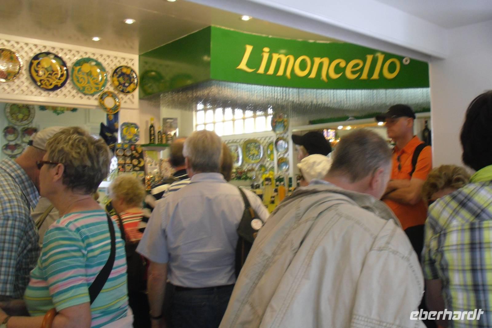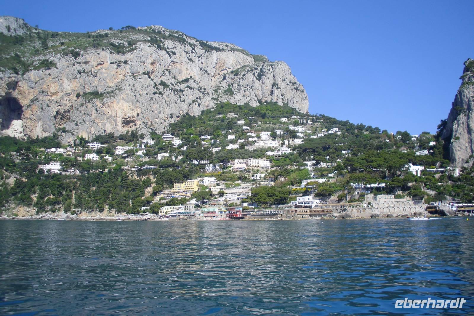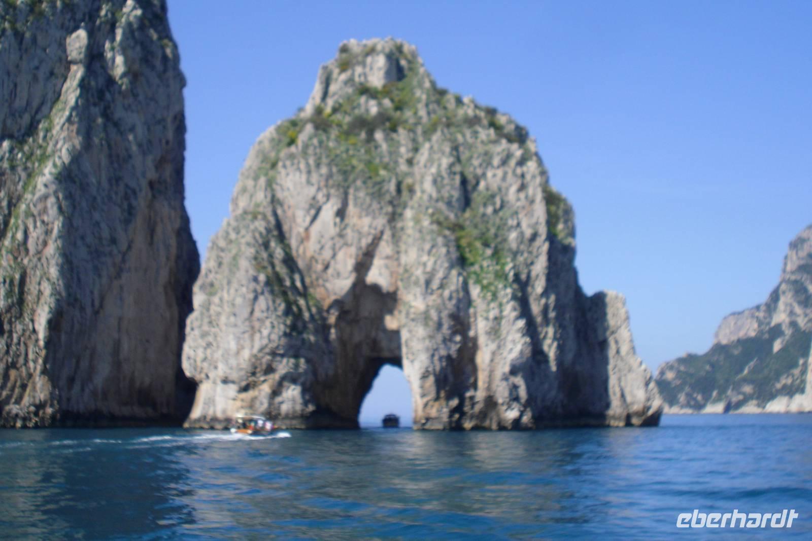 Ein weiterer Höhepunkt unserer Reise stand heute auf dem Programm. Wir mussten zwar dafür zeitig aufstehen, denn es ging schon um 7 Uhr los, damit hatte aber niemand von uns ein Problem... Schlafen konnten wir schließlich zu Hause! Außerdem gab es zum Frühstück extra für uns stärkendes "Roggenmischbrot" - wo gibt es schon so etwas in Süditalien? Wir hatten schönes Wetter und schon von der Terrasse unseres Hotels sahen wir den leuchtenden Kalkfelsblock im Meer - die Insel Capri! Wir fuhren mit dem Bus nach Sorrent und nahmen von dort die Fähre zur Insel Capri. Die Überfahrt dauerte nur etwa 35 Minuten. Schon von weitem türmt sich die Insel wie unzugänglich auf. Zwei durch einen geschwungenen Sattel verbundenen Hochebenen, auf denen die Orte Capri und Anacapri liegen, ineinander geschachtelte Häuserkuben, überragt von gekalkten und bunt gekachelten Kuppeln. Für uns war klar - Capri ist der Kontrast zwischen intensivem Blau des Meers, den strahlend weißen Felswänden und dem tiefen Grün der Vegetation. Wir unternahmen eine Schifffahrt rund um die Insel - die Ausblicke faszinierten uns, schließlich hatten wir auch heute wieder tolles Wetter erwischt! Unsere örtliche Reiseleiterin Dagy erzählte uns so manch nette Episode über die Insel. Bis auf einige Jahrhunderte, als die Präsenz von Piraten Vergnügungsreisen auf die Insel verbot, war Capri seit den Tagen des Augustus Ziel meist betuchter Reisender. Vielen gefiel die Kalkklippe im Meer so gut, dass sie zu Einheimischen wurden. Der erste "Prominente", der auf die Insel ausstieg, war der Nachfolger des vergöttlichten Augustus, Kaiser Tiberius, der die Insel zu einer riesigen Privatvilla umbaute; Mauerreste sind übrigens zum Teil noch deutlich zu sehen. Capri ist heute für das Mittelmeergebiet ein Botanischer Garten, auf so engem Raum lässt sich sonst nirgends die Vielfalt der mittelmeerischen Pflanzenwelt beobachten. Rund 1.000 Arten sind es, davon 150, die nur auf der Insel Capri vorkommen! Für die Geologen sei erwähnt, dass Capri nur die Fortsetzung der Amalfitanischen Halbinsel ist. Rund um die Insel sind über sechzig Höhlen und Grotten zu bewundern. Wir besuchten die beiden Inselorte, Capri und Anacapri - diese beiden Orte leben solange man weiß in Fehde; sie hatten sich voneinander isoliert, erst die im letzten Jahrhundert geschaffene Straßenverbindung brachte eine Veränderung. Wir fuhren in Minibussen auf den engen Straßen der Insel - sehr abenteuerlich! Am späten Nachmittag fuhren wir dann mit der Fähre zurück auf das Festland nach Sorrent.