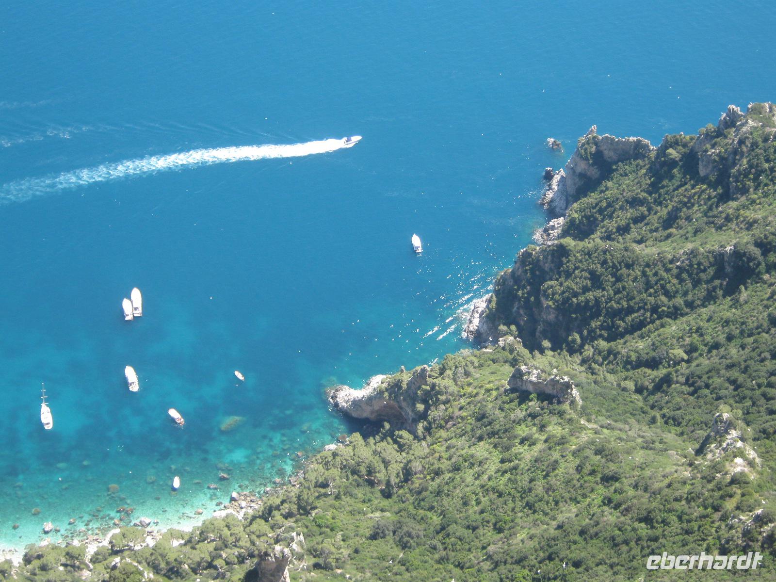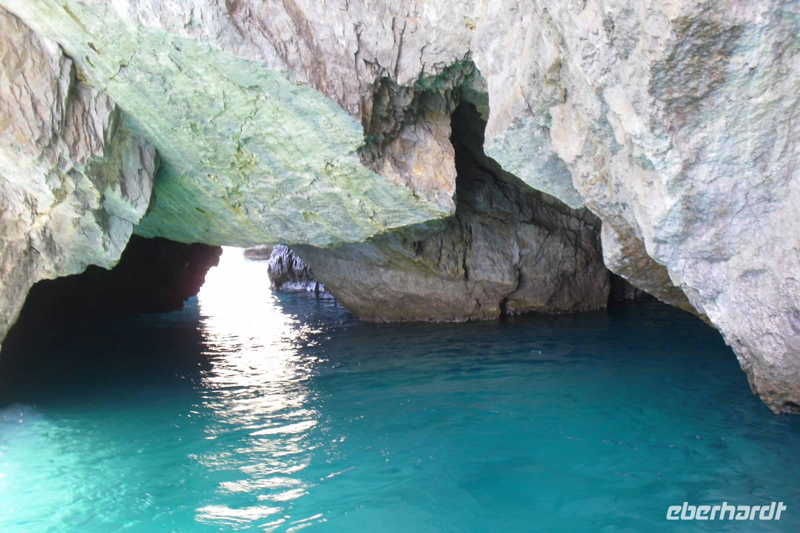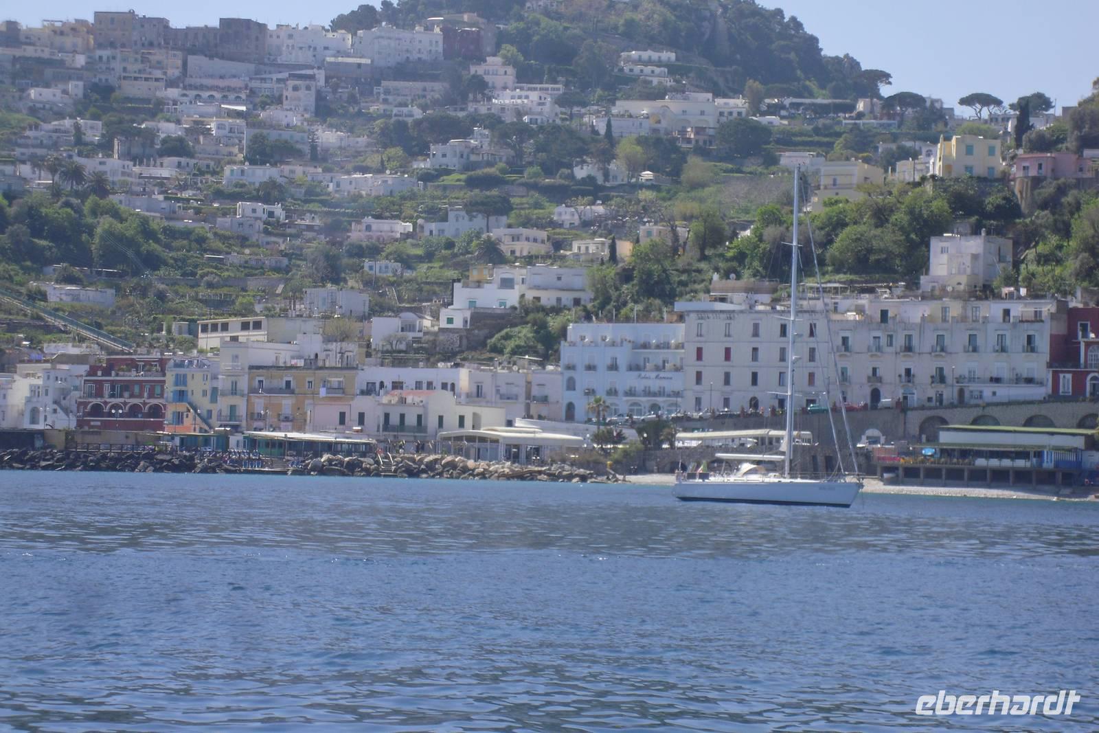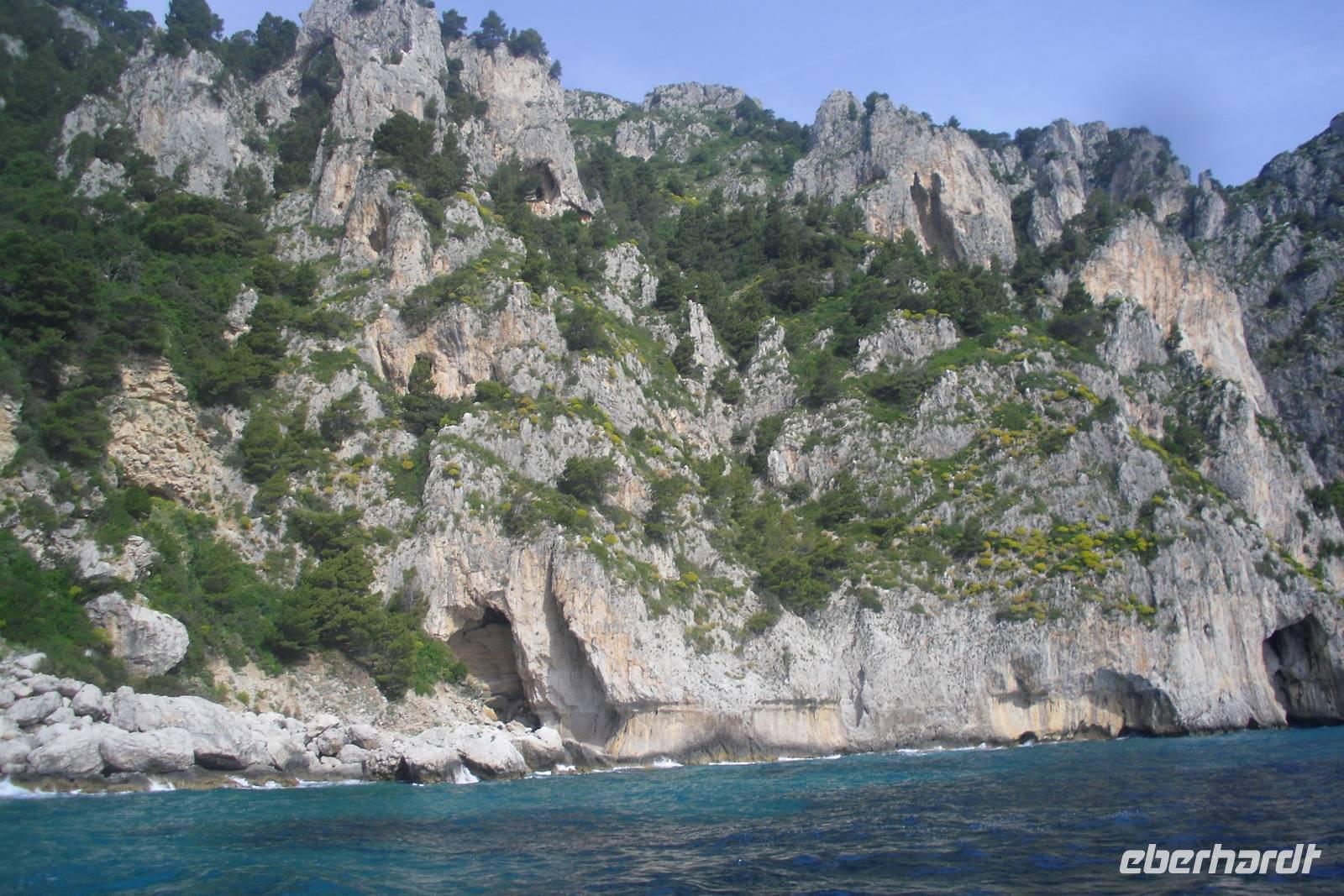 Ein weiterer Höhepunkt unserer Reise stand heute auf dem Programm. Wir mussten zwar dafür zeitig aufstehen, denn es ging schon um 7 Uhr los, damit hatte aber niemand von uns ein Problem... Schlafen konnten wir schließlich zu Hause! Außerdem gab es zum Frühstück extra für uns stärkendes "Roggenmischbrot" - wo gibt es schon so etwas in Süditalien? Wir hatten schönes Wetter und schon von der Terrasse unseres Hotels sahen wir den leuchtenden Kalkfelsblock im Meer - die Insel Capri! Wir fuhren mit dem Bus nach Sorrent und nahmen von dort die Fähre zur Insel Capri. Die Überfahrt dauerte nur etwa 35 Minuten. Schon von weitem türmt sich die Insel wie unzugänglich auf. Zwei durch einen geschwungenen Sattel verbundenen Hochebenen, auf denen die Orte Capri und Anacapri liegen, ineinander geschachtelte Häuserkuben, überragt von gekalkten und bunt gekachelten Kuppeln. Für uns war klar - Capri ist der Kontrast zwischen intensivem Blau des Meers, den strahlend weißen Felswänden und dem tiefen Grün der Vegetation. Wir unternahmen eine Schifffahrt rund um die Insel - die Ausblicke faszinierten uns, schließlich hatten wir auch heute wieder tolles Wetter erwischt! Unsere örtliche Reiseleiterin Dagy erzählte uns so manch nette Episode über die Insel. Bis auf einige Jahrhunderte, als die Präsenz von Piraten Vergnügungsreisen auf die Insel verbot, war Capri seit den Tagen des Augustus Ziel meist betuchter Reisender. Vielen gefiel die Kalkklippe im Meer so gut, dass sie zu Einheimischen wurden. Der erste "Prominente", der auf die Insel ausstieg, war der Nachfolger des vergöttlichten Augustus, Kaiser Tiberius, der die Insel zu einer riesigen Privatvilla umbaute; Mauerreste sind übrigens zum Teil noch deutlich zu sehen. Capri ist heute für das Mittelmeergebiet ein Botanischer Garten, auf so engem Raum lässt sich sonst nirgends die Vielfalt der mittelmeerischen Pflanzenwelt beobachten. Rund 1.000 Arten sind es, davon 150, die nur auf der Insel Capri vorkommen! Für die Geologen sei erwähnt, dass Capri nur die Fortsetzung der Amalfitanischen Halbinsel ist. Rund um die Insel sind über sechzig Höhlen und Grotten zu bewundern. Wir besuchten die beiden Inselorte, Capri und Anacapri - diese beiden Orte leben solange man weiß in Fehde; sie hatten sich voneinander isoliert, erst die im letzten Jahrhundert geschaffene Straßenverbindung brachte eine Veränderung. Wir fuhren in Minibussen auf den engen Straßen der Insel - sehr abenteuerlich! Am späten Nachmittag fuhren wir dann mit der Fähre zurück auf das Festland nach Sorrent.