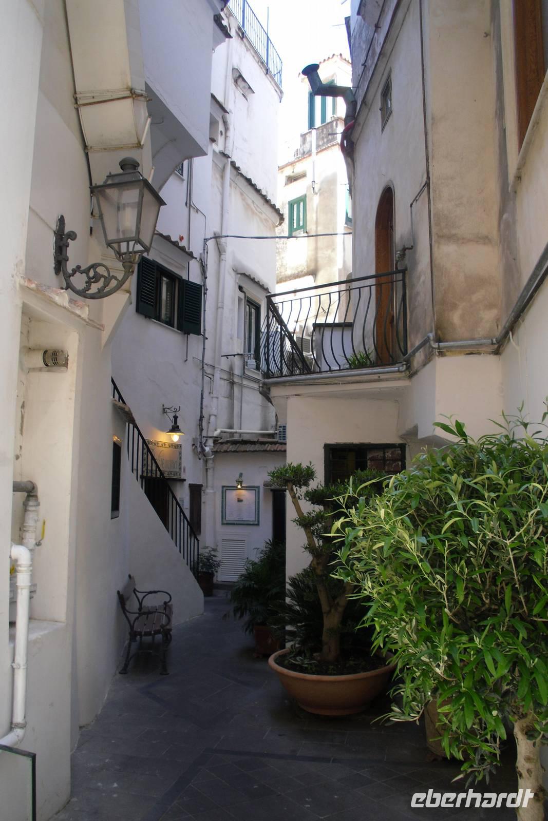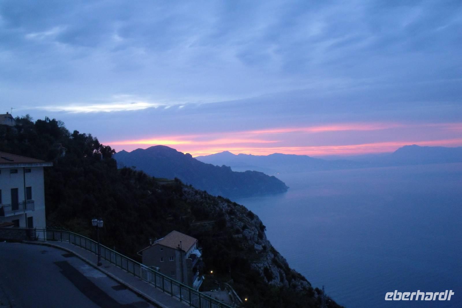 Da unser Bus nicht auf der Amalfiküsten-Straße fahren darf (er ist mit 12 Metern Länge nicht zugelassen), fuhren wir heute bei strahlendem Sonnenschein mit einem einheimischen Bus samt italienischen Buschauffeur auf einer der schönsten Küstenstraßen Italiens - die Straße ist streckenweise in die fast senkrecht abbrechende Felsküste eingehauen. Einige unserer Gruppe unternahmen eine Schifffahrt von Positano nach Amalfi, wiederum andere Gäste fuhren die komplette Strecke auf der Küstenstraße nach Amalfi. Auf beiden Seiten eines schmalen Tals steigen die Häuser den Berg hoch. Ihre Bauweise ist städtisch mit 3 - 5 Stockwerken, am Hang stehen sie übereinander gebaut. Amalfi war im Mittelalter eine der reichen und mächtigen vier Seerepubliken (neben Pisa, Genua und Venedig). Die Amalfitaner wurden durch den Fernhandel mit dem Orient, Ägypten, Konstantinopel, Südfrankreich und Norditalien reich, hatten eigene Handelsniederlassungen und eigene Wohnviertel in vielen Städten des Orients und auch in Süditalien und Sizilien. Das Seebeben Ende des 14. Jahrhunderts, die korrupte Herrschaft des spanischen Vizekönigs in Neapel, die Türkengefahr und noch mehr die Verlagerung der Handelswege nach der Entdeckung Amerikas machten aus Amalfi ein armes, von der Außenwelt abgeschnittenes Nest hinter den Bergen. Erst die Entdeckung durch den Tourismus nach 1850 brachte Änderung. Wir hatten genügend Zeit, um den Ort ganz individuell zu entdecken. Besonders sehenswert ist übrigens der Dom; Fassade und Treppe sind nachempfunden, der Turm ist allerdings echt; es gibt eine schöne Bronzetür aus Konstantinopel, das Innere des Doms ist barockisiert. Am Nachmittag führte uns die Straße über Furore direkt nach Agerola zurück. Wir ließen diesen wunderschönen Tag am späten Nachmittag mit einem Spaziergang zum Castello Lauritano in Agerola ausklingen - von hier aus bot sich uns ein toller Blick auf Amalfi und Ravello. Dazu gab es Wein, Gebäck, nette Unterhaltungen und viel Gesang - die Stimmung war ausgelassen!