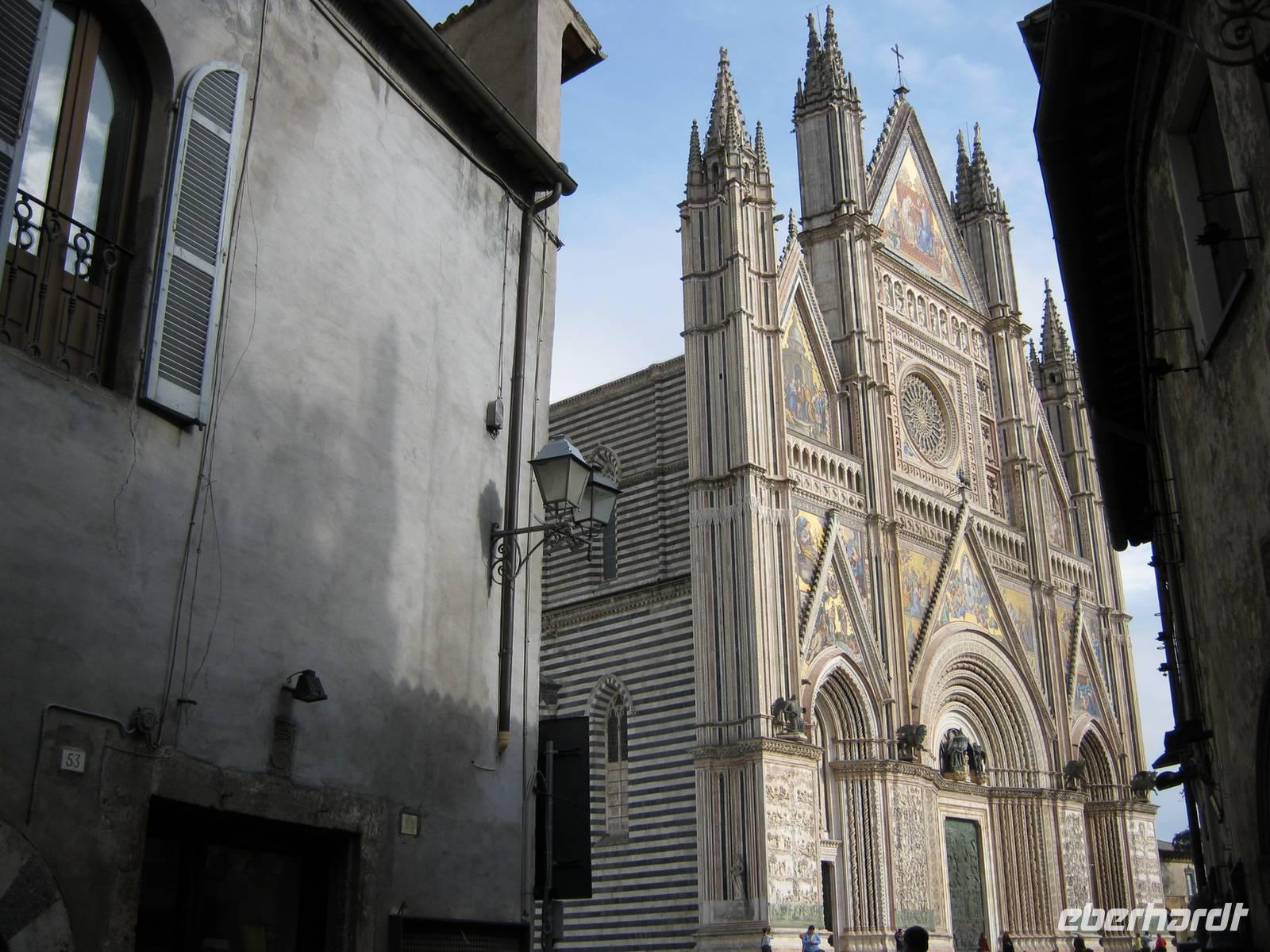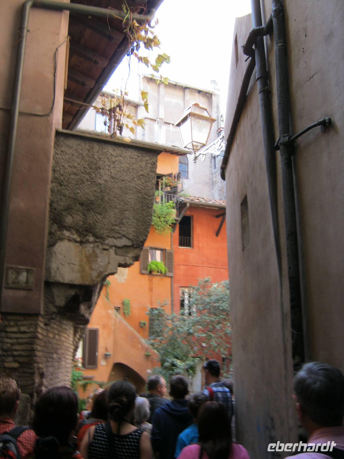 Doch schön der Reihe nach: durch Bayern, an München vorbei und schließlich den Inn aufwärts - die Tiroler Grenzfestung Kufstein passierten wir ganz ohne Schwierigkeiten - von Innsbruck aus unter dem legendären Berg Isel mit seiner neuen Sprungschanze und dem alten „Andreas-Hofer - und Tiroler-Kaiserjäger-Museum" hindurch, das im Tirol-Panorama eine neue Heimstatt gefunden hat, ging es über über die Europa-Brücke. Auf deren Rastplatz nutze ich nach Möglichkeit die Chance erstmals in direkte Berührung mit der römischen Kultur zu kommen, indem wir uns ein Stück der alten Römerstraße anschauen - ein rund zweitausend Jahre altes Stück genialer Infrastruktur. Danach weiter über den Brenner (die klassische Route!) hinüber nach Südtirol, heute autonome Region Italiens. Das Eisack-Tal abwärts durch die „Sachsenklemme" und vorbei an der mächtigen Franzensfeste, ab Bozen die Etsch entlang und schließlich von Rovereto über einen kleinen Pass ins parallele Tal, wo sich von Nago aus zum ersten Mal der überaus romantische Blick auf den Gardasee bot. Schließlich zur ersten Zwischenübernachtung in die in einer schmalen und ruhigen Nebenstraße gelegene familiengeführte Villa Alberta. Am nächsten Morgen - leider bei trübem Wetter das (um diese Jahreszeit) beschauliche Ostufer des vielbesungenen Gardasees hinab, an Verona, der Stadt von Romeo und Julia, vorbei. Über die behäbige und reiche Fruchtebene der Emilia-Romagna, vorbei an Bologna, der Heimstatt einer der ältesten Universitäten Europas, durch den nördlichen Apennin, quer durch das Tal des Arno - Florenz querab, dessen Kuppel des Domes von weitem grüßte - bis hin zu dem auf einem von Kellern und Gängen durchzogenen Tuffsteinplateau thronenden Orvieto, wo Marco - mal dramatisch, mal ganz leise - für uns den Marmor an der Domfassade zum Reden brachte. Es wurde dann ein bisschen später bis wir in unserem modernen Hotel Artis in den Außenbezirken Roms ankamen, wo wir die Fluggäste schon vorfanden.Erlebnisreiche Tage in der „ewigen Stadt"