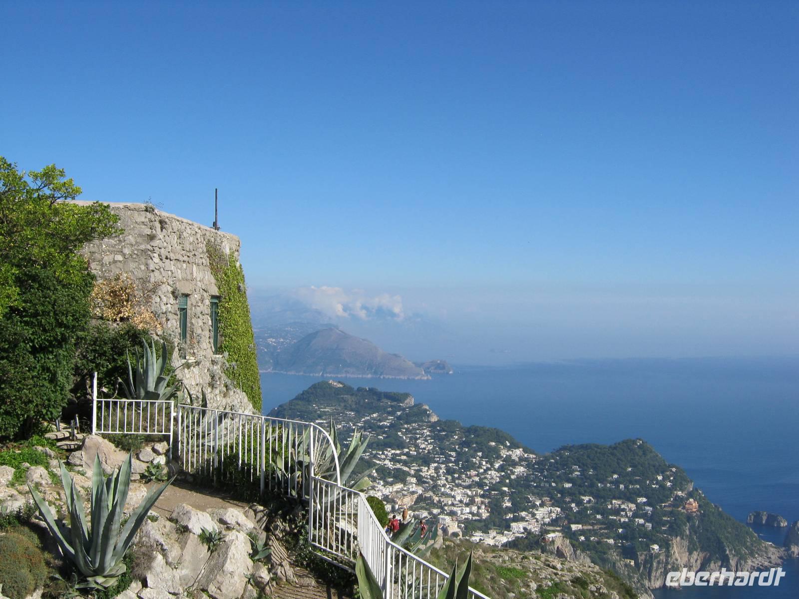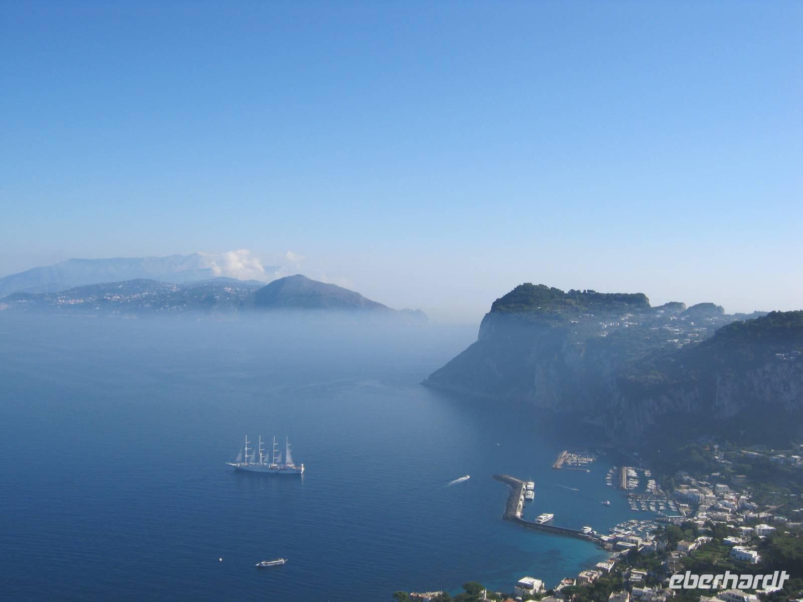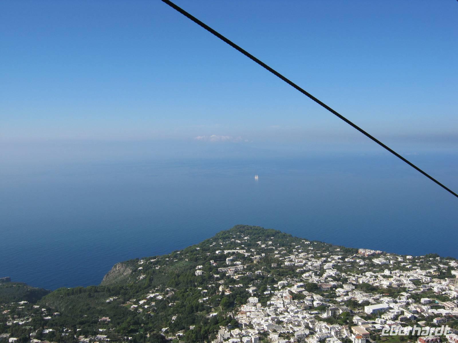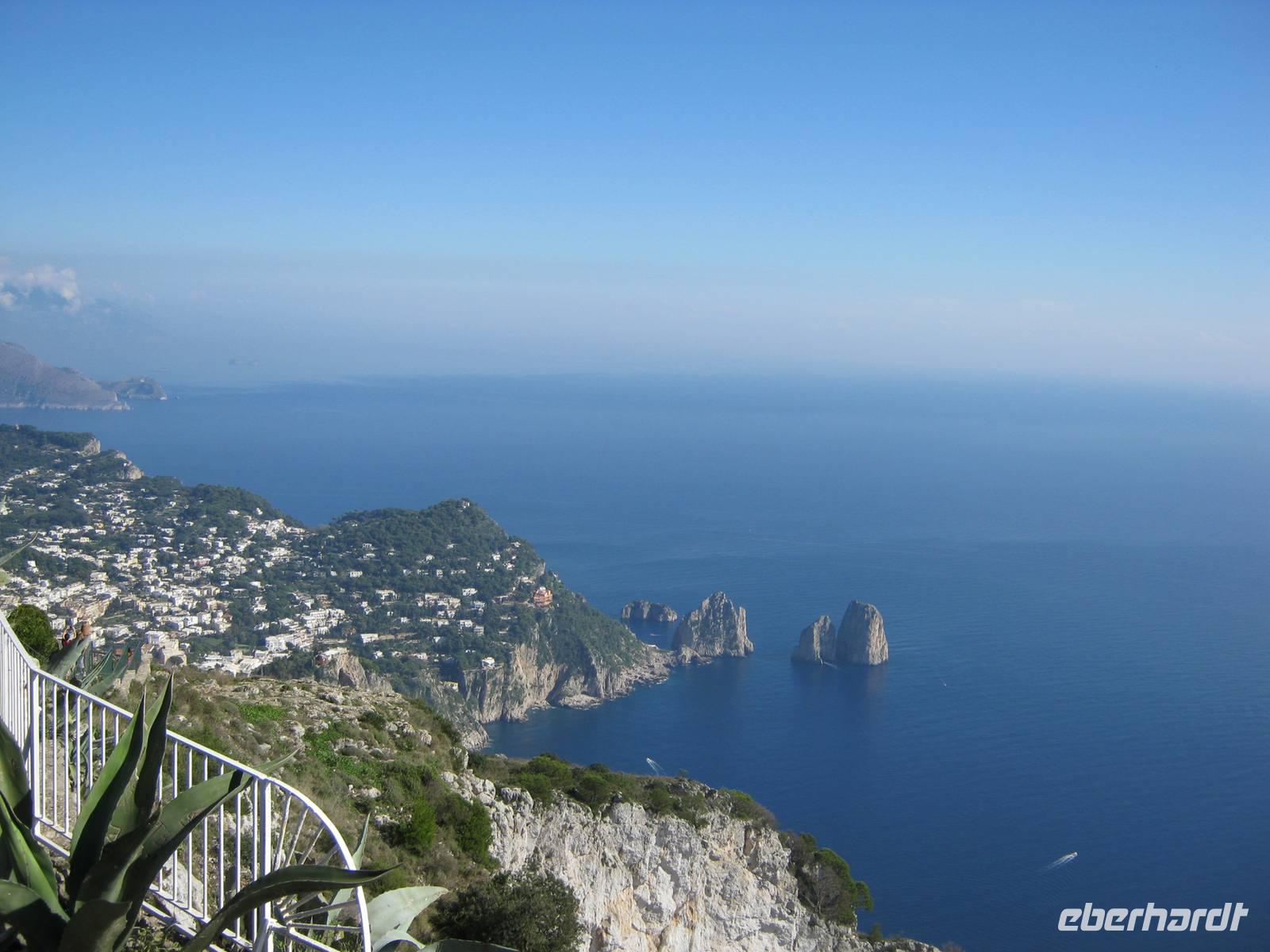 Glücklicherweise hatten wir für unseren fakultativen Ausflug nach Sorrent und Capri, der von der bekannten und kompetenten Dagy begleitet wurde, noch schönes Wetter (selbst die Einheimischen sagten, daß es für die Jahreszeit außergewöhnlich gut war), so dass wir auch mit einem kleinen Schiff eine Rundfahrt um die Insel machen konnten, bei der wir all die Attraktionen wie die diversen Grotten und die Faraglioni von der Wasserseite aus nächster Nähe sahen. Dann ging es in sausender Fahrt mit den speziellen Inselbussen hinauf zunächst nach Anacapri, wo es neben der Villa Munthe noch Limoncello zu kosten gab. Wer wollte konnte mit dem Lift noch höher hinaus auf den Monte Solaro, der einen unvergleichlichen Rundblick bietet. Der Hauch von Mondänität umweht Capri noch immer - besonders zwischen Piazzetta und Hotel Quisisana im Hauptort -, auch wenn tagsüber ganze Massen von Touristen sich auf der Insel drängen. Bei Sonnenuntergang waren wir schon wieder weg und können also Rudi Schurickes Behauptung nicht verifizieren.