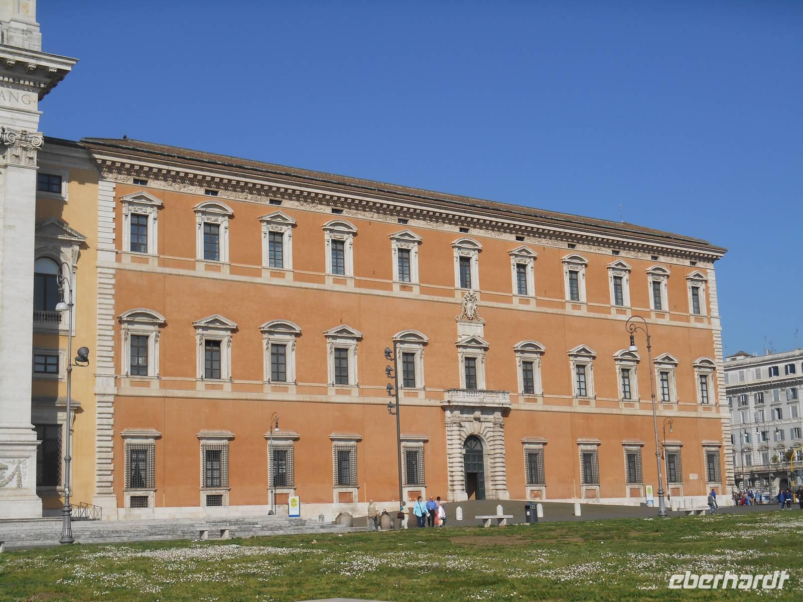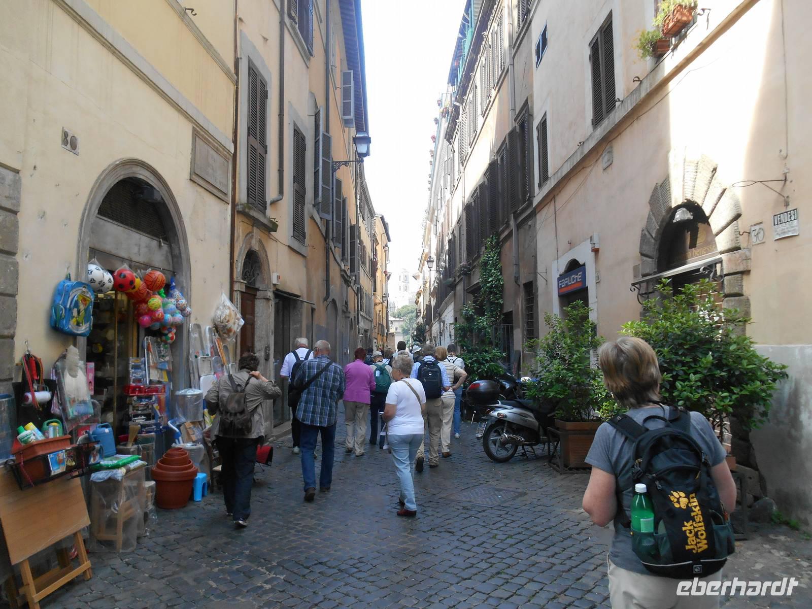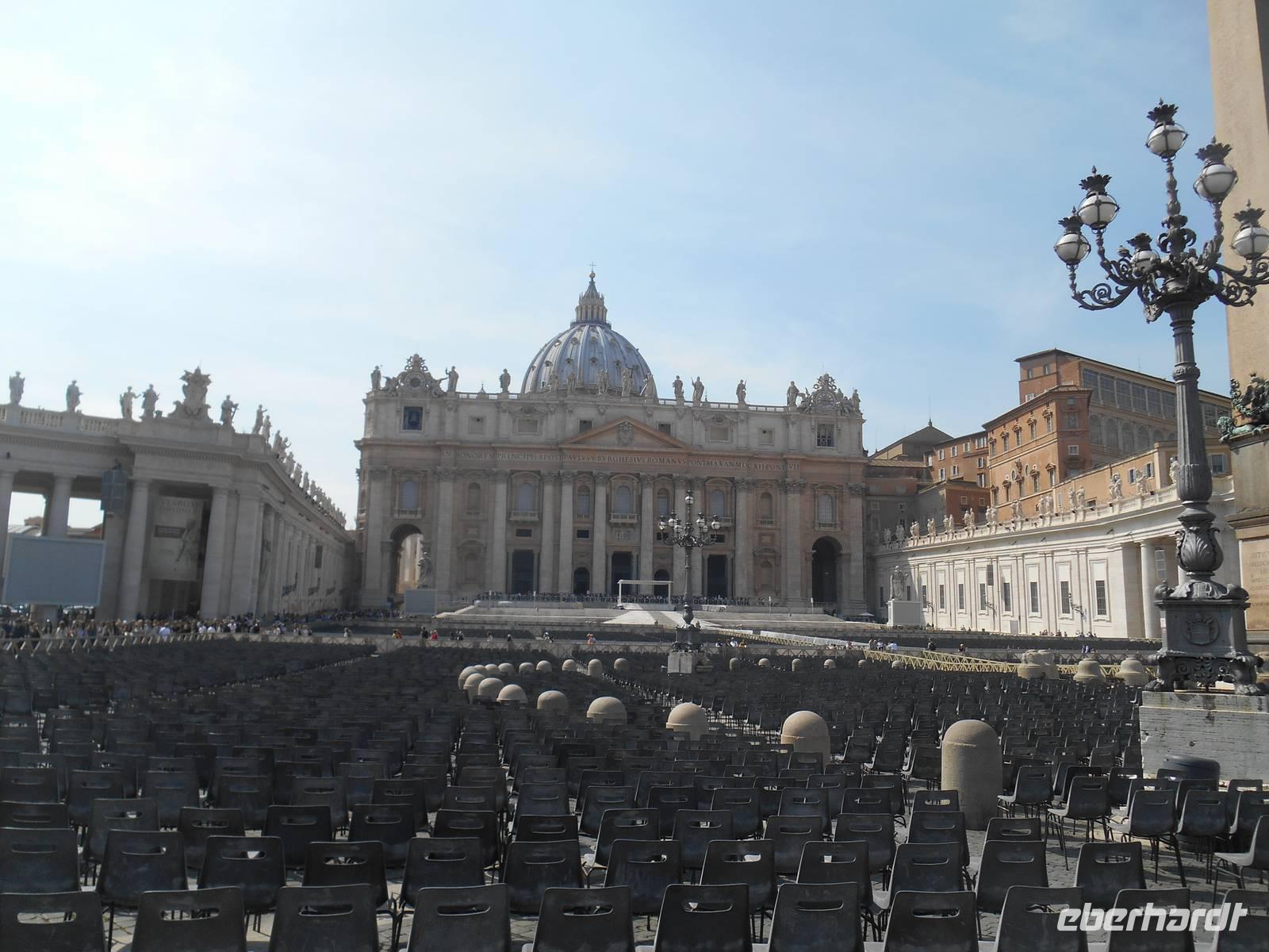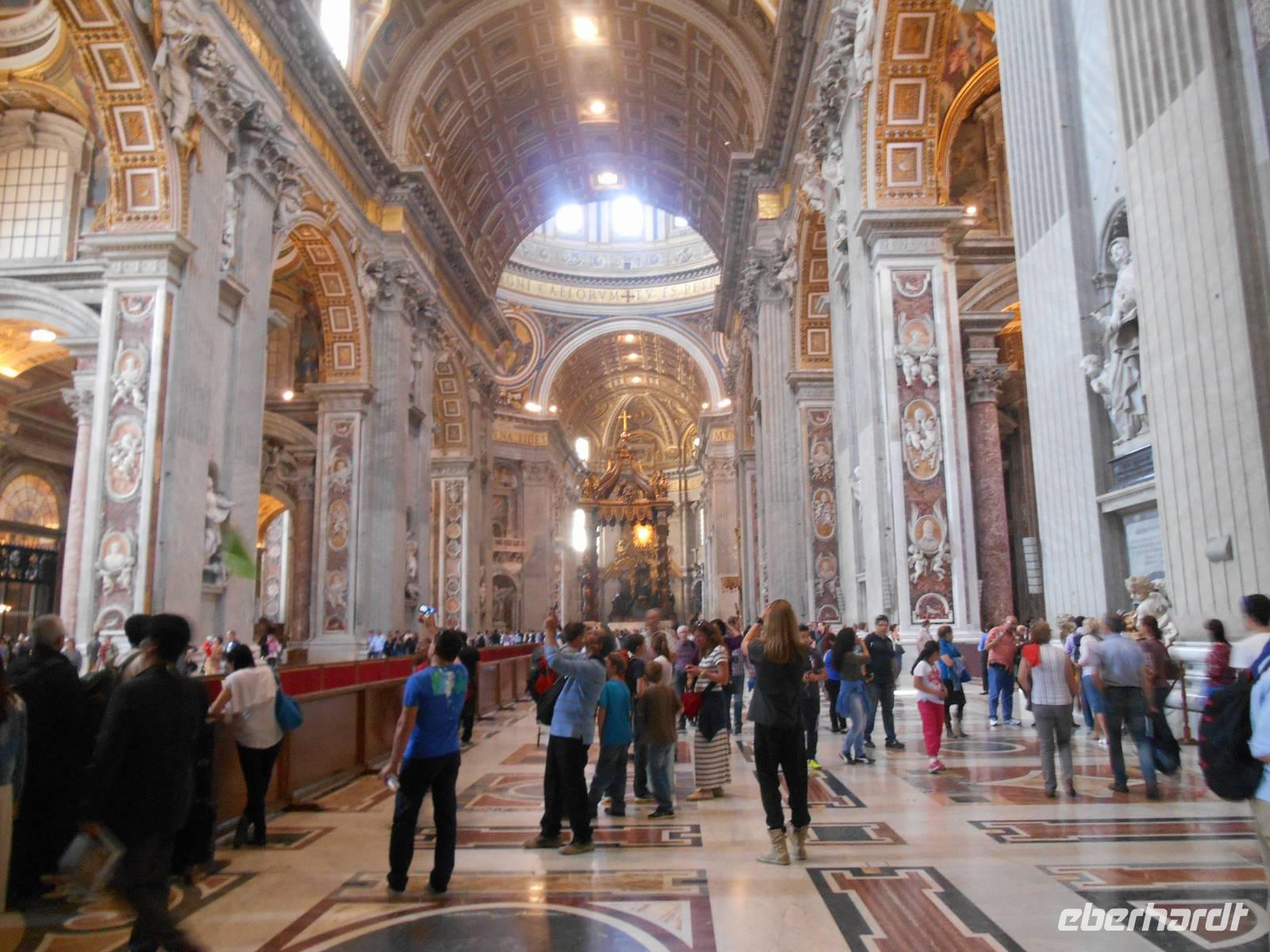 Weiter gelangten wir mit dem öffentlichen Linienbus in die Nähe des mittelalterlichen Borgo-Viertels, welches sich zwischen der Engelsburg und dem Vatikan befindet - ein Stadtviertel mit sehr engen Straßen und Gassen, in denen sich zahlreiche Bars, Cafés, Restaurants und Geschäfte befinden. Hier hatten wir die Gelegenheit, einen kleinen Mittagsimbiss einzunehmen - die meisten Gäste gönnten sich ein Stückchen leckere Pizza, einfach köstlich! Am frühen Nachmittag kamen wir dann am Petersplatz, dem Zentrum der katholischen Christenheit, an. Achso, wir waren ja jetzt eigentlich gar nicht mehr in Rom, sondern im Vatikan. Wenn man von hier nach ganz rechts oben schaut, sieht man das Arbeitszimmer des Papstes, letzter Stock des Apostolischen Palastes, zweites Fenster von rechts. Sonntags um zwölf spricht er hier das Angelus-Gebet. Unter den Kolonnaden des Bernini erspäht man die Schweizergarde - jawohl, immer noch echte Schweizer, und die Uniform ist noch die, welche Michelangelo entworfen hat. Am anderen Ende der Piazza, majestätisch wie ein ruhender Löwe - die Peterskirche, die wir nunmehr besichtigten. Allein der Baldachin über dem Petrusgrab ist genauso hoch wie der Palazzo Farnese, einfach gigantisch! Aber die größte Kirche der Christenheit befindet sich im kleinsten Staat der Welt, denn der Vatikan ist mit 44 Hektar Staatsgebiet nicht gewaltiger als ein mittlerer Bauernhof. Seine knapp 500 Einwohner bilden das, was man andernorts eine Dorfgemeinschaft nennen würde. Eine Kaffeebar gibt es nicht, dagegen hält der Vatikan zu 170 Staaten diplomatische Beziehungen und der Papst empfängt weitaus mehr Staatsmänner zur Audienz als die italienische Regierung zu offiziellen Unterredungen. Die katholische Kirche ist übrigens die einzige Weltreligion, deren Oberhaupt gleichzeitig unumschränkte Autorität eines souveränen Staates ist. Nach dem Passieren der Sicherheitskontrolle war es dann soweit - man ist einfach überwältigt! Der Petersdom ist die größte christliche Kirche der Welt und fasst 60.000 Menschen. Im Petersdom ist nach christlichem Glauben der Apostel Petrus begraben. Obwohl sie nicht offizieller Sitz des Papstes ist (diesen stellt die Lateranbasilika/San Giovanni in Laterano dar), hält der Papst hier fast alle seiner Messen. Die Kirche beherbergt zahlreiche Kunstwerke, zum Beispiel die "Pietà" von Michelangelo, die hinter Glas steht, da sie 1972 von einem Kirchenbesucher mit einer Axt beschädigt wurde. Im nordwestlichen Teil befindet sich die Statue des heiligen Petrus, deren Füße traditionell von den Pilgern geküsst werden. Über den Hauptaltar, dem Grab Petris, erstreckt sich ein 30 Meter hoher Baldachin aus Bronze, der von Bernini entworfen wurde. Wir trafen uns alle nach etwas Freizeit am Petersplatz wieder und schlenderten weiter in Richtung Engelsburg, einem ursprünglichen Grab-Bau für Kaiser Hadrian (117-138 n. Chr.). Den heutigen Namen erhielt das ehemalige Hadrianeum, als im Jahre 590 Papst Gregor der Große eine göttliche Vision hatte: ein Engel erschien ihm über dem Mausoleum und kündigte das Ende der damals herrschenden Pest an, indem er sein Schwert in die Scheide steckte - heute so dargestellt in der bronzenen Engelsstatue aus dem Jahre 1753 auf der Spitze des Kastells. Die anschließende Freizeit nutzten die meisten Gäste schließlich für die Innenbesichtigung der Engelsburg - oben angekommen, wird man übrigens mit einem herrlichen Blick über die Stadt belohnt! Nach einem schmackhaften Pasta-Abendessen in der Nähe der Engelsburg ging es am Abend mit öffentlichen Verkehrsmitteln zum Hotel zurück.