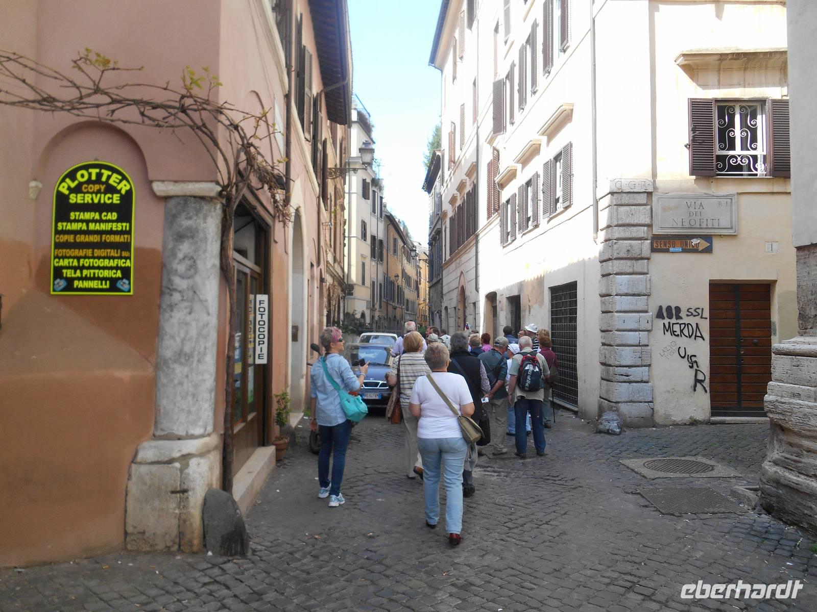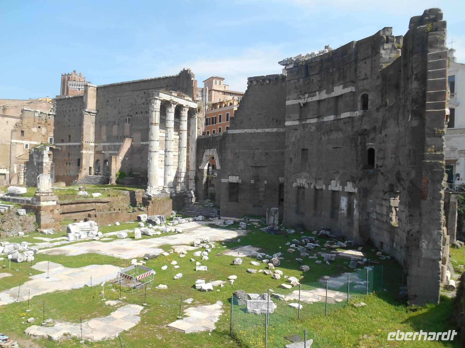 Nach dem Frühstück fuhren wir bei Sonnenschein mit öffentlichen Verkehrsmitteln in die Stadt hinein - zuerst besichtigten wir die Kirche Santa Maria Maggiore, eine der vier Patriarchalbasiliken Roms. Sie wurde unter Papst Sixtus III. errichtet, nachdem 431 das Konzil von Ephesus Maria, die Mutter Jesu, als Gottes Gebärerin verkündet hatte und dadurch die Marienverehrung aufgeblüht war. Nach einem anschließenden kurzen Abstecher zur nahe gelegenen Basilika San Pietro in Vincoli mit der berühmten Moses-Statue von Michelangelo und einem Spaziergang durch typisch römische Gassen erreichten wir das Nerva-Forum, das dritte der vier Kaiserforen in Rom. Sein Bau wurde unter Kaiser Vespasian oder Domitian begonnen. Jedoch wurde es erst 97 n. Chr. unter Nerva fertiggestellt, geweiht und nach ihm benannt.