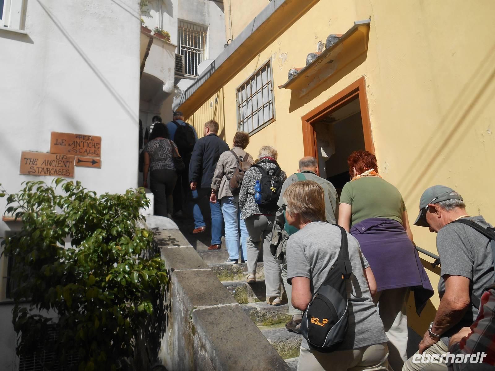 Ein weiterer Höhepunkt unserer Reise stand heute auf dem Programm. Wir mussten zwar dafür zeitig aufstehen, denn es ging schon um 6.45 Uhr los, damit hatte aber niemand von uns ein Problem... Schlafen konnten wir schließlich zu Hause! Außerdem gab es zum Frühstück extra für uns stärkendes "Roggenmischbrot" - wo gibt es schon so etwas in Süditalien? Wir hatten schönes Wetter und schon von der Terrasse unseres Hotels sahen wir den leuchtenden Kalkfelsblock im Meer - die Insel Capri! Wir fuhren mit dem Bus nach Sorrent und nahmen von dort die Fähre zur Insel Capri. Die Überfahrt dauerte nur etwa 35 Minuten. Schon von weitem türmt sich die Insel wie unzugänglich auf. Zwei durch einen geschwungenen Sattel verbundenen Hochebenen, auf denen die Orte Capri und Anacapri liegen, ineinander geschachtelte Häuserkuben, überragt von gekalkten und bunt gekachelten Kuppeln. Für uns war klar - Capri ist der Kontrast zwischen intensivem Blau des Meers, den strahlend weißen Felswänden und dem tiefen Grün der Vegetation. Wir unternahmen eine Schifffahrt rund um die Insel - die Ausblicke faszinierten uns, schließlich hatten wir auch heute wieder tolles Wetter erwischt! Unsere örtliche Reiseleiterin Claudia erzählte uns so manch nette Episode über die Insel. Bis auf einige Jahrhunderte, als die Präsenz von Piraten Vergnügungsreisen auf die Insel verbot, war Capri seit den Tagen des Augustus Ziel meist betuchter Reisender. Vielen gefiel die Kalkklippe im Meer so gut, dass sie zu Einheimischen wurden. Der erste "Prominente", der auf die Insel ausstieg, war der Nachfolger des vergöttlichten Augustus, Kaiser Tiberius, der die Insel zu einer riesigen Privatvilla umbaute; Mauerreste sind übrigens zum Teil noch deutlich zu sehen. Capri ist heute für das Mittelmeergebiet ein Botanischer Garten, auf so engem Raum lässt sich sonst nirgends die Vielfalt der mittelmeerischen Pflanzenwelt beobachten. Rund 1.000 Arten sind es, davon 150, die nur auf der Insel Capri vorkommen! Für die Geologen sei erwähnt, dass Capri nur die Fortsetzung der Amalfitanischen Halbinsel ist. Rund um die Insel sind über sechzig Höhlen und Grotten zu bewundern. Wir besuchten die beiden Inselorte, Capri und Anacapri - diese beiden Orte leben solange man weiß in Fehde; sie hatten sich voneinander isoliert, erst die im letzten Jahrhundert geschaffene Straßenverbindung brachte eine Veränderung. Wir fuhren in Minibussen auf den engen Straßen der Insel - sehr abenteuerlich! Am späten Nachmittag fuhren wir dann mit der Fähre zurück auf das Festland nach Sorrent.