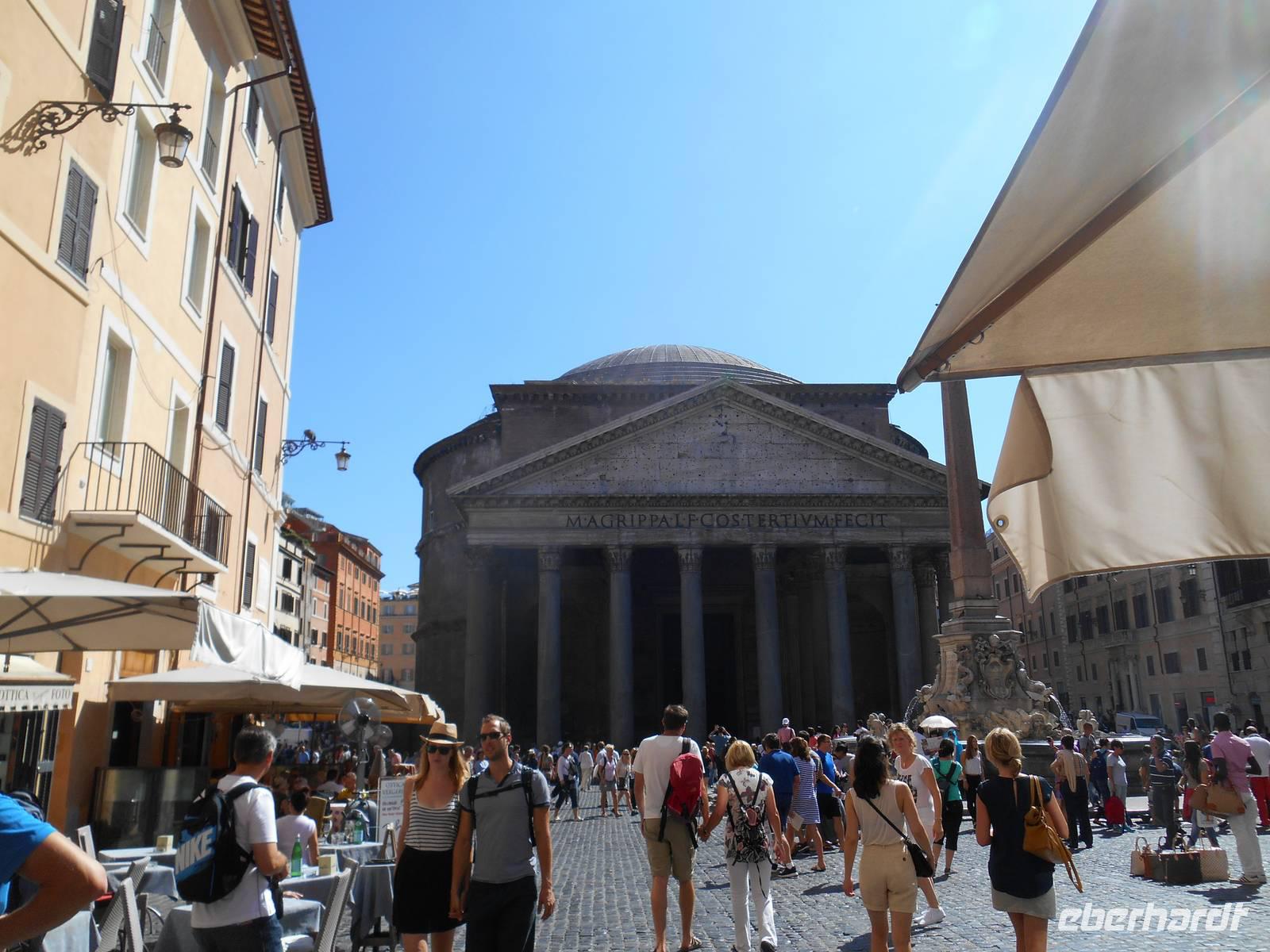Das Frühstück im Hotel war zwar nicht so üppig wie zu Hause, aber das wussten wir bereits vorher und somit fuhren wir gut gelaunt mit unserem eigenen Reisebus in die Stadt hinein. Wir wurden für die nächsten Tage mit Audio-Geräten ausgestattet, damit wir die Führungen ganz intensiv erleben konnten. Unsere nette Stadtführerin Christina erwartete uns bereits am Ostiense-Bahnhof und hier begann auch gleich der erste Teil unserer informativen Stadtrundfahrt - diese führte uns unter anderem vorbei an den Caracalla-Thermen, welche mehr als nur ein Badehaus waren, zum Circus Maximus. Es war das größte Stadium im antiken Rom. Fast ein ganzes Jahrtausend lang wurden dort beliebte Wagenrennen gehalten. An einem Punkt der Geschichte bot der Circus Platz für 250.000 Leute - ein Viertel von Roms Bevölkerung! Anschließend stand die Besichtigung der Lateransbasilika an, welche eine der ältesten Kirchen Roms ist. Sie ist die eigentliche Kathedrale des Papstes und gilt als Mutter und Haupt aller Kirchen der Welt. Im Lauf der Jahrzehnte wurde die Basilika beschädigt und wieder gebaut, das jetzige Aussehen der Basilika San Giovanni im Lateran ist Borrominis Werk. Mit unserem Bus gelangten wir weiter in die historische Altstadt, wo wir allerdings zu Fuß weiter mussten - große Fahrzeuge passen nun einmal nicht durch die engen GassenZwinkernd! Zuerst spazierten wir zur berühmten Spanischen Treppe. Die beschwingten Balustraden der Spanischen Treppe unter der französischen Kirche Trinita dei Monti sind das harmonische Ergebnis eines jahrzehntelangen Streits zwischen den Päpsten und der französischen Krone. Die Franzosen finanzierten den Aufgang zu ihrer Nationalkirche, und der Sonnenkönig Ludwig XIV. hätte sich am liebsten selbst auf der Piazza di Spagna ein Denkmal gesetzt. Aber die Päpste brachten schließlich ihre Version durch und ließen 1723 die elegante Treppenanlage schaffen. Anschließend gelangten wir zum berühmten Trevi-Brunnen (dieser wurde leider gerade restauriertStirnrunzelnd). Roms beliebteste Wasserorgel steht auf einem kleinen Platz, umgeben von sechsstöckigen Palazzi. Mit dem Bau schufen sich die Barockpäpste 1750 ein letztes großes Denkmal, denn ihre Macht im Kirchenstaat schwand dahin. Meeresgott Ozeanus braust mit zwei Pferden durch einen Triumphbogen heran. Viele Gäste warfen Münzen in den Brunnen, um nach Rom zurückzukehren. So langsam bekamen wir Hunger und somit verbrachten wir auch gleich hier unsere Mittagspause. Jeder nutzte die Zeit ganz individuell, um die engen Gassen rund um den Platz zu erkunden, ein Stück Pizza zu essen oder ganz einfach ein leckeres italienisches Eis zu schleckernZwinkernd! Nach dieser kleinen stärkenden Mittagspause schlenderten wir weiter durch romantische Altstadtgässchen und besuchten, zusätzlich zum eigentlichen Programm, das Pantheon - ein Zylinder mit einer Kuppel drauf, so einfach-genial ist die Konstruktion des Pantheons. Markus Agrippa, Schwiegersohn von Augustus, ließ das Pantheon 27 v. Chr. den Göttern bauen. Wieder im Bus, setzten wir unsere Stadtrundfahrt fort - unter anderem vorbei an der Engelsburg und der Tiberinsel erreichten wir am Nachmittag den Piazza Venezia mit seinem Nationaldenkmal und leider ging es nur weiträumig vorbei am Forum Romanum (hier gab es nämlich eine VollsperrungStirnrunzelnd!). Von den Kaiserforen wurde nicht nur Rom, sondern das ganze Römische Reich regiert. Hier lag für fast 1.000 Jahre das Zentrum der Antike. Der Etruskerkönig Priscus hatte im 6. Jh. v. Chr. den Sumpf zwischen Kapitol, Palatin und Esquilin entwässert und als "Cloaca Maxima", die erste große Kläranlage der Antike, dem Tiber zugeführt. Das Forum Romanum, ursprünglich als Vesta-Heiligtum gedacht, entwickelte sich schließlich vom Viehmarkt zur politischen Arena.