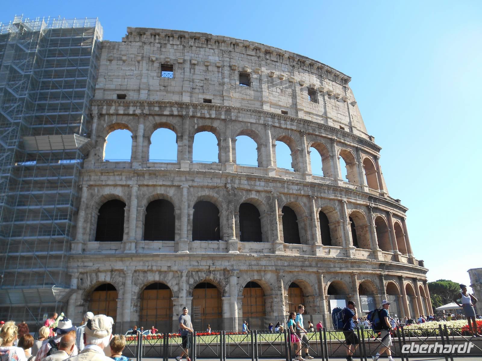 Ein weiterer Höhepunkt unserer Reise stand am Ende des heutigen Besichtigungsprogramms auf dem Programm - das Kolosseum! Hier verließen wir endgültig unseren Bus und besichtigten es anschließend von außen. Kaiser Vespasian begann den Bau 72 n. Chr., sein Sohn Titus weihte die Arena nach nur achtjähriger Bauzeit mit hunderttägigen Festspielen ein. Unzählige Tiere und Gladiatoren wurden geopfert. Sehr lebendig sind allerdings noch die Legionäre, mit denen man hier gegen ein Entgelt für ein Foto posieren kann. Hier hatten wir zum Glück auch noch etwas Freizeit, um uns in den zahlreichen Straßencafés einen leckeren Cappuccino schmecken zu lassen - einfach himmlisch...! Andere Gäste, die noch etwas Energie übrig hatten, konnten jetzt noch das Kolosseum bzw. das Forum Romanum individuell besichtigen. Nach einem leckeren Abendessen in der Innenstadt kehrten wir gemeinsam gegen 21 Uhr zum Hotel zurück. Ein zwar anstrengender, aber auch sehr eindrucksvoller Tag ging nun zu Ende.