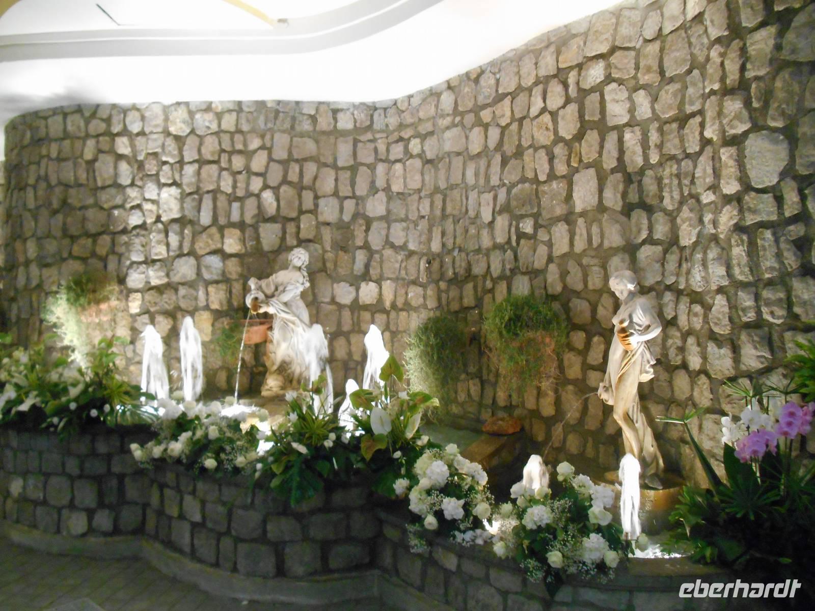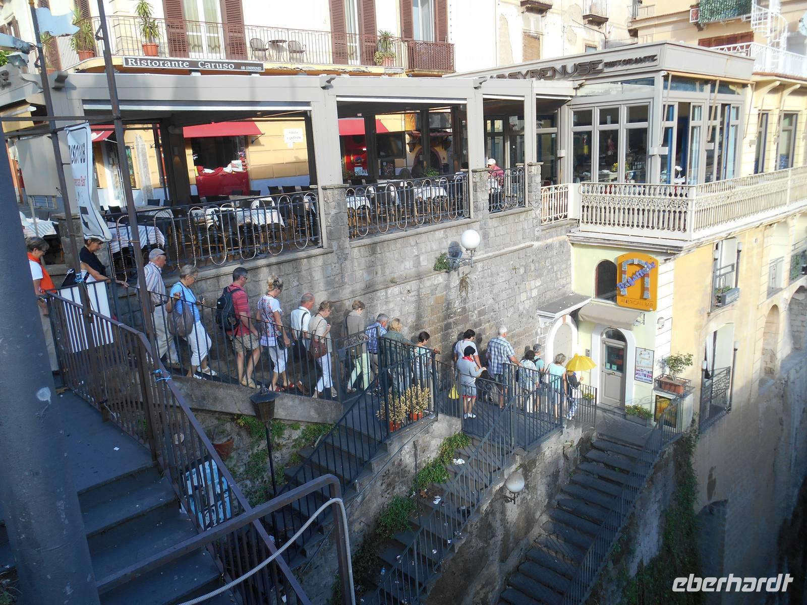 ein Problem... Schlafen konnten wir schließlich zu Hause! Außerdem gab es zum Frühstück extra für uns stärkendes "Roggenmischbrot" - wo gibt es schon so etwas in Süditalien? Wir hatten schönes Wetter und schon von der Terrasse unseres Hotels sahen wir den leuchtenden Kalkfelsblock im Meer - die Insel Capri! Wir fuhren mit dem Bus nach Sorrent und nahmen von dort die Fähre zur Insel Capri. Die Überfahrt dauerte nur etwa 35 Minuten. Schon von weitem türmt sich die Insel wie unzugänglich auf. Zwei durch einen geschwungenen Sattel verbundenen Hochebenen, auf denen die Orte Capri und Anacapri liegen, ineinander geschachtelte Häuserkuben, überragt von gekalkten und bunt gekachelten Kuppeln. Für uns war klar - Capri ist der Kontrast zwischen intensivem Blau des Meers, den strahlend weißen Felswänden und dem tiefen Grün der Vegetation. Wir unternahmen eine Schifffahrt rund um die Insel - die Ausblicke faszinierten uns, schließlich hatten wir auch heute wieder tolles Wetter erwischt! Unsere örtliche Reiseleiterin Claudia erzählte uns so manch nette Episode über die Insel. Bis auf einige Jahrhunderte, als die Präsenz von Piraten Vergnügungsreisen auf die Insel verbot, war Capri seit den Tagen des Augustus Ziel meist betuchter Reisender. Vielen gefiel die Kalkklippe im Meer so gut, dass sie zu Einheimischen wurden. Der erste "Prominente", der auf die Insel ausstieg, war der Nachfolger des vergöttlichten Augustus, Kaiser Tiberius, der die Insel zu einer riesigen Privatvilla umbaute; Mauerreste sind übrigens zum Teil noch deutlich zu sehen. Capri ist heute für das Mittelmeergebiet ein Botanischer Garten, auf so engem Raum lässt sich sonst nirgends die Vielfalt der mittelmeerischen Pflanzenwelt beobachten. Rund 1.000 Arten sind es, davon 150, die nur auf der Insel Capri vorkommen! Für die Geologen sei erwähnt, dass Capri nur die Fortsetzung der Amalfitanischen Halbinsel ist. Rund um die Insel sind über sechzig Höhlen und Grotten zu bewundern. Wir besuchten die beiden Inselorte, Capri und Anacapri - diese beiden Orte leben solange man weiß in Fehde; sie hatten sich voneinander isoliert, erst die im letzten Jahrhundert geschaffene Straßenverbindung brachte eine Veränderung. Wir fuhren in Minibussen auf den engen Straßen der Insel - sehr abenteuerlich! Am späten Nachmittag fuhren wir dann mit der Fähre zurück auf das Festland nach Sorrent. Dieser Abend in Agerola sollte etwas ganz besonderes werden - uns erwartete anschließend ein Gala-Dinner mit Musik & Tanz, ganz einfach ein gelungener Abschluss eines tollen Tages!