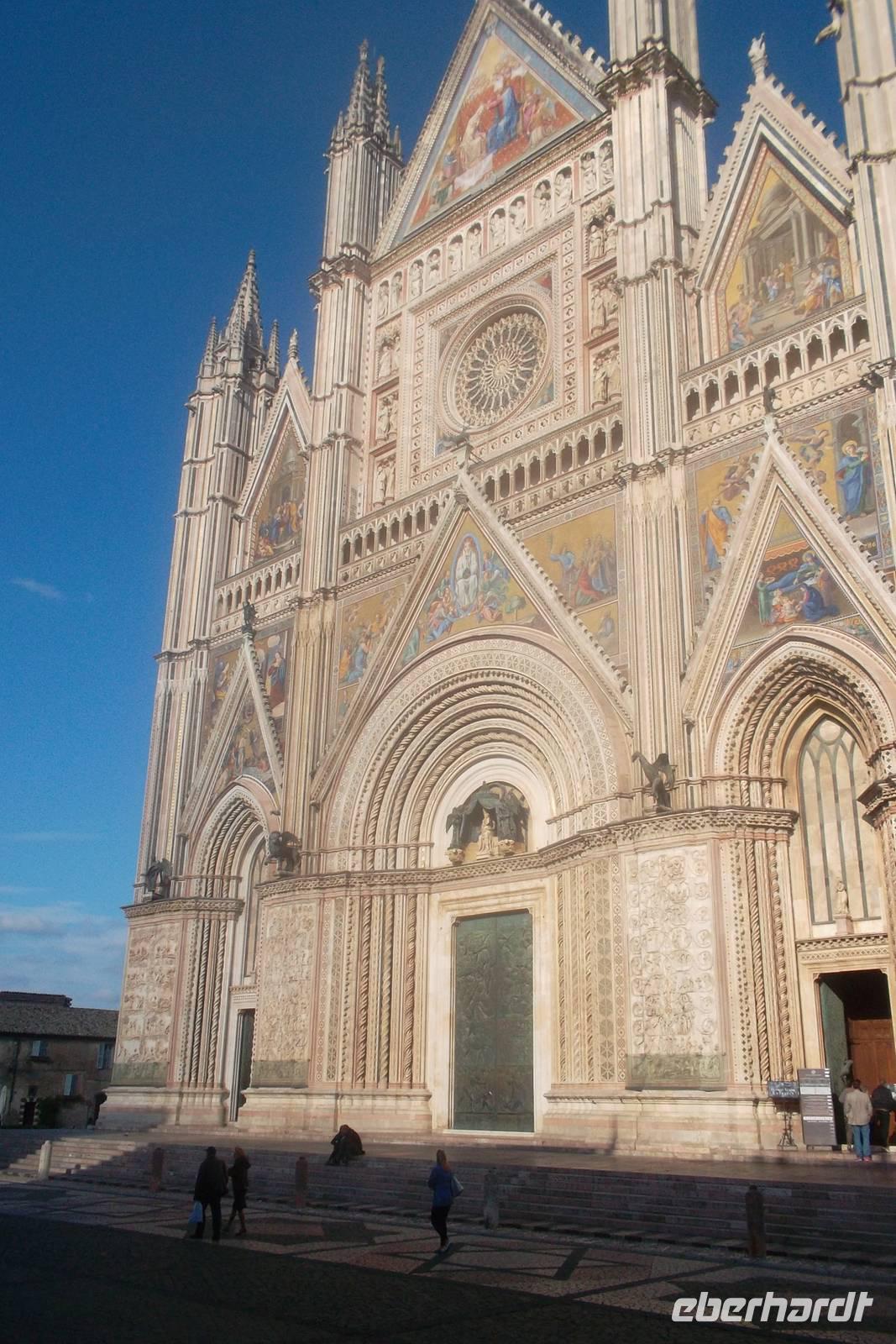 Beim Tageshöhepunkt Orvieto empfing und der örtliche Reiseleiter Marco. Begeistert und mit derr ihm eigenen Emphaser führte er uns durch die einstige päpstliche Residenzstadt, dire nicht nur eine historisch wertvolle, schöne, mittelalterlich erhaltene Altstadt besitzt, sindern deren prächtiger Dom zum Zentrum des katholischen Fronleichnamsfestes wurde. Die gesamte alte Stadt liegt hoch auf einem gewaltigen aber instabilen Tuffsteinkegel, so dass man zum hoch auf einem Felsen gelegen Domplatz erst mit der Seilbahn, dann mit einem kleinen Shuttlebus gelangt. Marcos Erklärungen machten allein das Betrachten der aufwendig gestalteten Domfassade zum Erlebnis. Überwältigend ist aber die Ausmalung der rechten Seitenkapelle, die kein geringerer als Fra Angelico begonnen hat und die der berühmte Luca Signorelli mit seinem „Jüngsten Gericht" und grotesken Freskenmalereien mit Brustbildern berühmter Persönlichkeiten vollende. Insgesamt ist der Duomo als Aufbewahrungsort der Fronleichnams-Reliquie, die an ein hier geschehenes Blutwunder erinnert," mit seiner farbenprächtigen Fassade einer der schönsten Kirchenbauten in Umbrien und wohl auch in ganz Italien. Seine Fassaden sind durch unübertreffliche Bildhauerarbeit eine Art Bilderbuch des Alten und des Neuen Testamentes. Bildhauerkunst gepaart mit der Mosaikleger und Bronzegießer gestaltet die Fassade mit lebendiger Bibelerzählung - drastisch genug für all jene, die die biblischen Geschichten nicht selbst lesen können und sie eben durch Darstellungen vermittelt kriegen...