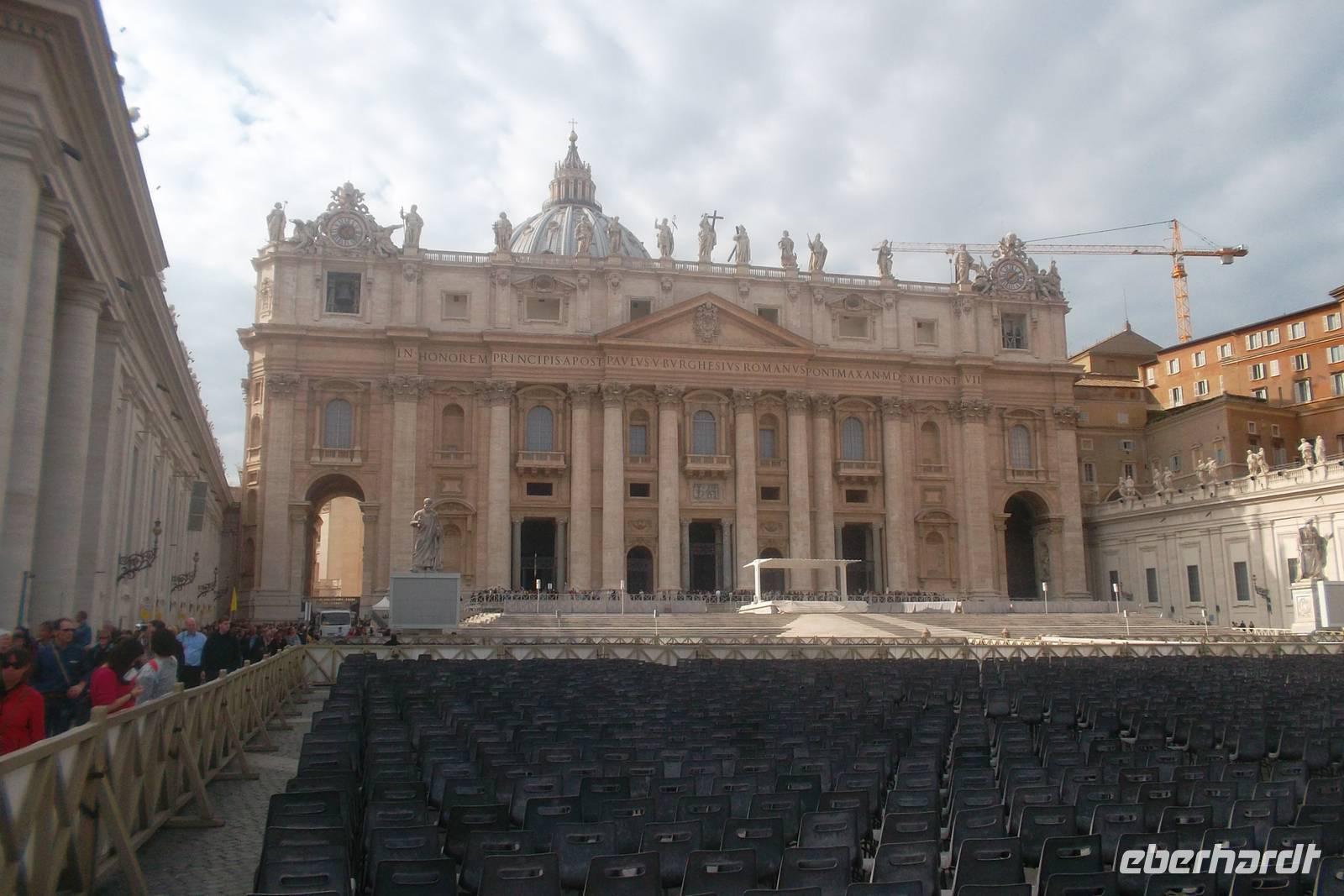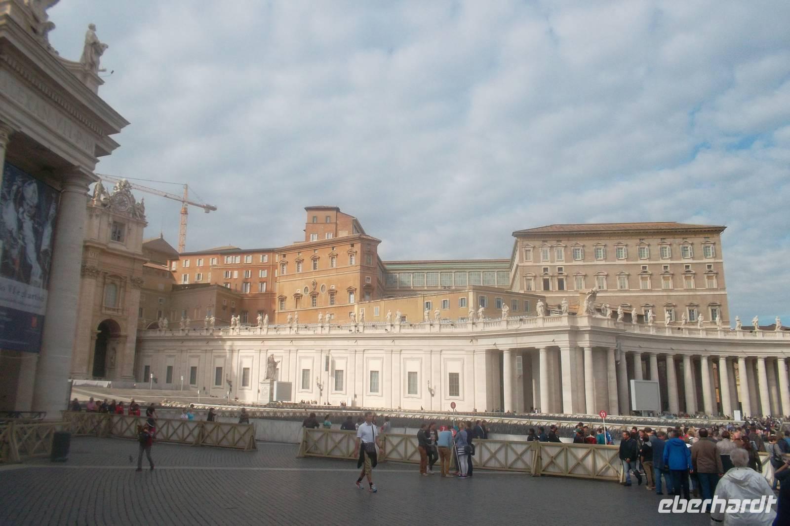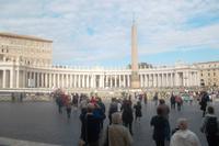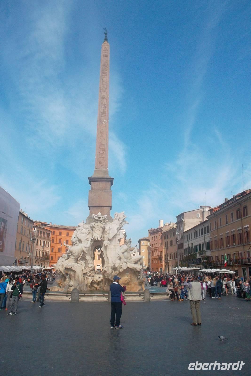 Nach kurzer Fahrt mit einem Linienbus von der Station Colosseum aus gelangten wir zur herrlichen Piazza Navona. Dieser beliebte Treffpunkt der Römer zieht wegen seiner bewundernswerten Bauten natürlich auch viele Touristen an. Der Platz, ein langgezogenes Oval, der an den Stil alter Kaiserforen erinnern soll, entstand aus einem antiken Stadion aus dem 1. Jh. n.Chr.m das im Barock umgebaut wurde. Neben dem gewaltigen Palazzo Pamphilj und der Kirche Sant'Agnese in Agone - errichtet von den Architekten Rainaldi und Borromini ist vor allem der von einem Obelisken gekrönte „Vierströmebrunnen" in der Mitte des Platzes ein phantastischer Blickfang. Der begnadete Gian Lorenzo Bernini schuf diese Komposition einer bewegten Wasserlandschaft aus Anlass des „heiligen Jahres" 1650 im Auftrag des Papstes Innozenz X. und stellte den jeweils wichtigsten Fluss der vier damals bekannten Kontinente durch die Personifikationen von Donau, Nil, Ganges und Rio de la Plata dar. Hier, an diesem herrlichen Platz, verbrachten wir unsere Mittagspause, bevor wir - wieder mit dem öffentlichen Bus - zum Petersplatz fuhren.