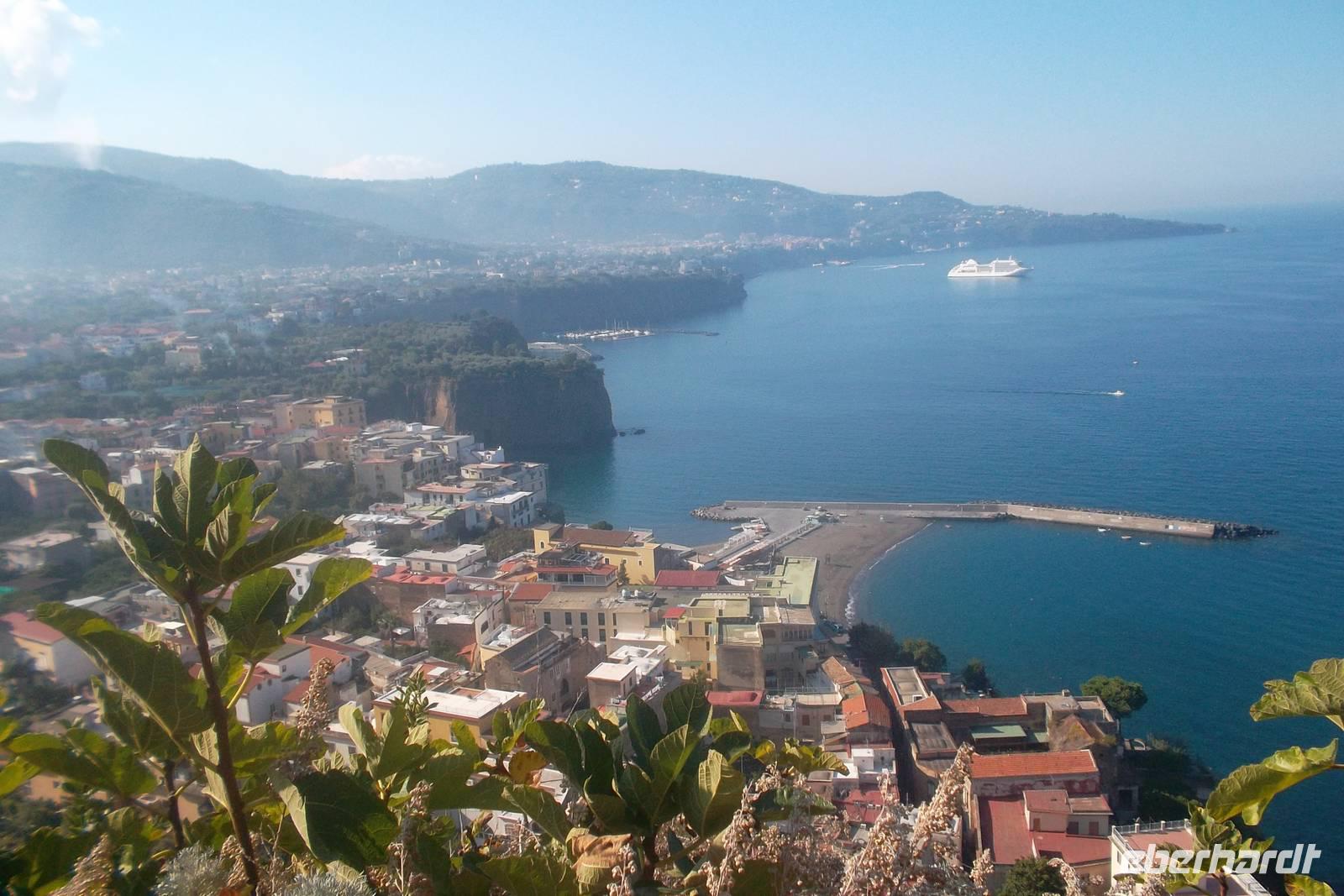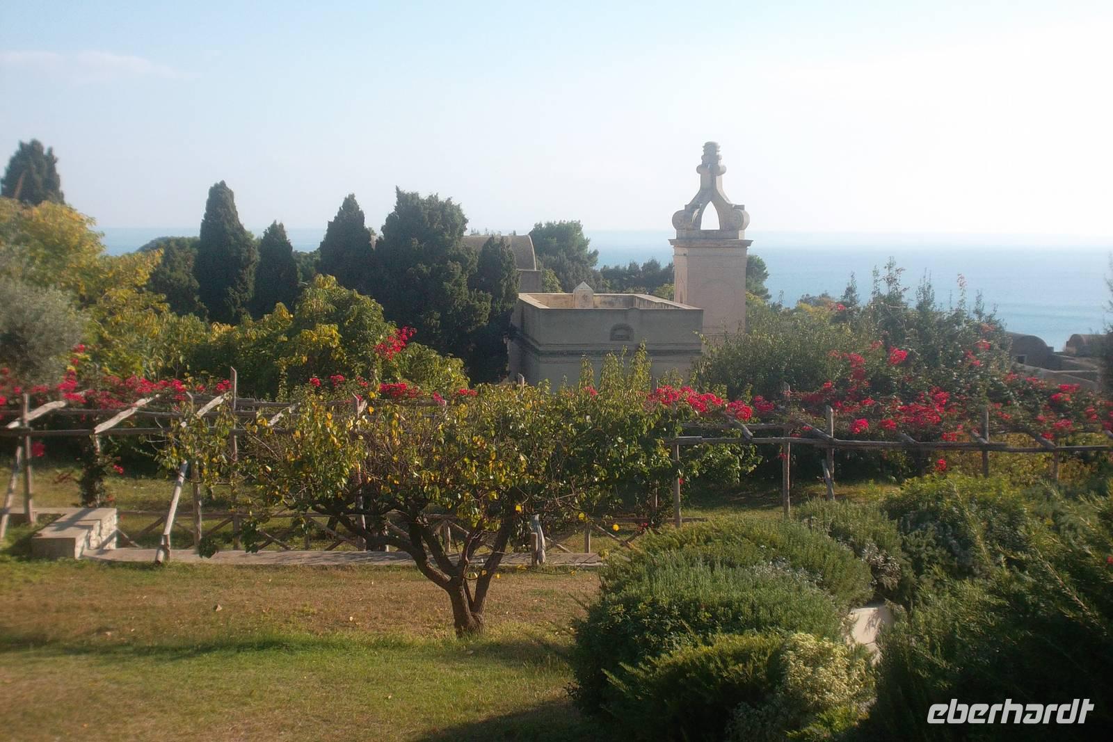 Wieder an Land widmeten wir uns ganz der Insel Capri mit ihrer großen Pflanzenvielfalt. Sie wirkt wie ein riesiger Botanischer Garten, denn als Besonderheit kommen von der gesamten Artenvielfalt der mediterranen Vegetation 150 Arten nur auf der Insel Capri vor. In Minibussen besuchten wir die beiden Inselorte - zuerst Anacapri und später Capri - und allein die Fahrten auf den engen Strassen der Insel waren ein kleines Abenteuer an sich. Mittagspause legten wir in Anacapri ein und hatten hier Gelegenheit zum Besuch der Villa Michele, einst Domizil des hier berühmten schwedischen Arztes und Schriftstellers Axel Munthe oder aber - neben dem Mittagessen mit Inselspezialitäten - die Möglichkeit, mit dem Sessellift auf den Hausberg Monte Solaro zu fahren. Von hier konnte man einen phantastischen Ausblick genießen. Im Ort Capri , berühmt für seine „Piazetta", den winzigen Stadtplatz, auf dem sich früher berühmte Schauspieler und bekannte Persönlichkeiten abends ein Stelldichein gaben, besuchten wir dann noch am Nachmittag noch die Gärten des Augustus. Eindrucksvolle Ausblicke auf die Felswände der Steilküste und die Faraglioni-Felsen mitten im Meer rundeten den Capri-Aufenthalt ab. hatten. Nachdem die Schnellfähre uns später zurück auf das Festland nach Sorrent gebracht hatte, organisierten wir einen Shuttlebus zum Busparkplatz, damit wir mehrere Kilometer Fußmarsch und hunderte Stufen bis in die Innenstadt von Sorrent einsparen konnten, um rechtzeitig in unserem Luxushotel in Agerola zum wieder einmal landestypisch-leckeren Abendessen zurück zu sein.