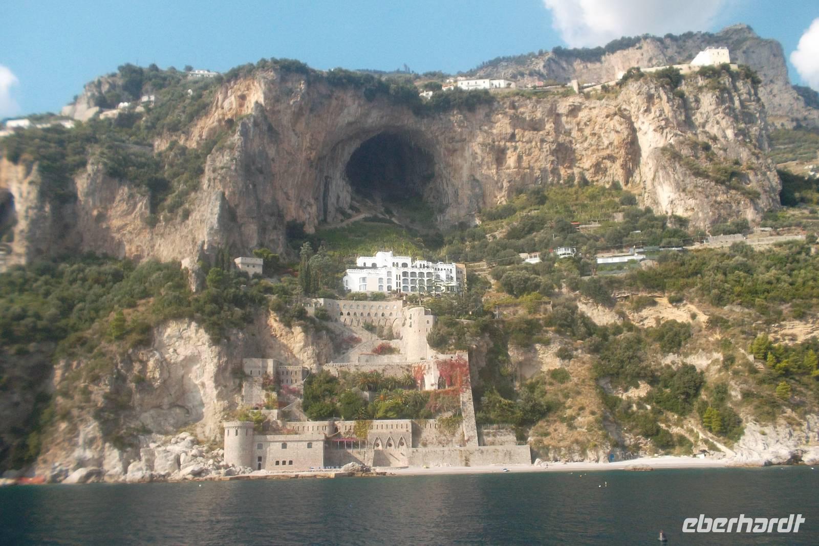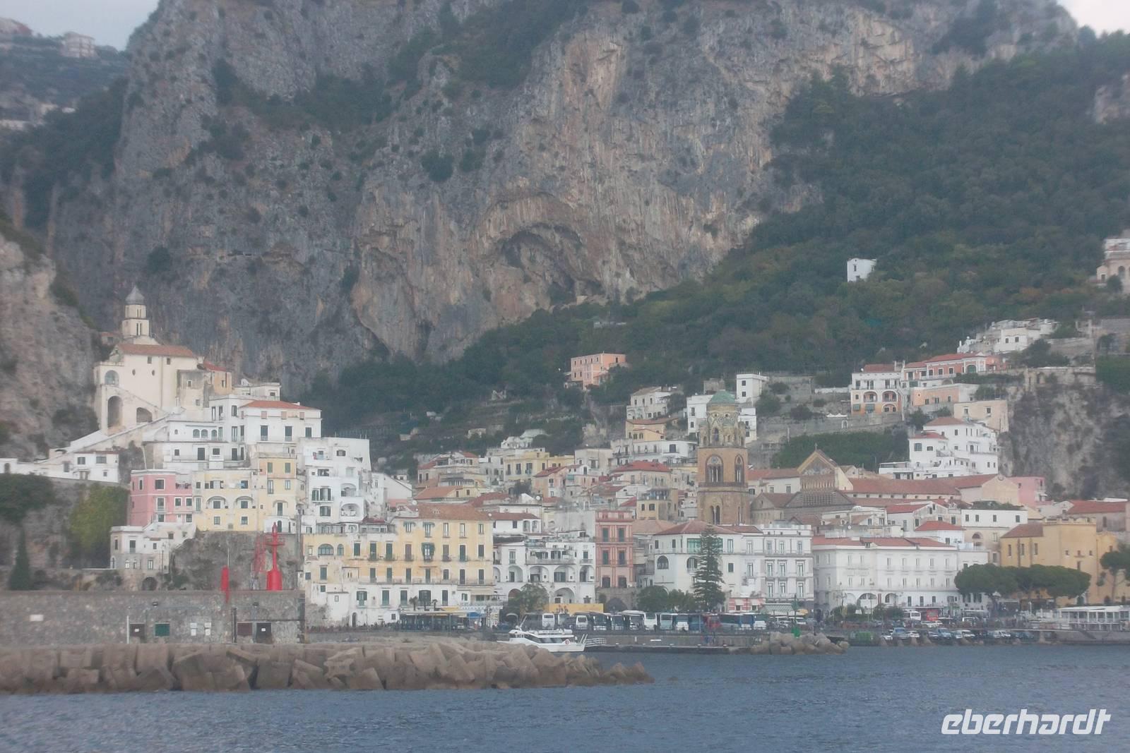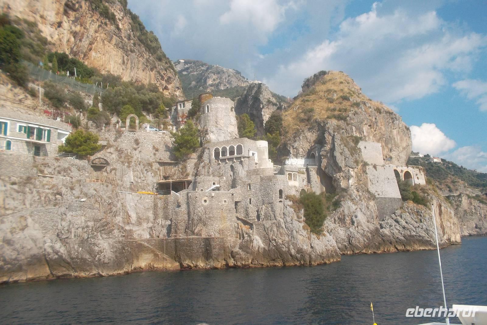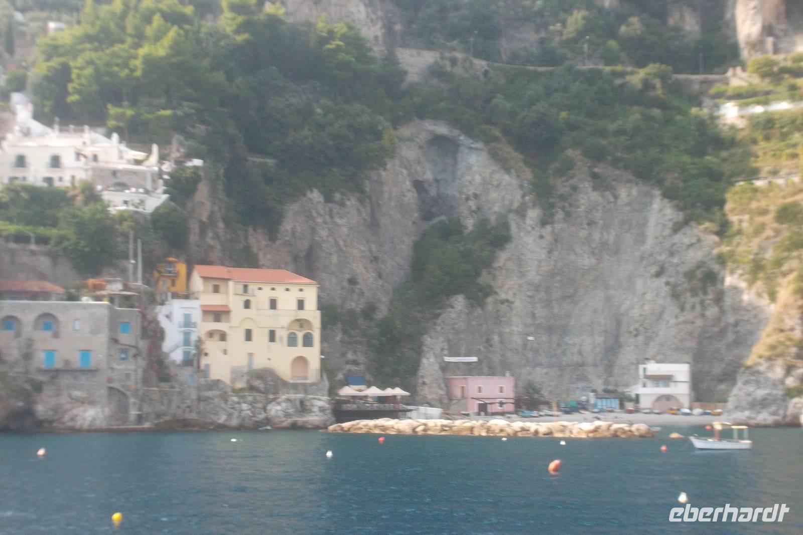 Die landschaftlich unvergleichliche Amalfiküste, einer der schönsten Küstenabschnitte der Welt, stand heute auf unserem Tagesprogramm. Die kurvenreiche „Amalfitana" mit ihrer relativ schmalen Straße und oft zugeparkten Ortsdurchfahrten ist neben ihrer vielbesungenen Schönheit auch eine der risikoreichsten Strecken an der europäischen Mittelmeerküste. Daher darf diese beliebte Küstenstraße nicht mehr von fremden Bussen über 10,30 m Länge befahren werden. Unsere Bus und sein Fahrer Bernd hatten also heute Pause und die Tagestour erfolgte in einem italienischen Bus für uns. Nach einem Fotostopp kurz vor Sorrent nahmen wir die örtliche Reiseleiterin Claudia an Bord, die sogleich Wissenswertes über den gerade befahrenen Landstrich berichtete. Bis Positano häuften sich die schönen Ausblicke, obwohl aufgrund der Verkehrsregelung nur an einer Stelle ein Fotostopp möglich war. Dann hatten wir die Wahl: entweder den denkmalgeschützten Ort Positano sehen, aber dann musste der Bus weiterfahren und wir kamen nur per Boot weg oder wir bleiben im Bus, sehen Positano nicht und folgen den Kurven der Amalfitana, deren Sehenswertestes unterhalb der Straße liegt. Also entschieden wir uns dafür, die Strecke zu teilen und fakultativ von Positano bis Amalfi mit dem Boot zu fahren. Wir taten recht daran, denn die hübschesten Gesteinsformationen und die interessantesten Bauten konnte man nur vom Wasser aus sehen