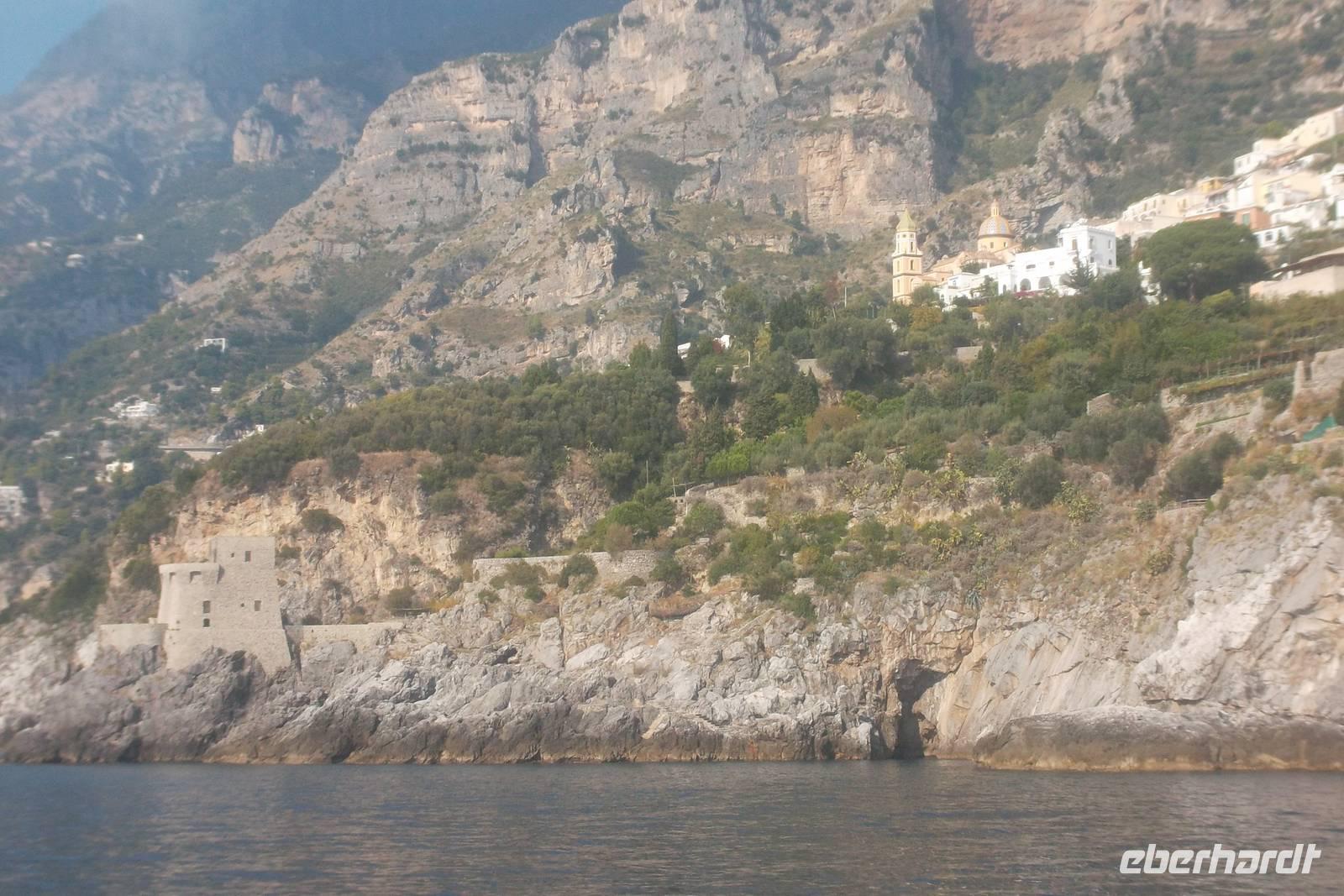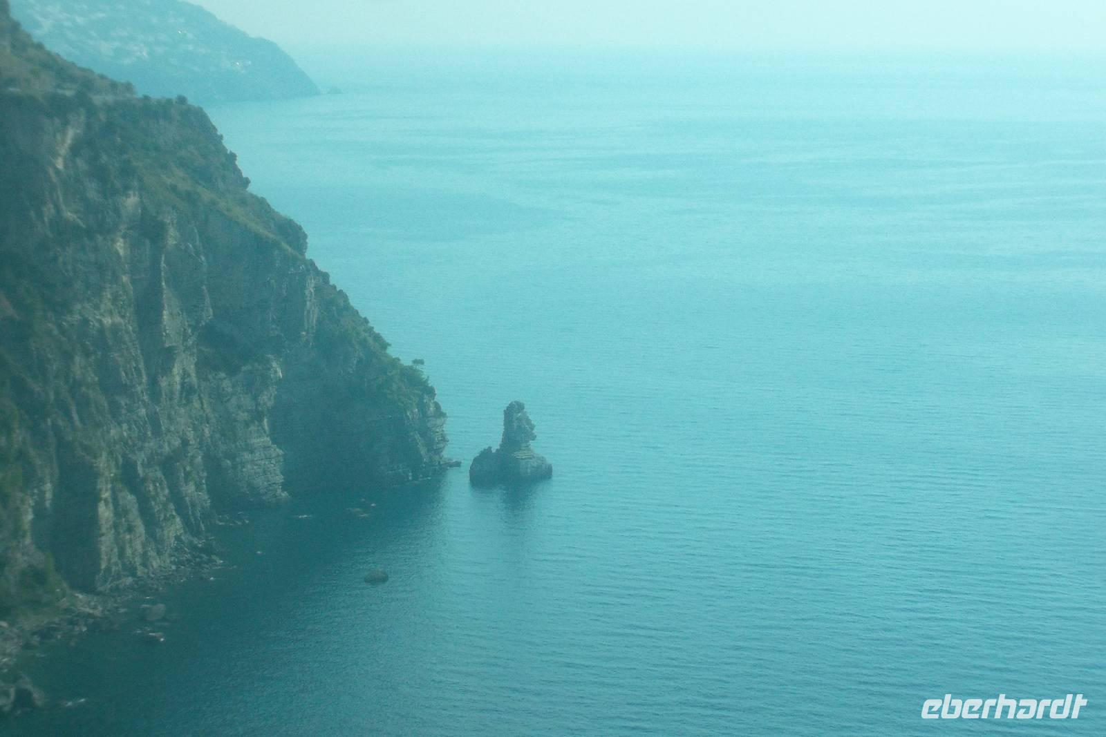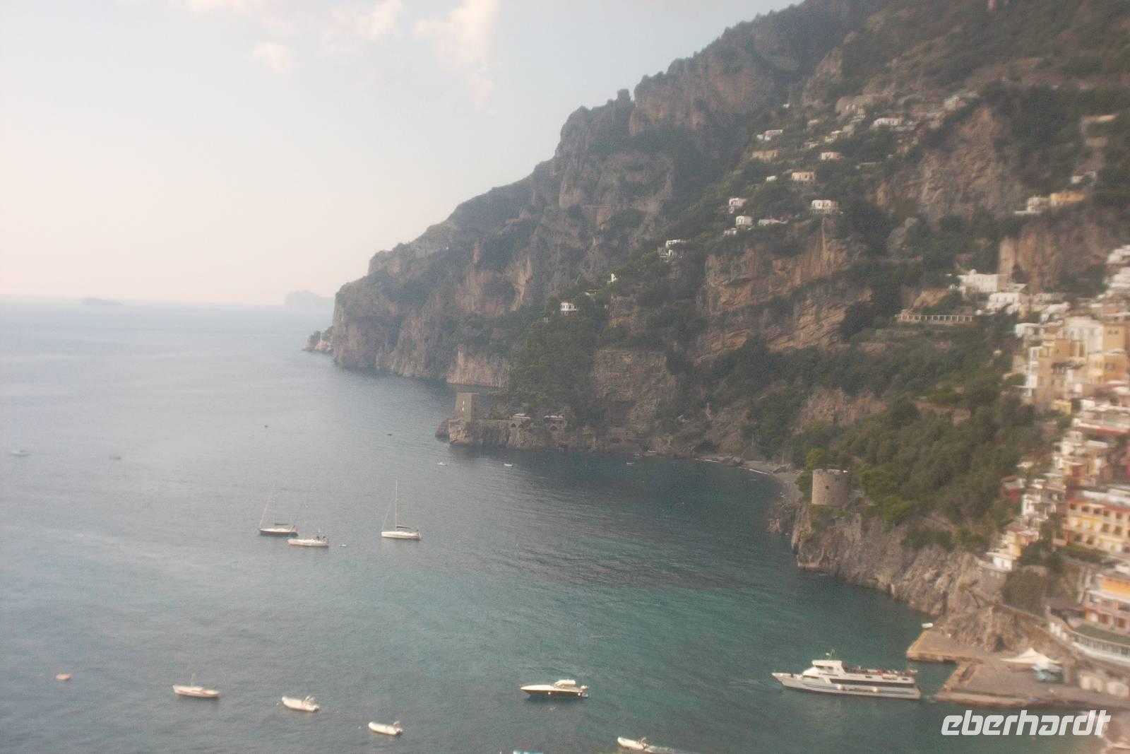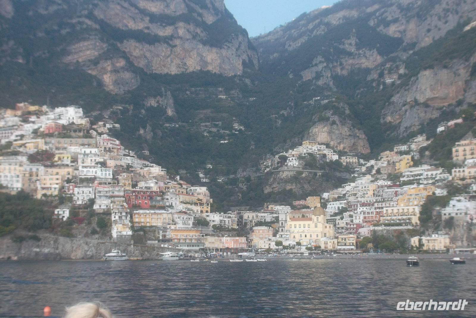 Die landschaftlich unvergleichliche Amalfiküste, einer der schönsten Küstenabschnitte der Welt, stand heute auf unserem Tagesprogramm. Die kurvenreiche „Amalfitana" mit ihrer relativ schmalen Straße und oft zugeparkten Ortsdurchfahrten ist neben ihrer vielbesungenen Schönheit auch eine der risikoreichsten Strecken an der europäischen Mittelmeerküste. Daher darf diese beliebte Küstenstraße nicht mehr von fremden Bussen über 10,30 m Länge befahren werden. Unsere Bus und sein Fahrer Bernd hatten also heute Pause und die Tagestour erfolgte in einem italienischen Bus für uns. Nach einem Fotostopp kurz vor Sorrent nahmen wir die örtliche Reiseleiterin Claudia an Bord, die sogleich Wissenswertes über den gerade befahrenen Landstrich berichtete. Bis Positano häuften sich die schönen Ausblicke, obwohl aufgrund der Verkehrsregelung nur an einer Stelle ein Fotostopp möglich war. Dann hatten wir die Wahl: entweder den denkmalgeschützten Ort Positano sehen, aber dann musste der Bus weiterfahren und wir kamen nur per Boot weg oder wir bleiben im Bus, sehen Positano nicht und folgen den Kurven der Amalfitana, deren Sehenswertestes unterhalb der Straße liegt. Also entschieden wir uns dafür, die Strecke zu teilen und fakultativ von Positano bis Amalfi mit dem Boot zu fahren. Wir taten recht daran, denn die hübschesten Gesteinsformationen und die interessantesten Bauten konnte man nur vom Wasser aus sehen