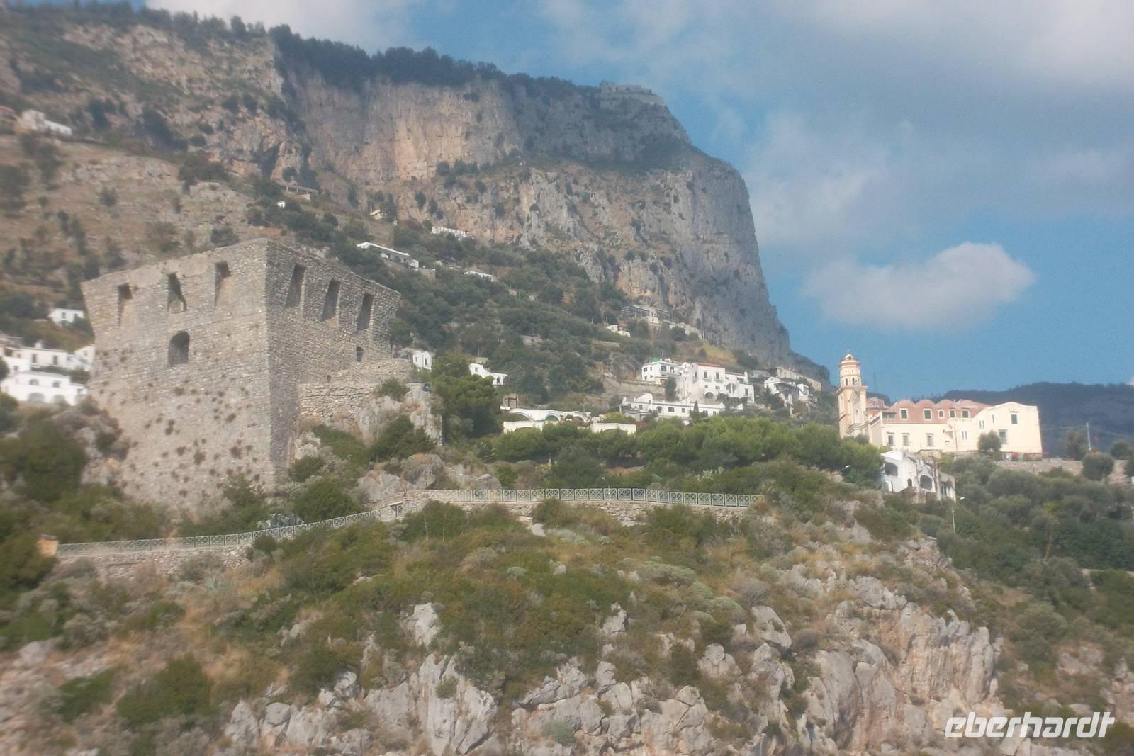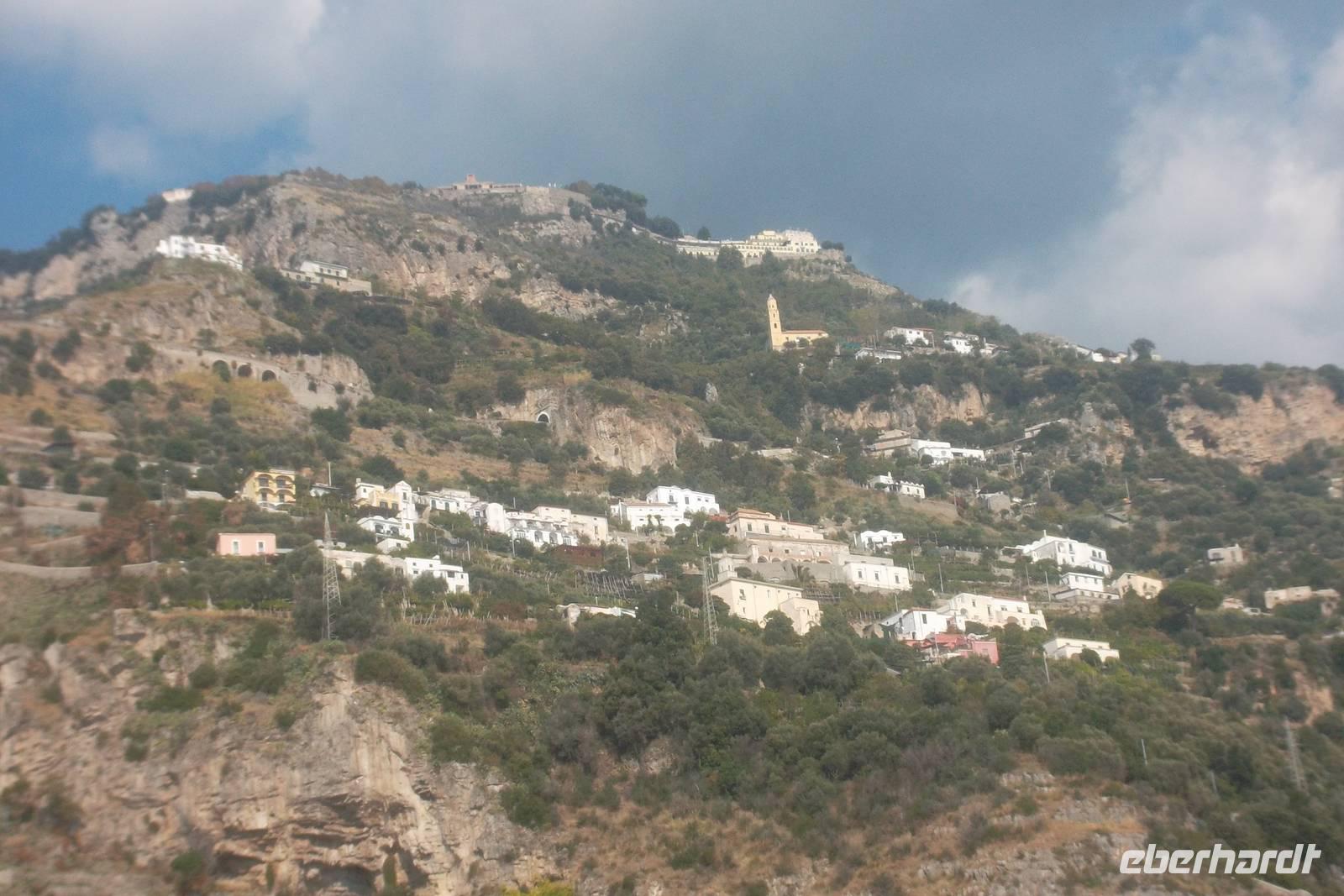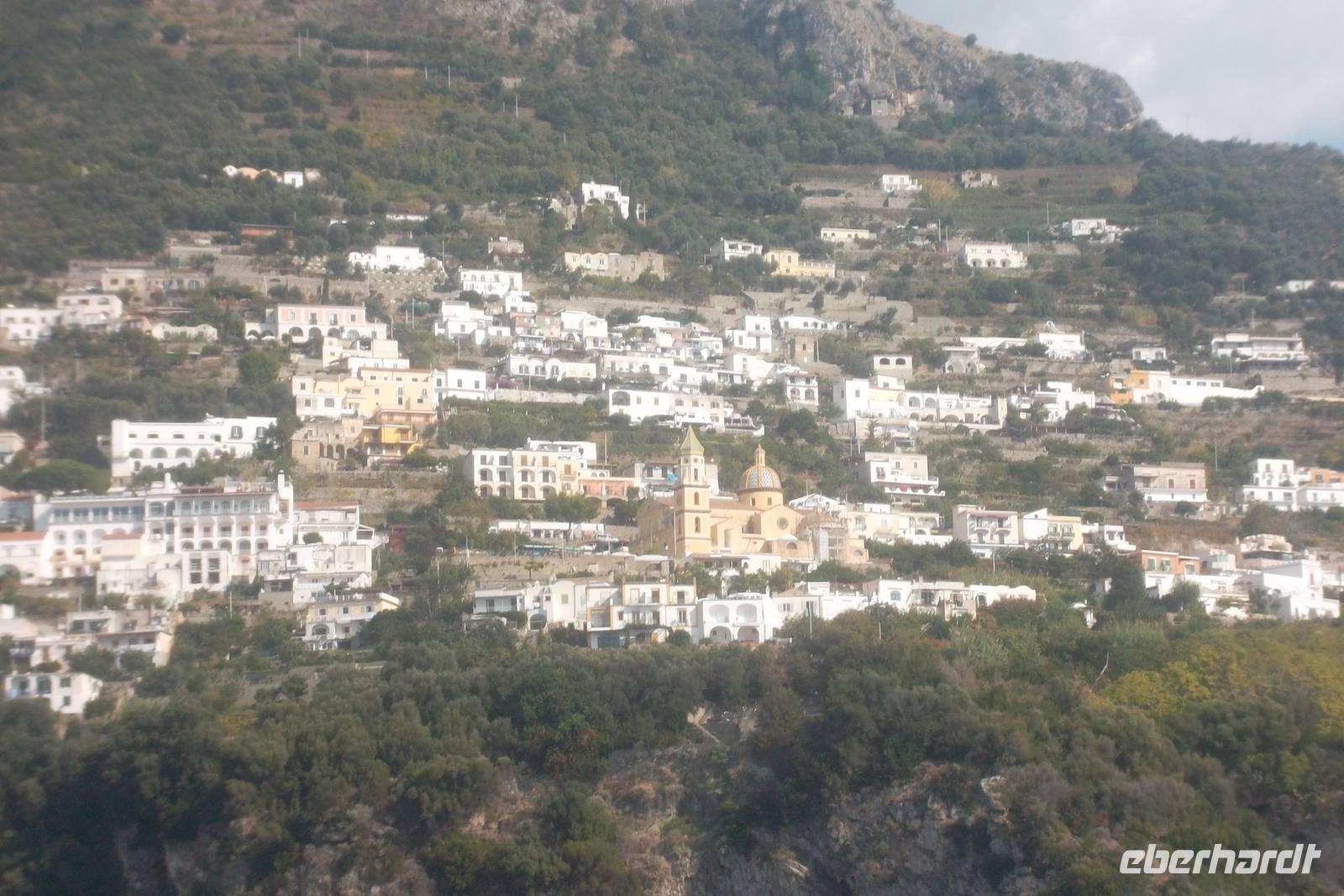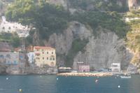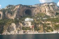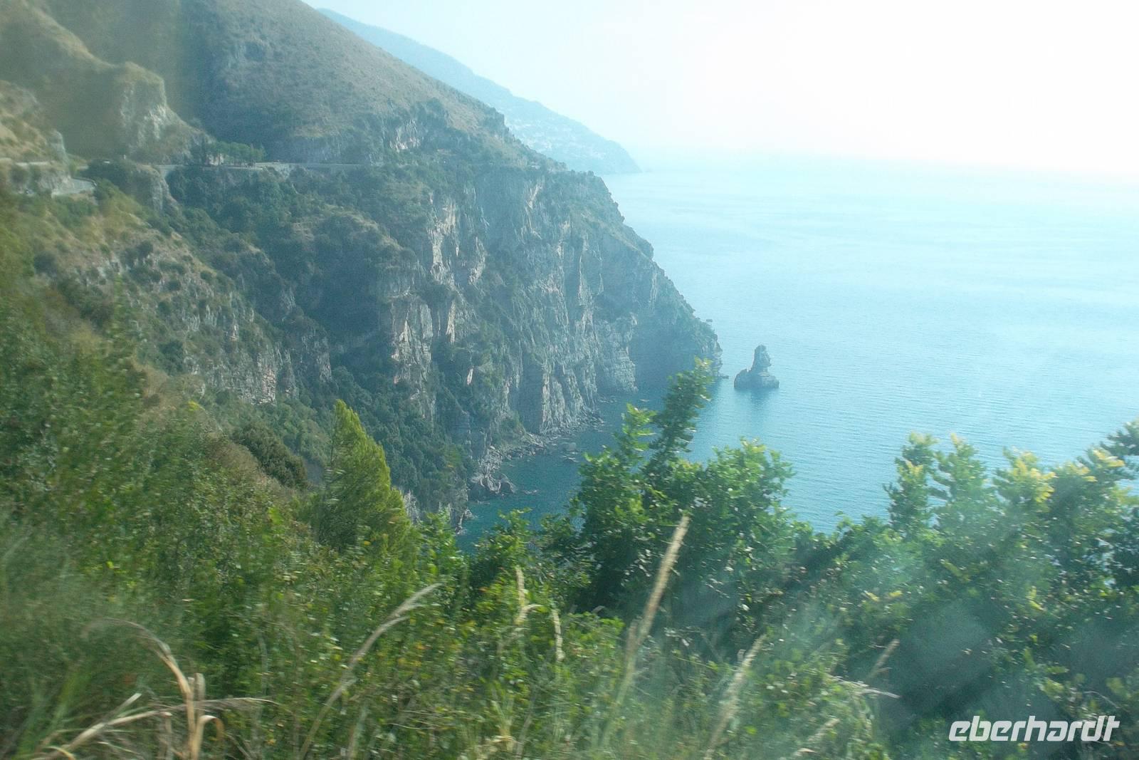 Die landschaftlich unvergleichliche Amalfiküste, einer der schönsten Küstenabschnitte der Welt, stand heute auf unserem Tagesprogramm. Die kurvenreiche „Amalfitana" mit ihrer relativ schmalen Straße und oft zugeparkten Ortsdurchfahrten ist neben ihrer vielbesungenen Schönheit auch eine der risikoreichsten Strecken an der europäischen Mittelmeerküste. Daher darf diese beliebte Küstenstraße nicht mehr von fremden Bussen über 10,30 m Länge befahren werden. Unsere Bus und sein Fahrer Bernd hatten also heute Pause und die Tagestour erfolgte in einem italienischen Bus für uns. Nach einem Fotostopp kurz vor Sorrent nahmen wir die örtliche Reiseleiterin Claudia an Bord, die sogleich Wissenswertes über den gerade befahrenen Landstrich berichtete. Bis Positano häuften sich die schönen Ausblicke, obwohl aufgrund der Verkehrsregelung nur an einer Stelle ein Fotostopp möglich war. Dann hatten wir die Wahl: entweder den denkmalgeschützten Ort Positano sehen, aber dann musste der Bus weiterfahren und wir kamen nur per Boot weg oder wir bleiben im Bus, sehen Positano nicht und folgen den Kurven der Amalfitana, deren Sehenswertestes unterhalb der Straße liegt. Also entschieden wir uns dafür, die Strecke zu teilen und fakultativ von Positano bis Amalfi mit dem Boot zu fahren. Wir taten recht daran, denn die hübschesten Gesteinsformationen und die interessantesten Bauten konnte man nur vom Wasser aus sehen