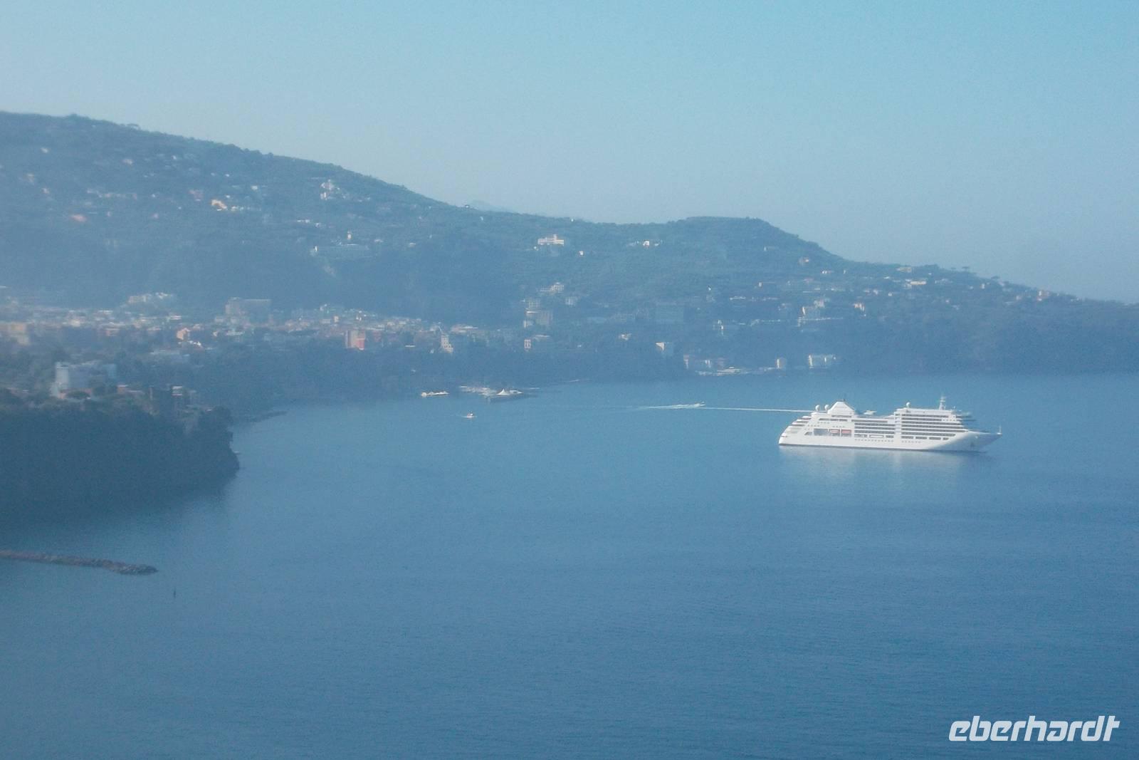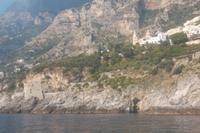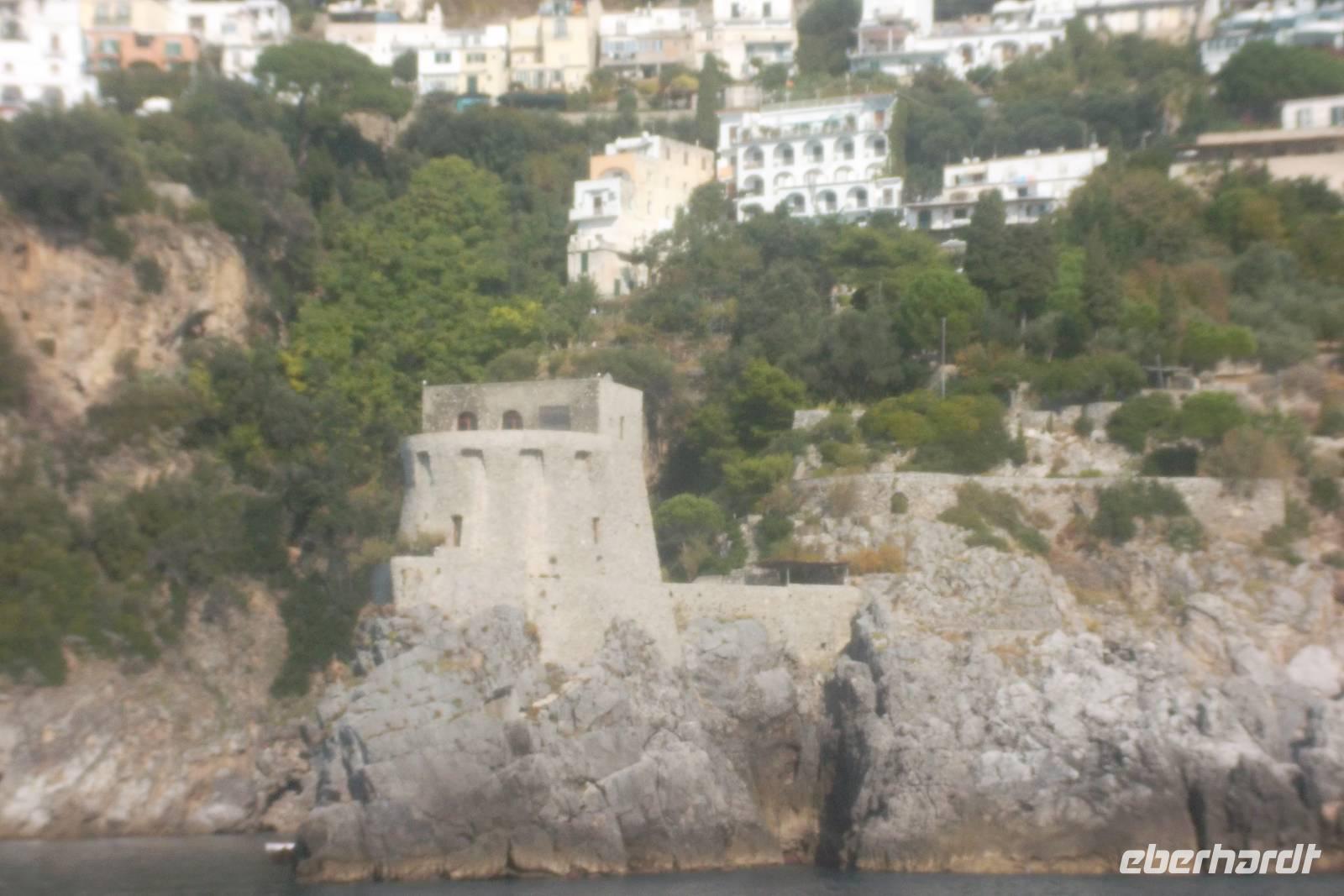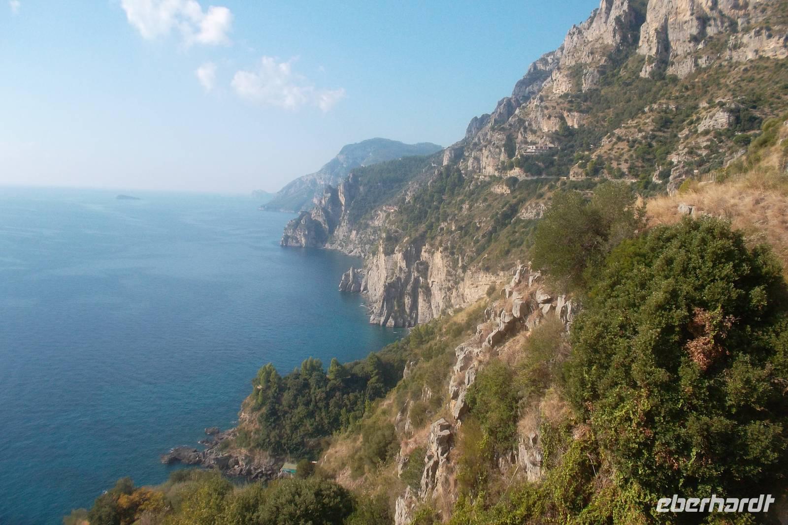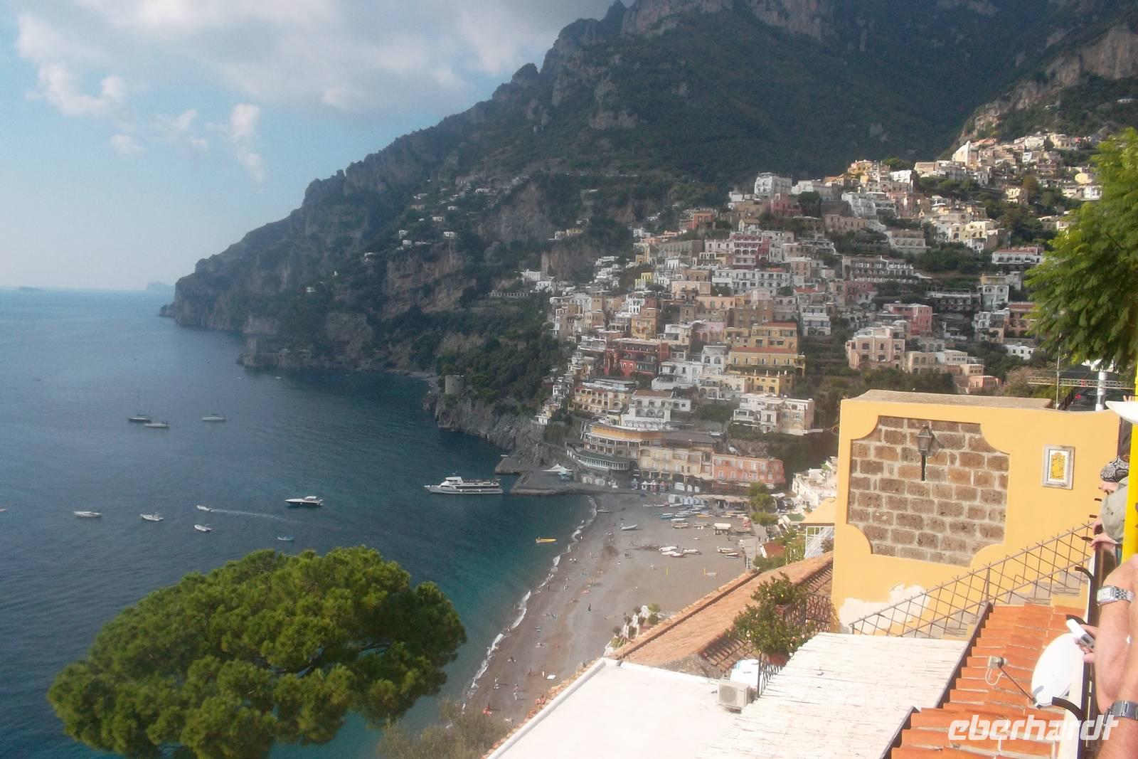 Die landschaftlich unvergleichliche Amalfiküste, einer der schönsten Küstenabschnitte der Welt, stand heute auf unserem Tagesprogramm. Die kurvenreiche „Amalfitana" mit ihrer relativ schmalen Straße und oft zugeparkten Ortsdurchfahrten ist neben ihrer vielbesungenen Schönheit auch eine der risikoreichsten Strecken an der europäischen Mittelmeerküste. Daher darf diese beliebte Küstenstraße nicht mehr von fremden Bussen über 10,30 m Länge befahren werden. Unsere Bus und sein Fahrer Bernd hatten also heute Pause und die Tagestour erfolgte in einem italienischen Bus für uns. Nach einem Fotostopp kurz vor Sorrent nahmen wir die örtliche Reiseleiterin Claudia an Bord, die sogleich Wissenswertes über den gerade befahrenen Landstrich berichtete. Bis Positano häuften sich die schönen Ausblicke, obwohl aufgrund der Verkehrsregelung nur an einer Stelle ein Fotostopp möglich war. Dann hatten wir die Wahl: entweder den denkmalgeschützten Ort Positano sehen, aber dann musste der Bus weiterfahren und wir kamen nur per Boot weg oder wir bleiben im Bus, sehen Positano nicht und folgen den Kurven der Amalfitana, deren Sehenswertestes unterhalb der Straße liegt. Also entschieden wir uns dafür, die Strecke zu teilen und fakultativ von Positano bis Amalfi mit dem Boot zu fahren. Wir taten recht daran, denn die hübschesten Gesteinsformationen und die interessantesten Bauten konnte man nur vom Wasser aus sehen