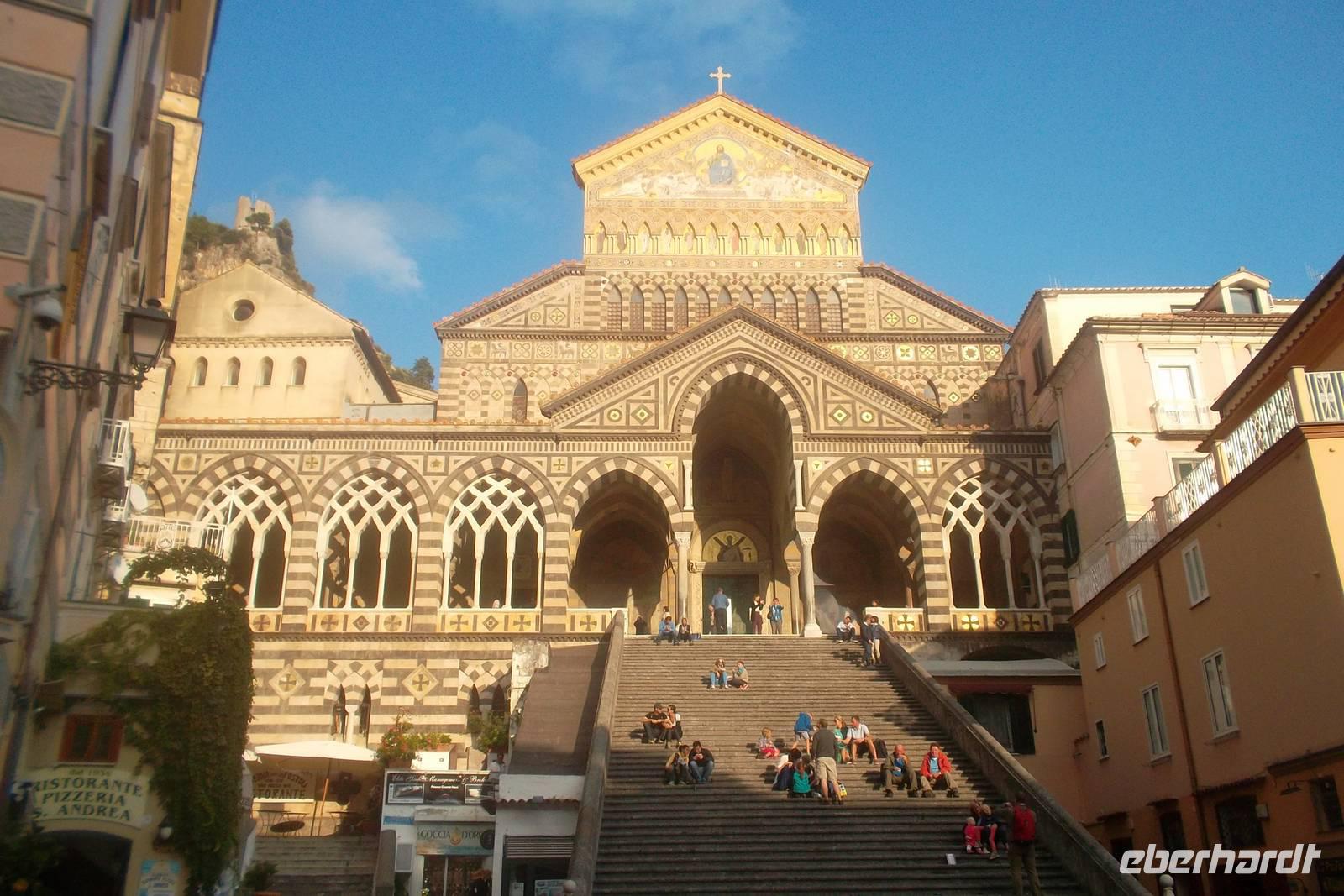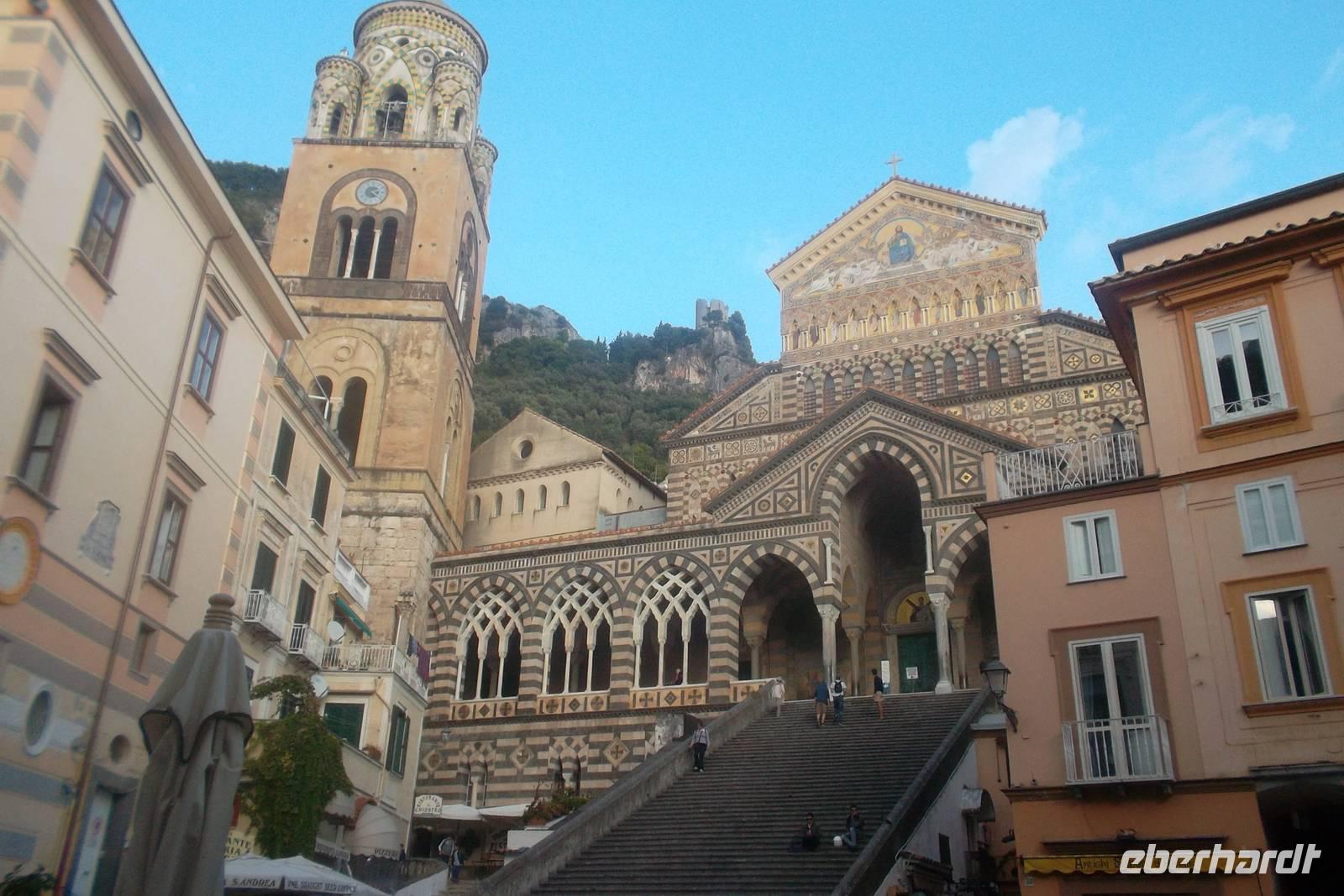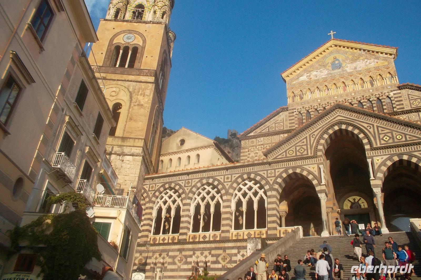 Eindrucksvoll war dann auch die Anfahrt von See her auf den Hafen der alten Seerepublik Amalfi. Bis heute ist die Vergangenheit des kleinen Städtchens als einst eine der führenden Seerepubliken des Mittelmeeres neben Pisa, Genua und Venedig in ihrem Wappen lebendig, das sich sogar in der Flagge der italienischen Kriegs- und Handelsmarine wiederfindet. Von der Stadt bezaubert vor allem der einzigartige Dom mit den Gebeinen des Schutzheiligen Andreas. Äußerlich stellt die Kathedrale einen Höhepunkt romanischer Baukunst dar - auch wenn das Innere mehrfach umgestaltet wuirde und heute klar dem Barock zuzuordnen ist. Danach gab es noch Gelegenheit, das kleine Stadtzentrum auf eigene Faust zu erkunden und vielleicht noch ein Eis zu essen, bevor es am späten Nachmittags zurück in unser Hotel ging.