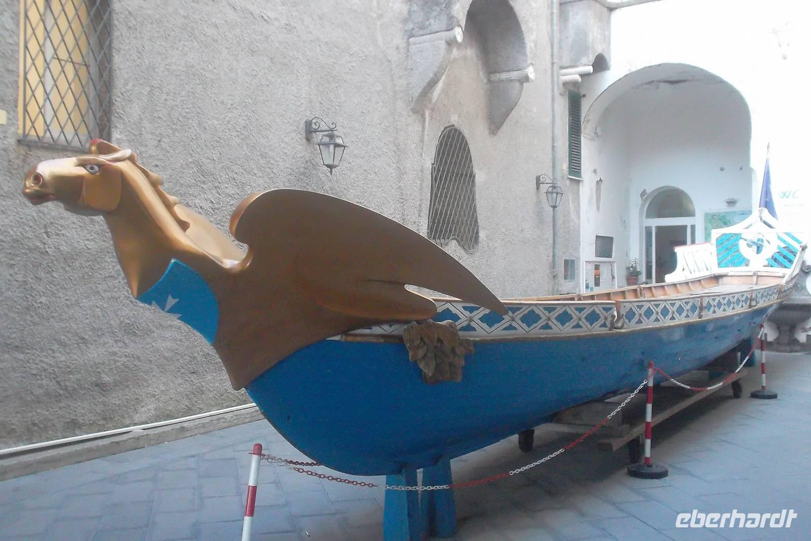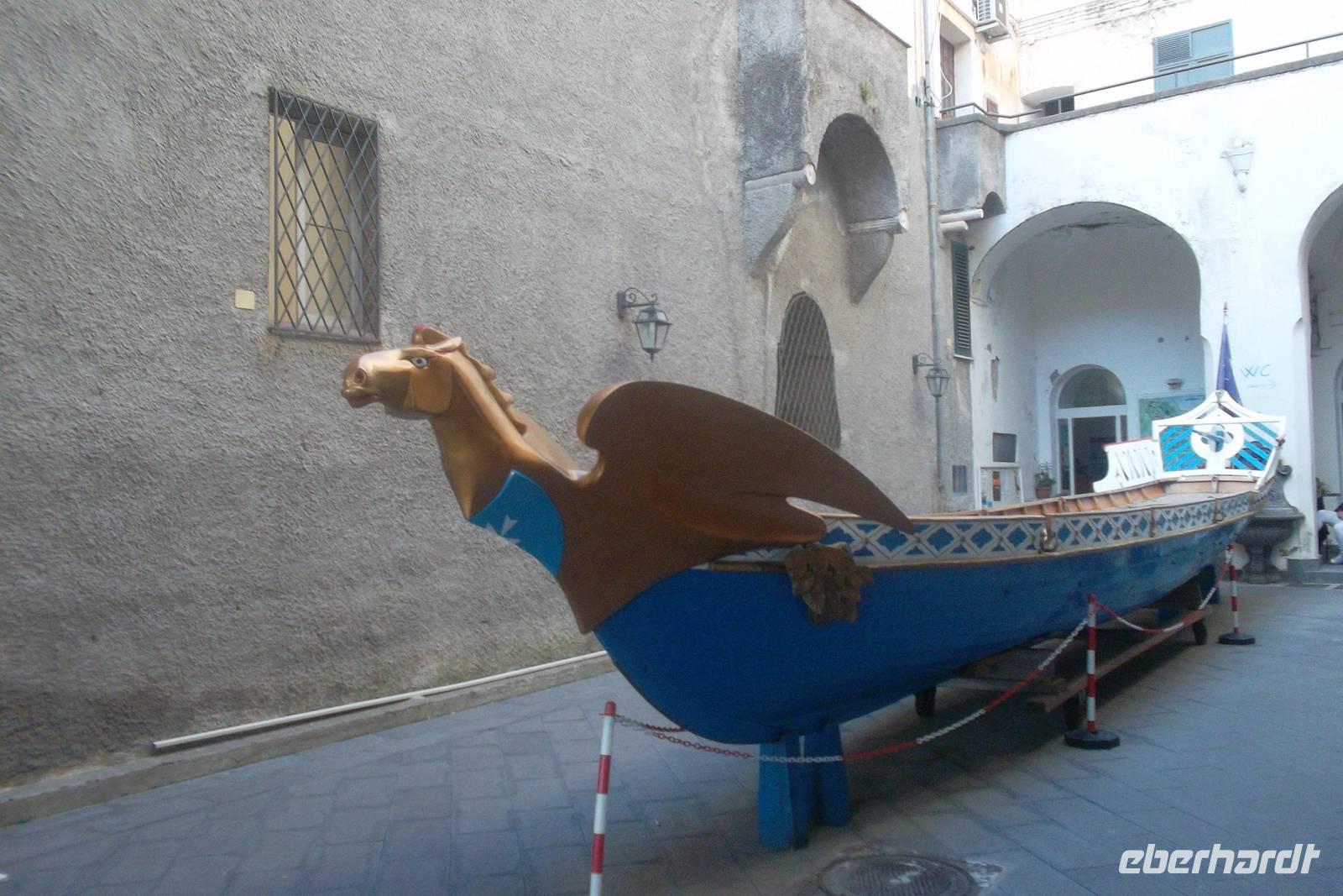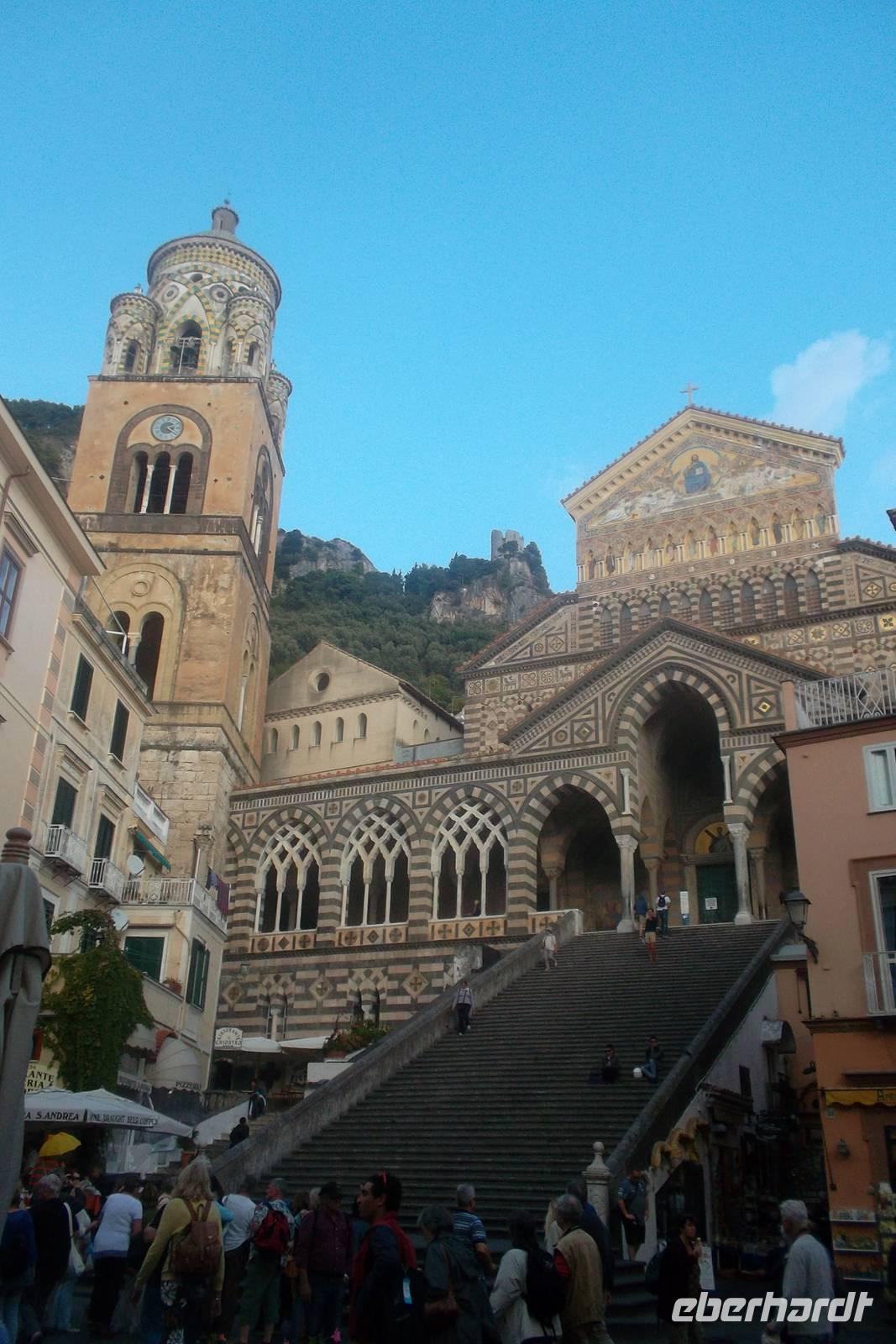Eindrucksvoll war dann auch die Anfahrt von See her auf den Hafen der alten Seerepublik Amalfi. Bis heute ist die Vergangenheit des kleinen Städtchens als einst eine der führenden Seerepubliken des Mittelmeeres neben Pisa, Genua und Venedig in ihrem Wappen lebendig, das sich sogar in der Flagge der italienischen Kriegs- und Handelsmarine wiederfindet. Von der Stadt bezaubert vor allem der einzigartige Dom mit den Gebeinen des Schutzheiligen Andreas. Äußerlich stellt die Kathedrale einen Höhepunkt romanischer Baukunst dar - auch wenn das Innere mehrfach umgestaltet wuirde und heute klar dem Barock zuzuordnen ist. Danach gab es noch Gelegenheit, das kleine Stadtzentrum auf eigene Faust zu erkunden und vielleicht noch ein Eis zu essen, bevor es am späten Nachmittags zurück in unser Hotel ging.