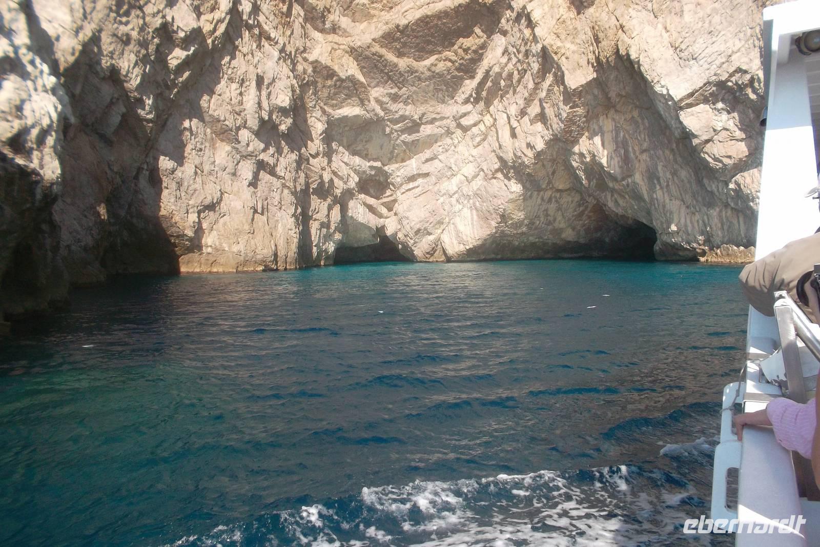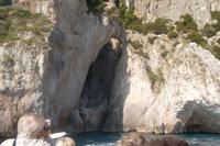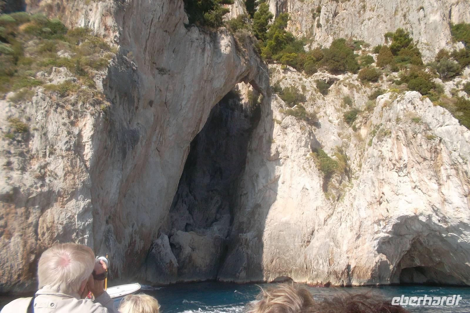 Ein fakultativer Ausflug auf die vielbesungene Insel Capri stand heute auf dem Programm - allerdings fakultativ. Wer lieber in Agerola faulenzen wollte, der konnte in Ruhe ausschlafen, während wir Ausflügler recht früh aufbrechen mussten, denn mit Bus und Fähre und wieder Bus würde es ein langer Tag werden. Also fuhren die meisten Mitreisenden mit mir nach frühem Frühstück mit unserem Bus nach Sorrent, dem Hauptort der gleichnamigen Halbinsel und Fährhafen zur Insel Capri. Schon nach kurzer Zeit legte von hier unsere Fähre ab und brachte uns in etwas mehr als einer halben Stunde zur Insel Capri, die von weitem recht unnahbar aussieht. Der Ein druck täuscht aber, denn der „große Hafen", - Marina Grande - empfing die Besucher recht gastlich. Die beiden die Insel beherrschenden Orte Capri und Anacapri weisen am Hang hochgestaffelte Häuser auf, die von fern wie ineinandergeschachtelt wirken, umgeben von überaus schroffen Felsen. Der helle Kalkstein erhebt sich jäh aus dem intensiven Blau des Meeres und das Farbspiel gipfelt in der Krönung durch das satte Grün der Vegetation. All dies - unterbrochen durch die Farbtupfer kaum zu überschauender Blumenpracht - macht das Erscheinungsbild von Capri aus, einer Insel, die wie ein „Gesamtkunstwerk" wirkt und -obwohl wir sie einen ganzen Tag bereisten - immer noch ein wenig „unwirklich" erscheint. Als erstes - um die Gunst der Stunde ohne gewaltigen Touristenansturm und das herrliche Sonnenlicht des Morgens zu nutzen - begaben wir unsd auf eine einzigartige Bootsrundfahrt ganz herum um die Insel. Das Wetter war herrlich und wir konnten die unglaublichsten An- und Ausblicke erleben: der berühmten blauen folgten die grüne, weiße und die rote Grotte, die Steilabhänge der Felsen und als besonderer Höhepunkt die Fahrt durch die Faraglioni Felsen, Das ist wörtlich zu nehmen, denn der mittlere der drei Felstürme weist einen Durchbruch auf, den wir per Boot durchquerten. Phantastisch war das Gefühl der Durchfahrt durch diese sogenannte Liebesgrotte.