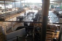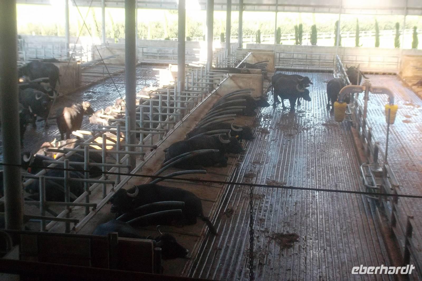Die Büffelställe sind vollautomatisch und es ist fast unwirklich, dabei zuzusehen, wie sich die Büffel von selbst bei der vollautomatischen Melkmaschine anstellen und zu ihrer Bequemlichkeit die aufgehängten Massagebürsten nutzen.