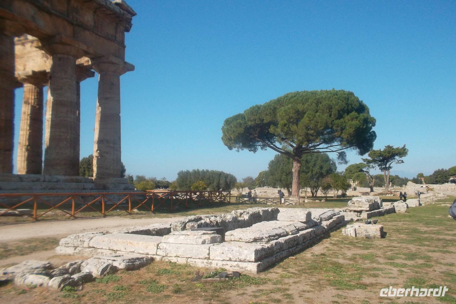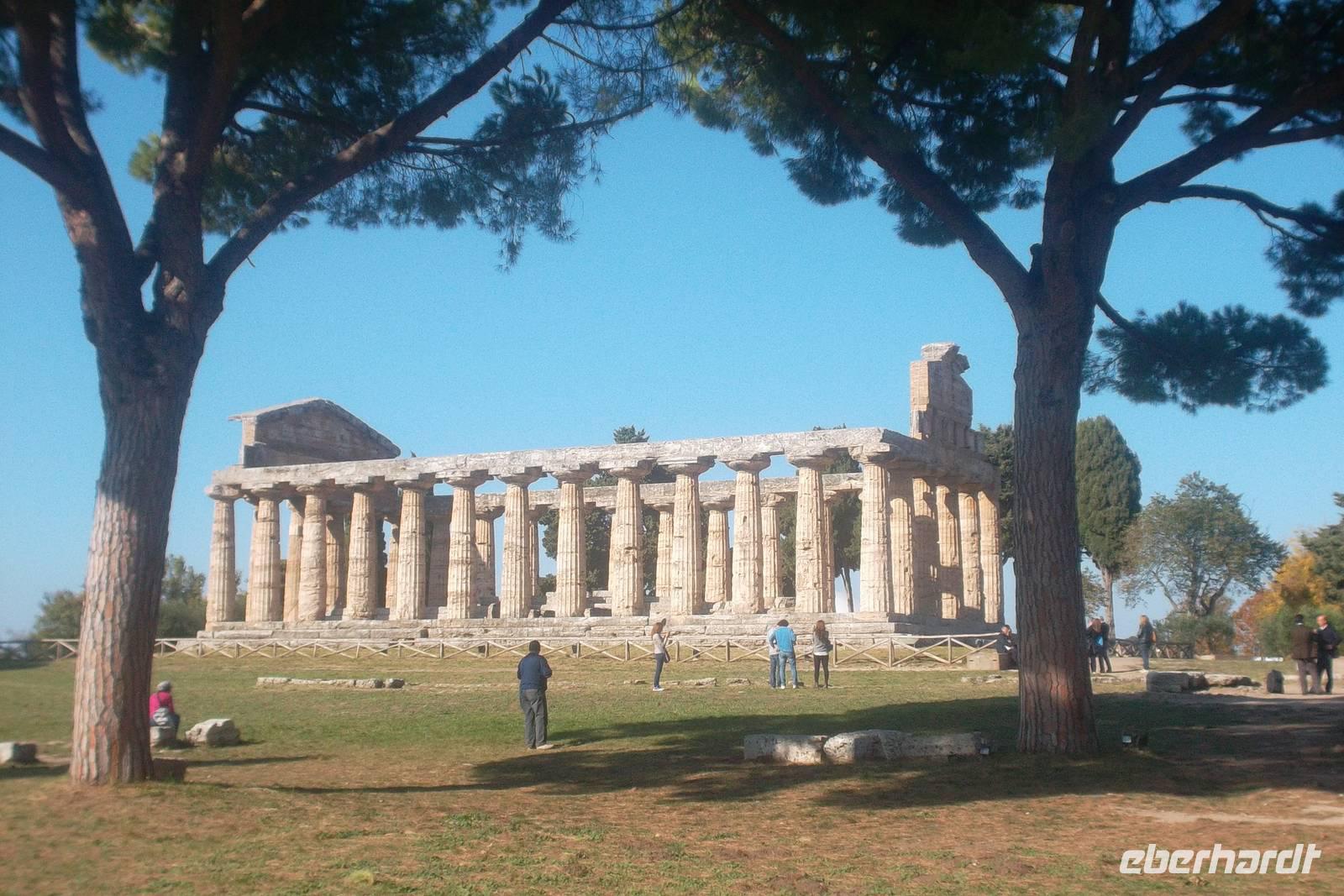 Tageshöhepunkt war allerdings das antike Paestum. Drei nahezu komplett erhaltene griechische Tempel zeugen von einer der größten antiken Griechenstädte Süditaliens, Die als Hafenstadt für den Handel mit den Etruskern gegründete Siedlung wurde erst von den in der Umgebung lebenden Lucaniern erobert, dann wurden diese von den Römern besiegt und Paestum wurde römische Kolonie. Später verlagerten sich die Handelswege und die Stadt verlor an Bedeutung. Schließlich wurde sie nach verschiedenen Zerstörungen durch Araber und Normannen im Mittelalter aufgegeben.