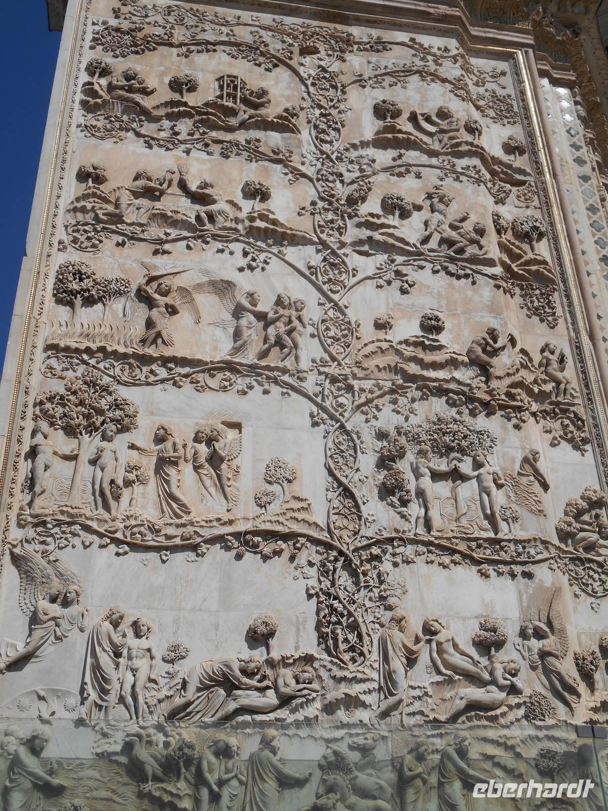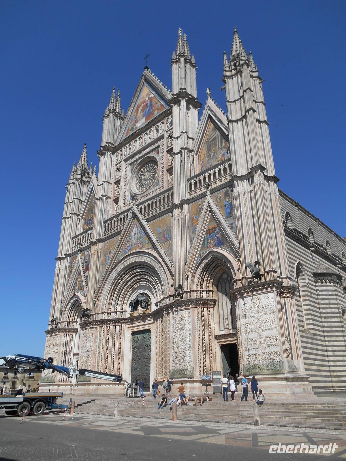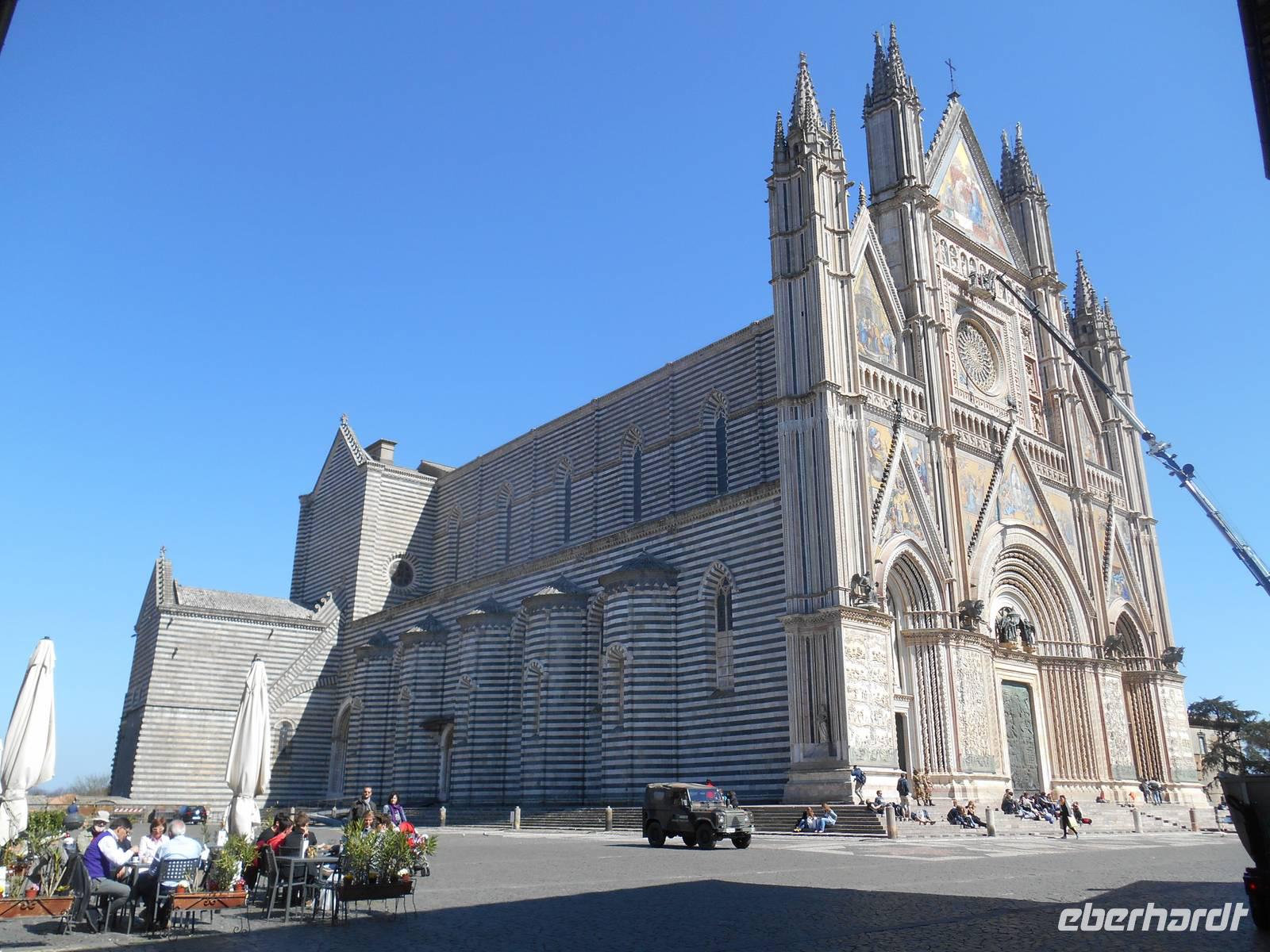 Nach einem für italienische Verhältnisse "reichhaltigen Frühstücksbuffet" mit Wurst und Käse - für einen Italiener völlig unnormal, wie man bereits am Morgen so viel essen kann - fuhren wir weiter in Richtung Süden. An Verona vorbei ging es nun durch die weitläufige Po-Ebene, natürlich überquerten wir dabei auch den Po, der der Ebene den Namen gab. Der Po ist mit 652 Kilometern der längste Fluss Italiens; er entspringt in den Kottischen Alpen und mündet südlich von Venedig ins Adriatische Meer. Wenig später erreichten wir Modena, hier endet nun übrigens nach insgesamt 333 Kilometern auch erst die Brennerautobahn! Am Südrand der Po-Ebene entlang bis Bologna, der Hauptstadt der Region Emilia-Romagna, führte uns unser Weg hinein in den tosco-emilianisch-romagnolischen Apennin. Der Scheitelpunkt der Autobahn liegt auf über 700 Metern. In den Apennin erreichten wir dann auch etwa 40 Kilometer nördlich von Florenz eine der bekanntesten Regionen Italiens - die Toskana! Florenz ließen wir leider nur links liegen, aber wir hatten heute schließlich auch noch einiges vor. Wir genossen die Fahrt durch die sanft gewellte Hügellandschaft der Toskana, fuhren vorbei an Arezzo und Montepulciano in die Region Umbrien hinein. Umbrien ist eine der wenigen Binnenregionen Italiens und wird oft auch als das "grüne Herz Italiens" bezeichnet. Unser Ziel war Orvieto, einzigartig auf einem 300 Meter hohen vulkanischen Tuff-Felsen gelegen! Gemeinsam fuhren wir mit einer Funicolare in die Altstadt von Orvieto hinauf und trafen dort unseren charmanten Stadtführer Marco. Die unter den Etruskern bedeutende Stadt nahm als Zufluchtsort von Papst Klemens VII. während der Plünderung Roms (Sacco di Roma, 1527) eine herausragende Stellung ein. Heute gehört Orvieto mit seinen herrlichen Baudenkmälern zu den interessantesten Städten Mittelitaliens. Wahrzeichen ist der Dom - mit seinem Bau wurde 1290 begonnen zur Aufbewahrung der Reliquien des Blutwunders von Bolsena. Die Errichtung des Bauwerks erforderte bis zur Vollendung im Jahr 1600 die Zusammenarbeit von ungefähr hundert Architekten, Bildhauern, Malern und Mosaiklegern. Die Fassade des Doms ist die kühnste und farbenprächtigste der italienischen Gotik. Mit vielen schönen Eindrücken im Gepäck erreichten wir am Abend die Hauptstadt Italiens - Rom! Gegen 19 Uhr kamen wir im Hotel "Oly", unserem Quartier für die nächsten drei Nächte, an. Hier begrüßten wir auch weitere 6 Fluggäste und somit war unsere Gruppe mit nunmehr insgesamt 18 Personen komplett. Unser Abendessen nahmen wir heute im Hotel ein.
