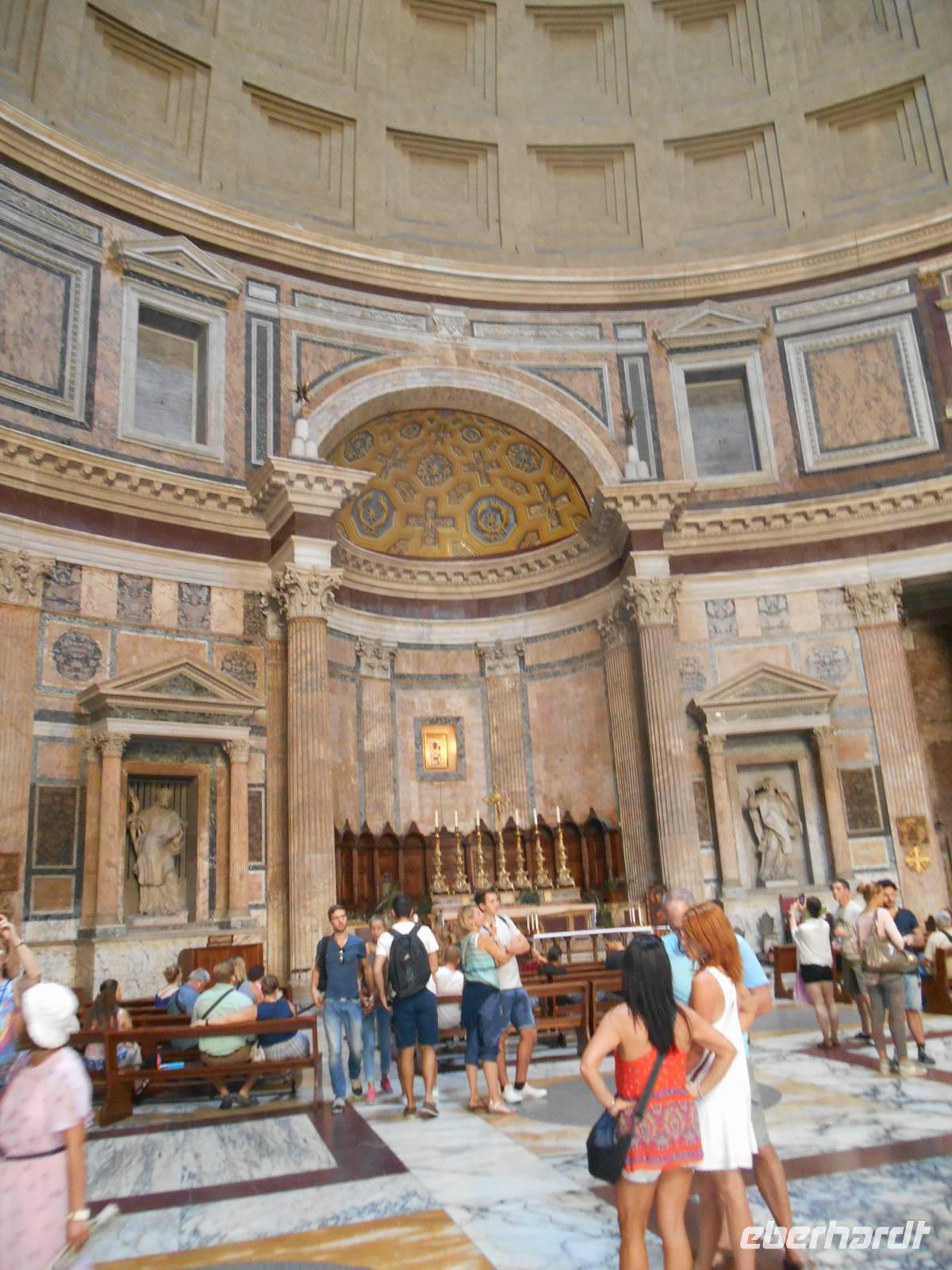 Die Sonne lachte auch heute wieder und nach dem Frühstück fuhren wir gemeinsam mit öffentlichen Verkehrsmitteln in die Stadt hinein. Nach einer Fahrt mit der Metro bzw. einem kleinen Spaziergang kamen wir am Petersplatz, dem Zentrum der katholischen Christenheit, an. Ach so, wir waren ja jetzt eigentlich gar nicht mehr in Rom, sondern im Vatikan. Wenn man von hier nach ganz rechts oben schaut, sieht man das Arbeitszimmer des Papstes, letzter Stock des Apostolischen Palastes, zweites Fenster von rechts. Sonntags um zwölf spricht er hier das Angelus-Gebet. Unter den Kolonnaden des Bernini erspäht man die Schweizergarde - jawohl, immer noch echte Schweizer, und die Uniform ist noch die, welche Michelangelo entworfen hat. Am anderen Ende der Piazza, majestätisch wie ein ruhender Löwe - die Peterskirche, die wir nunmehr besichtigten. Allein der Baldachin über dem Petrus-Grab ist genauso hoch wie der Palazzo Farnese, einfach gigantisch! Aber die größte Kirche der Christenheit befindet sich im kleinsten Staat der Welt, denn der Vatikan ist mit 44 Hektar Staatsgebiet nicht gewaltiger als ein mittlerer Bauernhof. Seine knapp 500 Einwohner bilden das, was man andernorts eine Dorfgemeinschaft nennen würde. Eine Kaffeebar gibt es nicht, dagegen hält der Vatikan zu 170 Staaten diplomatische Beziehungen und der Papst empfängt weitaus mehr Staatsmänner zur Audienz als die italienische Regierung zu offiziellen Unterredungen. Die katholische Kirche ist übrigens die einzige Weltreligion, deren Oberhaupt gleichzeitig unumschränkte Autorität eines souveränen Staates ist. Nach dem Passieren der Sicherheitskontrolle war es dann soweit - man ist einfach überwältigt! Der Petersdom ist die größte christliche Kirche der Welt und fasst 60.000 Menschen. Im Petersdom ist nach christlichem Glauben der Apostel Petrus begraben. Obwohl sie nicht offizieller Sitz des Papstes ist (diesen stellt die Lateranbasilika/San Giovanni in Laterano dar), hält der Papst hier fast alle seiner Messen. Die Kirche beherbergt zahlreiche Kunstwerke, zum Beispiel die „Pietà" von Michelangelo, die hinter Glas steht, da sie 1972 von einem Kirchenbesucher mit einer Axt beschädigt wurde. Im nordwestlichen Teil befindet sich die Statue des heiligen Petrus, deren Füße traditionell von den Pilgern geküsst werden. Über den Hauptaltar, dem Grab Petris, erstreckt sich ein 30 Meter hoher Baldachin aus Bronze, der von Bernini entworfen wurde. Wir trafen uns alle nach etwas Freizeit am Petersplatz wieder und schlenderten weiter in Richtung Engelsburg, einem ursprünglichen Grab-Bau für Kaiser Hadrian (117-138 n. Chr.). Den heutigen Namen erhielt das ehemalige Hadrianeum, als im Jahre 590 Papst Gregor der Große eine göttliche Vision hatte: ein Engel erschien ihm über dem Mausoleum und kündigte das Ende der damals herrschenden Pest an, indem er sein Schwert in die Scheide steckte - heute so dargestellt in der bronzenen Engelsstatue aus dem Jahre 1753 auf der Spitze des Kastells. Weiter ging es über den Tiber zur Piazza Navona, einem herrlichen Platz inmitten der Stadt! Gian Lorenzo Bernini schuf hier im 17. Jahrhundert einen der schönsten Brunnen des Barocks, den Vier-Ströme-Brunnen (Fontana dei Quattro Fiumi). Die vier riesenhaften Flussgötter symbolisieren die vier großen Ströme: Donau, Nil, Ganges und Rio de la Plata. Weiter spazierten wir durch die engen Gassen der Altstadt zum Pantheon - ein Zylinder mit einer Kuppel drauf, so einfach-genial ist die Konstruktion des Pantheons! Markus Agrippa, Schwiegersohn von Augustus, ließ das Pantheon 27 v. Chr. den Göttern bauen. Hier am Pantheon verbrachten wir auch unsere heutige Mittagspause, um uns kulinarisch zu stärken. Satt und zufrieden erreichten wir nunmehr den berühmten Trevi-Brunnen (dieser wurde leider gerade restauriert). Roms beliebteste Wasserorgel steht auf einem kleinen Platz, umgeben von sechsstöckigen Palazzi. Mit dem Bau schufen sich die Barockpäpste 1750 ein letztes großes Denkmal, denn ihre Macht im Kirchenstaat schwand dahin. Meeresgott Ozeanus braust mit zwei Pferden durch einen Triumphbogen heran. Viele Gäste warfen Münzen in den Brunnen, um nach Rom zurückzukehren. Abschließend gelangten wir zur berühmten Spanischen Treppe. Die beschwingten Balustraden der Spanischen Treppe unter der französischen Kirche Trinita dei Monti sind das harmonische Ergebnis eines jahrzehntelangen Streits zwischen den Päpsten und der französischen Krone. Die Franzosen finanzierten den Aufgang zu ihrer Nationalkirche, und der Sonnenkönig Ludwig XIV. hätte sich am liebsten selbst auf der Piazza di Spagna ein Denkmal gesetzt. Aber die Päpste brachten schließlich ihre Version durch und ließen 1723 die elegante Treppenanlage schaffen. Nach dieser eindrucksvollen Besichtigung verabschiedeten wir uns von Sylvia, die uns in den letzten zwei Tagen durch „IHR" Rom geführt hat. Die anschließende Freizeit nutzten die meisten Gäste schließlich für Shopping-Touren oder zu schönen Spaziergängen in der Umgebung der Spanischen Treppe. Nach einem schmackhaften Pasta-Abendessen in der Nähe der Engelsburg ging es am Abend mit öffentlichen Verkehrsmitteln zum Hotel zurück.