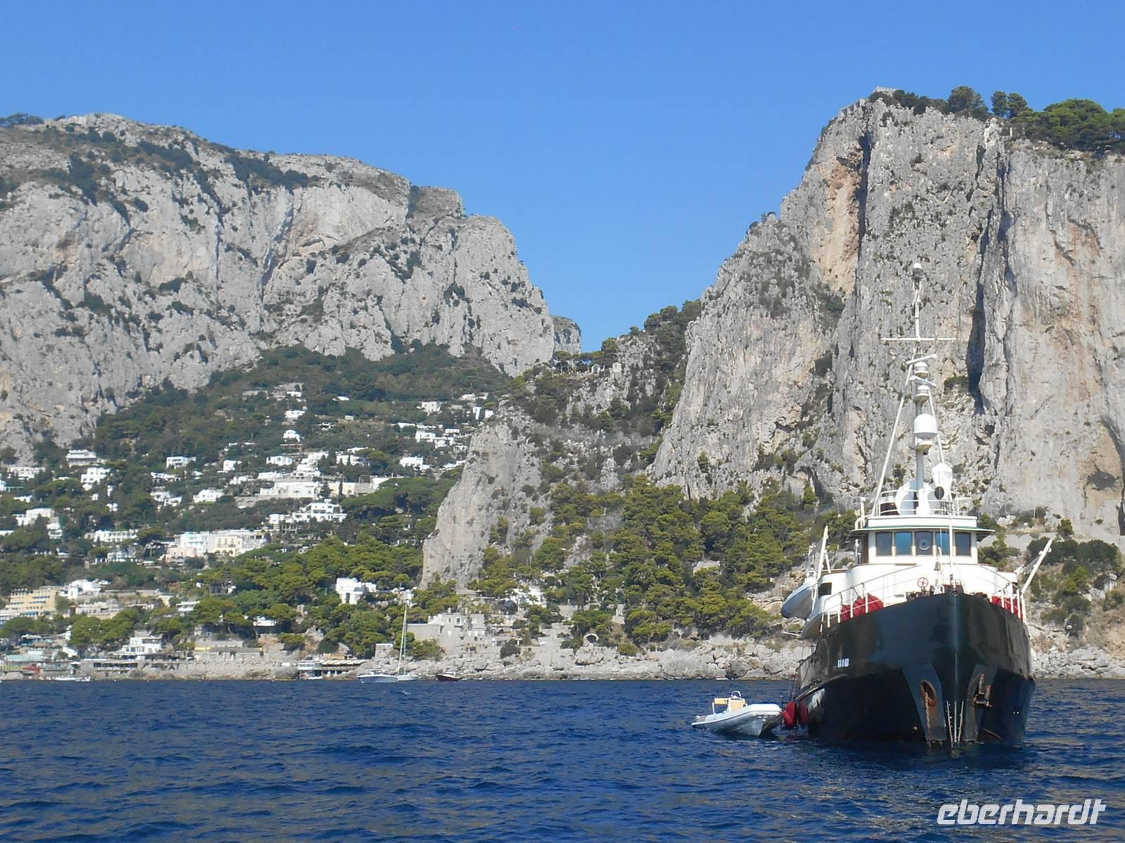 Ein weiterer Höhepunkt unserer Reise stand heute auf dem Programm. Wir fuhren mit 2 einheimischen Kleinbussen zum Hafen in Sorrent und nahmen von dort die Fähre zur Insel Capri. Die Überfahrt dauerte nur etwa 35 Minuten. Schon von weitem türmt sich die Insel wie unzugänglich auf. Zwei durch einen geschwungenen Sattel verbundenen Hochebenen, auf denen die Orte Capri und Anacapri liegen, ineinander geschachtelte Häuserkuben, überragt von gekalkten und bunt gekachelten Kuppeln. Für uns war klar - Capri ist der Kontrast zwischen intensivem Blau des Meers, den strahlend weißen Felswänden und dem tiefen Grün der Vegetation. Wir unternahmen eine Schifffahrt rund um die Insel - die Ausblicke faszinierten uns, schließlich hatten wir auch heute wieder tolles Wetter erwischt! Unser örtlicher Reiseleiter Antonio erzählte uns so manch nette Episode über die Insel. Bis auf einige Jahrhunderte, als die Präsenz von Piraten Vergnügungsreisen auf die Insel verbot, war Capri seit den Tagen des Augustus Ziel meist betuchter Reisender. Vielen gefiel die Kalkklippe im Meer so gut, dass sie zu Einheimischen wurden. Der erste „Prominente", der auf die Insel ausstieg, war der Nachfolger des vergöttlichten Augustus, Kaiser Tiberius, der die Insel zu einer riesigen Privatvilla umbaute; Mauerreste sind übrigens zum Teil noch deutlich zu sehen. Capri ist heute für das Mittelmeergebiet ein Botanischer Garten, auf so engem Raum lässt sich sonst nirgends die Vielfalt der mittelmeerischen Pflanzenwelt beobachten. Rund 1.000 Arten sind es, davon 150, die nur auf der Insel Capri vorkommen! Für die Geologen sei erwähnt, dass Capri nur die Fortsetzung der Amalfitanischen Halbinsel ist. Rund um die Insel sind über sechzig Höhlen und Grotten zu bewundern. Wir besuchten die beiden Inselorte, Capri und Anacapri - diese beiden Orte leben solange man weiß in Fehde; sie hatten sich voneinander isoliert, erst die im letzten Jahrhundert geschaffene Straßenverbindung brachte eine Veränderung. Wir fuhren in Minibussen auf den engen Straßen der Insel - sehr abenteuerlich! Am Abend fuhren wir dann mit der Fähre zurück auf das Festland nach Sorrent.