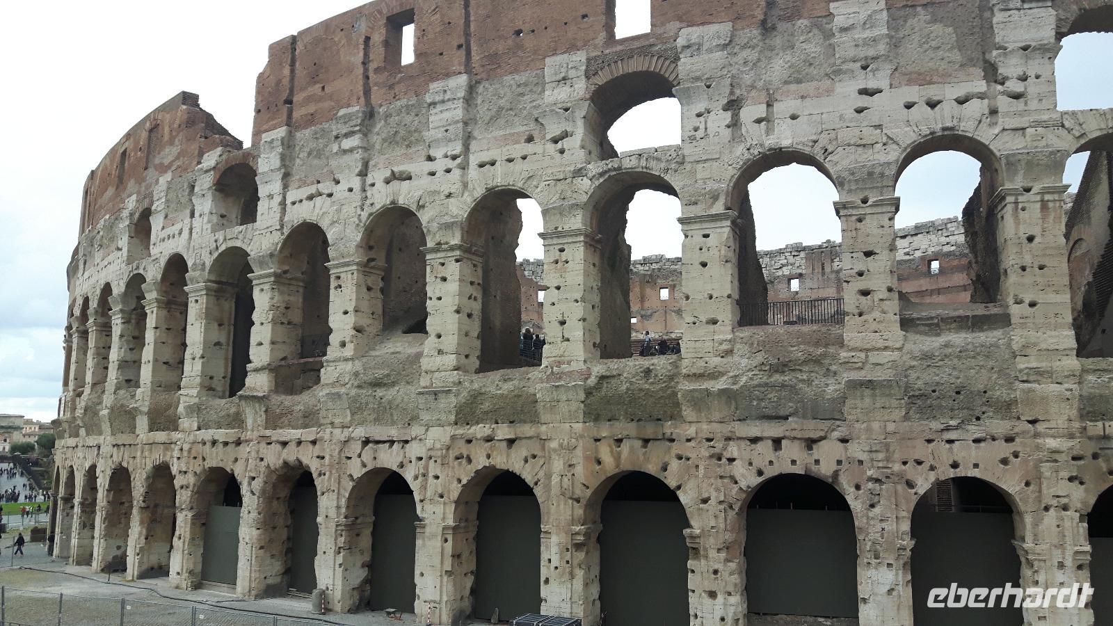 Das Frühstück im Hotel war zwar nicht so üppig wie zu Hause, aber das wussten wir bereits vorher und somit fuhren wir gut gelaunt mit unserem eigenen Reisebus in die Stadt hinein. Unsere nette Stadtführerin Agnieszka erwartete uns bereits in der Nähe des Petersdomes und hier begann auch gleich die Stadtführung. Im Gianicolo-Parkhaus verließen wir zunächst erst einmal unseren Bus, um zu Fuß zum Petersplatz zu gelangen. Die heute extrem starken Sicherheitskontrollen machten uns bereits stutzig - heute musste irgendetwas Besonderes auf dem Petersplatz stattfinden! Und siehe da - der Papst hielt heute eine außerordentliche Generalaudienz ab. Im Rahmen des laufenden Heiligen Jahres der Barmherzigkeit findet diese, neben den Generalaudienzen am Mittwoch, einmal im Monat am Samstag statt. Somit konnten wir den Papst Franziskus hautnah erleben und wer kann das schon von sich behaupten? Das war ein erster großer außerplanmäßiger Höhepunkt unseres Rom-Aufenthaltes! Im Anschluss an diese aufregenden Momente begannen wir mit dem ersten Teil unserer informativen Stadtrundfahrt - diese führte uns unter anderem vorbei an berühmten Plätzen und Straßen der Stadt wie der Piazza Venezia mit dem Nationaldenkmal, der Via Nazionale, der eleganten Via Veneto, der Engelsburg und der Tiberinsel. So langsam bekamen wir Hunger und unser Bus brachte uns daher zur faszinierenden Kirche Sankt Paul vor den Mauern, wo wir erst einmal eine Mittagspause einlegten. Jeder nutzte die Zeit ganz individuell, um ein Stück Pizza bzw. etwas Pasta in einer der Bars zu essen oder ganz einfach ein leckeres italienisches Eis zu schleckern! Die Kirche Sankt Paul vor den Mauern schauten wir uns natürlich auch etwas näher an, denn die Ausstattung mit den Deckengemälden einschließlich den Porträts aller Päpste sind wirklich sehenswert und auch das wiederentdeckte Paulusgrab hat eine gewisse Mystik. Gut gestärkt trafen wir uns alle am Bus wieder und setzten unsere Stadtrundfahrt fort. Es ging nun weiter vorbei an den Caracalla-Thermen, welche mehr als nur ein Badehaus waren, zum Circus Maximus. Dieses war das größte Stadium im antiken Rom. Fast ein ganzes Jahrtausend lang wurden dort beliebte Wagenrennen gehalten. An einem Punkt der Geschichte bot der Circus Platz für 250.000 Leute - ein Viertel von Roms Bevölkerung! Ab und an stiegen wir aus unserem Bus aus und unternahmen kleine Spaziergänge, so zum Beispiel in der Nähe des Kapitolshügels, um diesen zu Fuß zu erklimmen und von dort aus einen Blick auf das Forum Romanum zu werfen. Von den hiesigen Kaiserforen wurde nicht nur Rom, sondern das ganze Römische Reich regiert. Hier lag für fast 1.000 Jahre das Zentrum der Antike. Der Etruskerkönig Priscus hatte im 6. Jh. v. Chr. den Sumpf zwischen Kapitol, Palatin und Esquilin entwässert und als „Cloaca Maxima", die erste große Kläranlage der Antike, dem Tiber zugeführt. Das Forum Romanum, ursprünglich als Vesta-Heiligtum gedacht, entwickelte sich schließlich vom Viehmarkt zur politischen Arena. Anschließend brachte uns unser Bus zu einer weiteren wichtigen Kirche Roms - der Kirche Santa Maria Maggiore, einer der vier Patriarchalbasiliken Roms! Sie wurde unter Papst Sixtus III. errichtet, nachdem 431 das Konzil von Ephesus Maria, die Mutter Jesu, als Gottes Gebärerin verkündet hatte und dadurch die Marienverehrung aufgeblüht war. Am Nachmittag stand ein letzter Höhepunkt des heutigen Besichtigungsprogramms auf dem Programm - das Kolosseum! Kaiser Vespasian begann den Bau 72 n. Chr., sein Sohn Titus weihte die Arena nach nur achtjähriger Bauzeit mit hunderttägigen Festspielen ein. Unzählige Tiere und Gladiatoren wurden geopfert. Sehr lebendig sind allerdings noch die Legionäre, mit denen man hier gegen ein Entgelt für ein Foto posieren kann. Hier hatten wir zum Glück auch noch etwas Freizeit, um uns in den zahlreichen Straßencafés einen leckeren Cappuccino schmecken zu lassen - einfach himmlisch...! Andere Gäste, die noch etwas Energie übrighatten, konnten jetzt noch das Kolosseum bzw. das Forum Romanum individuell besichtigen. Nach einem leckeren Abendessen in der Innenstadt kehrten wir gemeinsam gegen 21.30 Uhr zum Hotel zurück. Ein zwar anstrengender, aber auch sehr eindrucksvoller Tag ging nun zu Ende.