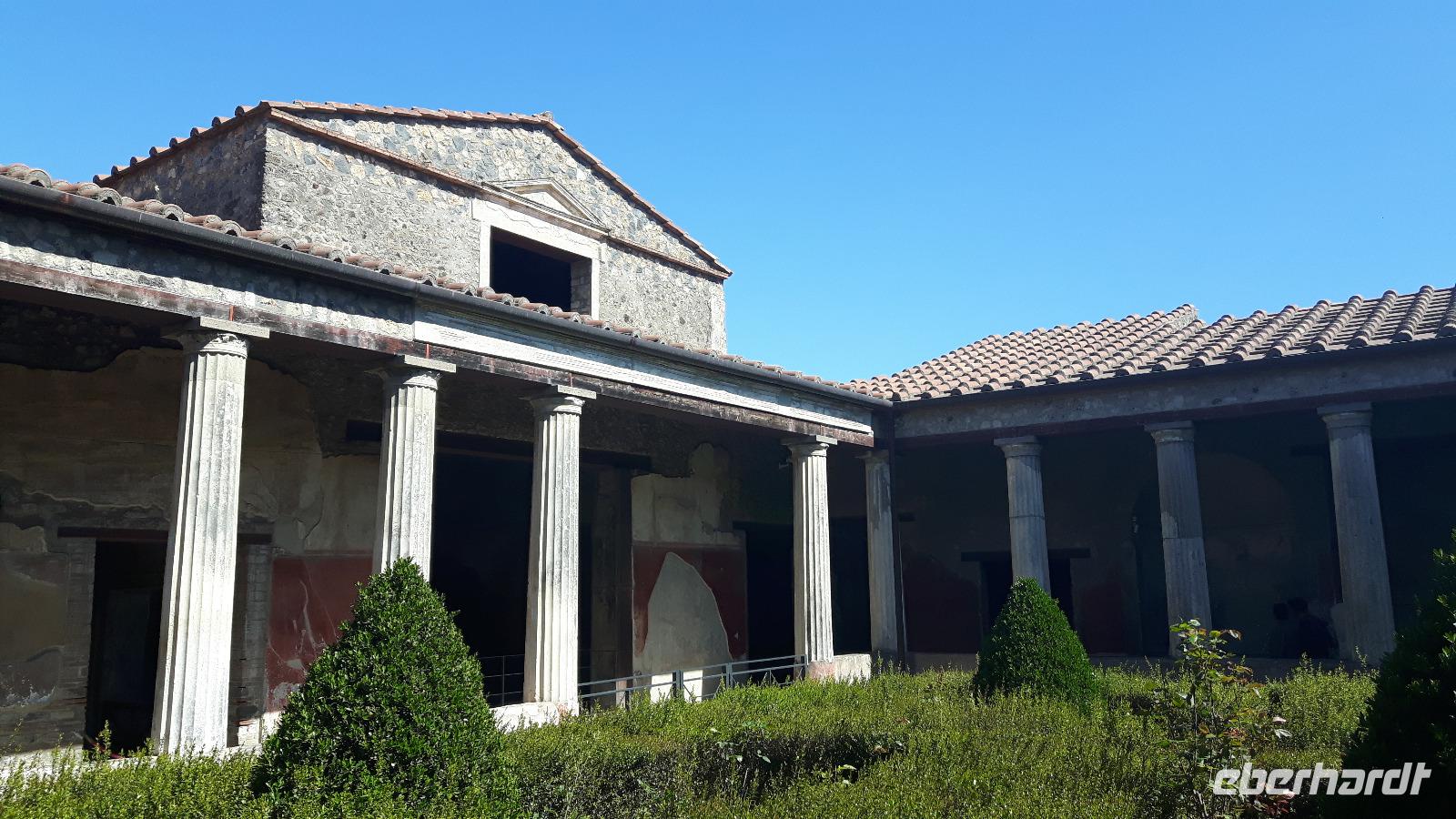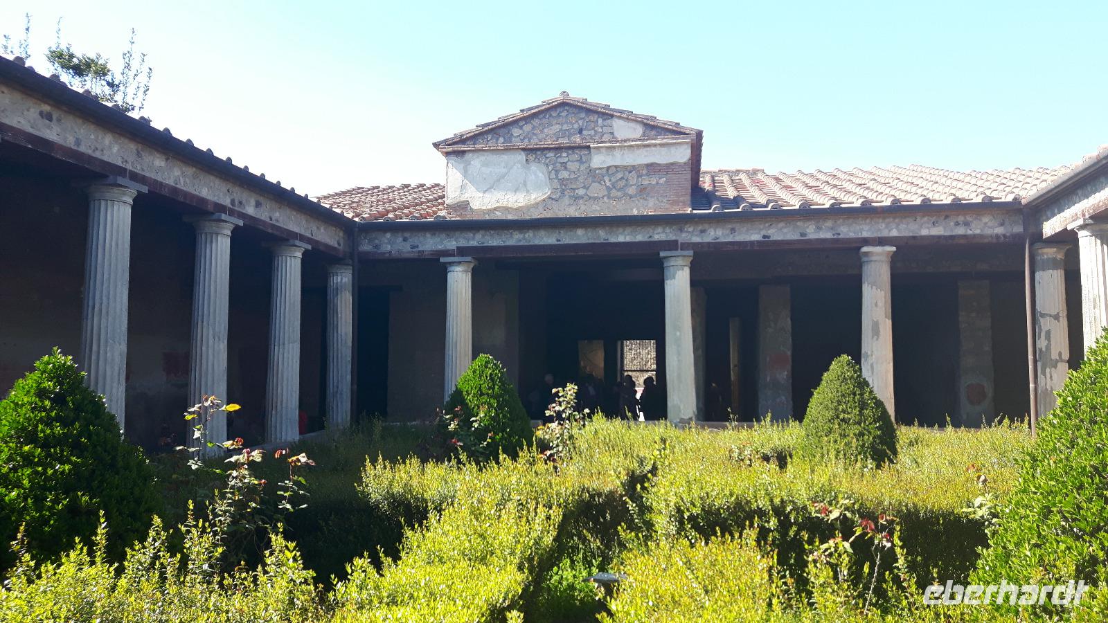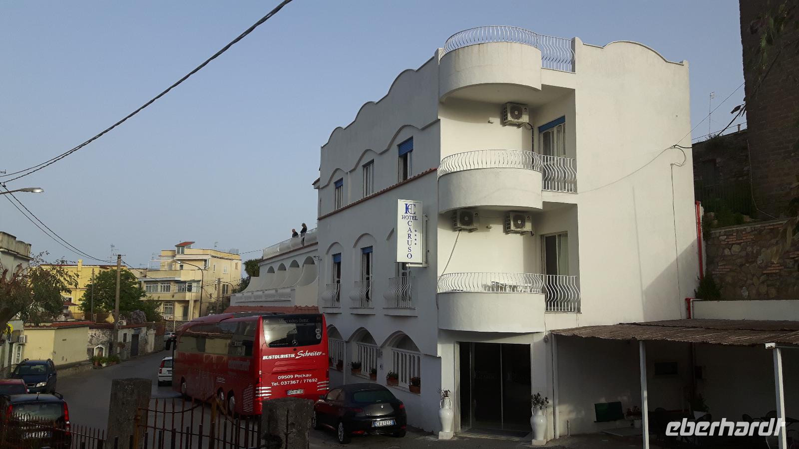 Heute hieß es „Arrividerci Roma" - wir fuhren weiter in den Süden und zwar in Richtung Neapel. Schon von weitem sahen wir, dass der heutige Vesuv eigentlich zwei Gipfel hat, nämliche den Monte Somma, den Rest des alten Vesuv, der beim Ausbruch 79 n. Chr. regelrecht explodiert ist und den 1.280 Meter hohen eigentlichen Gipfel des Vesuvs. Der Bus brachte uns bis auf knapp 1.000 m hinauf, die restlichen etwa 300 Höhenmeter mussten wir zu Fuß zurücklegen. Das erste Drittel war ziemlich steil, dann ging es gemächlicher voran, nach reichlich einer halben Stunde standen wir am Kraterrand. Der Berg scheint völlig zu ruhen, wir sahen nur ein paar Dampfquellen. Umso erstaunlicher ist für uns die Tatsache, dass dieser Vulkan ein Pulverfass ist - der letzte Ausbruch war 1944, das ist lange her. Experten sagen, dass ein gewaltiger Gesteinspfropfen den Krater versperrt und die vulkanischen Kräfte sich somit aufstauen, je länger der Berg ruhig bleibt, desto heftiger wird eines Tages die Eruption sein. Etwa 700.000 Neapolitaner leben weniger als zehn Kilometer vom Krater entfernt, jedem ist die Gefahr bewusst, man verdrängt sie allerdings permanent. Die vulkanische Erde ist sehr fruchtbar und sichert den Bewohnern gute Einnahmen in der Landwirtschaft. Am frühen Nachmittag erreichten wir das nahe gelegene Pompei, wo wir unsere kompetente Reiseführerin Esther trafen. Die archäologische Zone von Pompei ist heute ein riesiges Freilichtmuseum römischer Lebensweise. Pompei ist eine Stadt, die innerhalb von Stunden von ihren Bewohnern verlassen wurde und dann bis zu ihrer Ausgrabung keine Veränderung mehr erfuhr. Mit der Katastrophe des Jahres 79 hatte niemand gerechnet. Das schwere Erdbeben 16 Jahre zuvor signalisierte nach heutigen Erkenntnissen wahrscheinlich das Ende einer langen Ruhephase des Vulkans, denn auch in späterer Zeit waren Ausbruchsperioden fast immer von Erdbeben begleitet oder vorangekündigt. Das ausgegrabene Pompei zeigt deutliche Spuren des Erdbebens und überall in der Stadt weisen Mörtelhaufen und Baumaterial auf den noch andauernden Wiederaufbau hin. Es ist für uns heute unvorstellbar, aber man muss sich vorstellen, dass im Jahre 79 der obere Teil des Vesuvs unter dem Druck der aufsteigenden Gase regelrecht explodierte. Über dem Berg stand eine riesige, wie eine Pinie geformte Aschenwolke, die dann auf die Umgebung, besonders auf Pompei niederregnete. Der Untergang Pompeis erfolgte keineswegs innerhalb von Minuten, sondern dauerte Stunden und Tage, so dass mit Sicherheit der größte Teil der Einwohner zumindest das nackte Leben retten konnte. Schließlich erstickten hochgiftige Gase und die sich meterhoch auftürmenden heißen Vulkanaschen alles Leben. Was jetzt noch an lebenden Wesen zurückgeblieben war, wurde von der Asche wie von einer Gussform eingehüllt, Fleisch und Knochen verbrannten und wurden von ätzenden, scharfen Mineralsalzen zerfressen - ein Hohlraum entstand. Während der Ausgrabungen wurden viele dieser Hohlräume mit Gips ausgegossen und wir haben heute ein makaber-plastisches Bild des Todeskampfes der Zurückgebliebenen: Hunde, Gefangene, Zögernde, die noch möglich viel von ihrem Besitz retten wollten, wahrscheinlich auch Plünderer. Pompei ist einzigartig - wir gingen durch Straßen, an Geschäften, Restaurants und Bädern vorbei... Nach dieser interessanten Führung in Pompei brachen wir zur Sorrentinischen Halbinsel auf, wo wir in Termini, einem Ortsteil von Massalubrense, die nächsten vier Nächte zu Hause waren. Im kleinen und familiengeführten Hotel „Caruso" wurden wir freundlich begrüßt - allein der herrliche Blick zur Insel Capri war ein absoluter Traum!