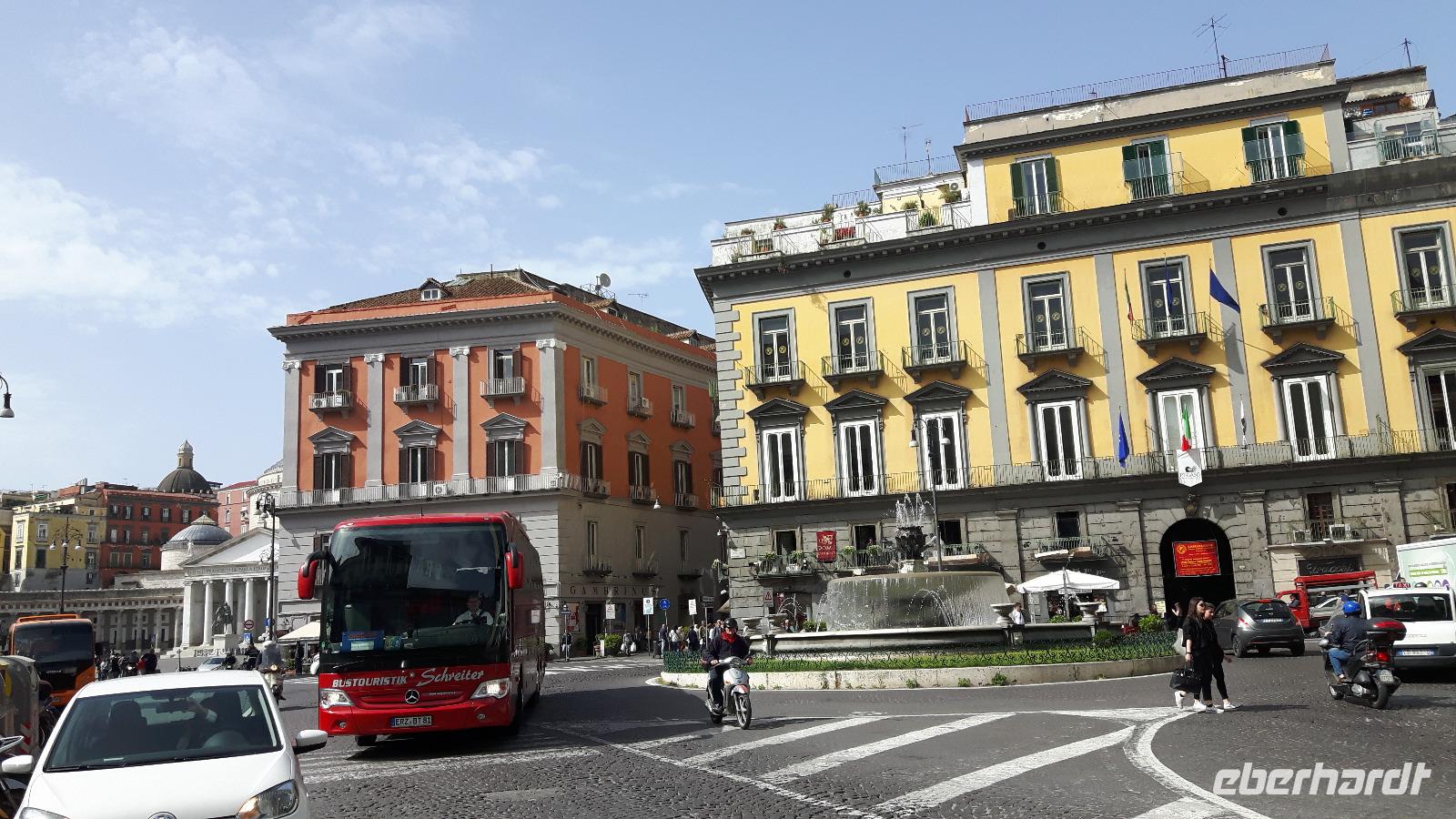 Ein weiterer Höhepunkt unserer Reise stand heute auf dem Programm - die meisten unserer Gäste hatten sich für unseren Zusatz-Ausflug in die quirlige Millionenstadt Neapel entschieden. Erstaunlich ruhig ging es heute auf den Straßen der Stadt zu und somit erreichten wir überpünktlich den zentralen Piazza Garibaldi, wo wir mit kleinen Schwierigkeiten auf unseren Stadtführer Pietro trafen. Sein Handy war nämlich ständig besetzt und somit war es unmöglich, ihn zu erreichen und ihm mitzuteilen, dass wir zeitiger da waren als geplant. Nichts desto trotz, wir nahmen es ihm nicht übel und starteten sofort mit der Stadtbesichtigung. Zunächst besuchten wir die in der Altstadt gelegene Galleria Umberto I. Sie wurde Ende des 19. Jahrhunderts erbaut und ist eine der ersten großen und eleganten Einkaufspassagen weltweit. Hinter ihrer prächtigen Fassade mit riesigen klassizistischen Säulen und kleineren Statuen schraubt sich ein beeindruckendes durchgängiges Glasdach in große Höhe. Bis knapp darunter findet sich klassizistischer Stuck soweit das Auge reicht. Der Fußboden bietet Marmor und Mosaiken mit Sagengestalten, Tiermotiven und Olivenzweigen. In den hohen Schaufenstern der edlen Modegeschäfte zu ebener Erde liegt das aus, was die Welt an Italien so schätzt - elegante italienische Kleidung, stilvolle Ledertaschen und -schuhe. Man findet dort besonders die Mode des nicht enden wollenden neapolitanischen Sommers in gehobener Preiskategorie! Weiter ging es zu Fuß entlang der Via Toledo zur Piazza del Plebiscito, einem mit beeindruckenden klassizistischen Gebäuden umgebenen Flanier- und Konzertplatz. Dort steht übrigens auch der große Königspalast Palazzo Reale. Gleich um die Ecke erblickten wir das im 18. Jahrhundert an den Palazzo Reale angebaute berühmte Opernhaus Teatro San Carlo. Anschließend erreichten wir mit unserem Bus die Außenviertel der Stadt und genossen vom Vomero-Hügel einen tollen Blick auf die Dächer Neapels und die gesamte Golfregion - sehr beeindruckend! Nach einer stärkenden Mittagspause direkt am Meer fuhren wir weiter in Richtung Pozzuoli, wo wir an den sogenannten „Phlegräischen Feldern" ankamen. Der Name dieser vulkanischen Gegend bei Neapel kommt vom griechischen „phlegreos", was so viel wie „heiß" oder „schwelend" bedeutet. Wir besichtigten den Schwefelkrater der Solfatara, den wohl eindrucksvollsten Vulkan der phlegräischen Felder. Während man durch die stinkende und bizarre Welt des Feuergottes Hephaistos wandert, steigen Rauchfahnen aus der Erde auf. Heiße Thermalgrotten stoßen Schwefelwolken aus, Schlammlöcher brodeln und Geysire schnellen plötzlich aus dem Boden. Solfatara wird auch der „Vorsaal zur Hölle" genannt, denn beim stärkeren Auftreten auf den schneeweißen Boden kann man das dumpfe, hohlklingende Echo der Unterwelt hören. Die mystische Atmosphäre dieses Ortes ist beklemmend und faszinierend zugleich!