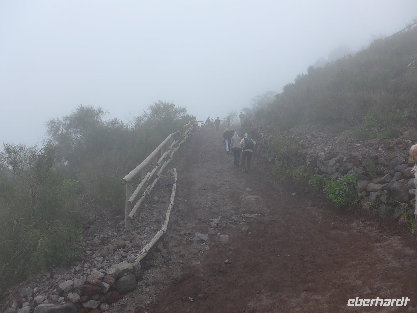 Auf in Richtung Süden. Heute hieß es Abschied nehmen von der ewigen Stadt Rom. Vorbei an den Albaner Bergen und Monte Cassino, einem Ort mit viel symbolgehalt, ging es in den Großraum von Neapel. Nun war ein Abenteuer angesagt. Auch wenn der Vulkan tief und fest schläft, der Aufstieg ist nicht ganz ohne. Mit festen Schuhwerk ging es den steilen Anstieg hinauf zum Kraterrand. Nach dem Motto „ Sie sehen, dass sie nichts sehen konnten wir nur in kurzen hellen Momenten den Krater erahnen. Ganz mit Wolken umhüllt traten wir sehr schnell den Rückweg zum Bus an. Der Nachmittag war wieder mit viel Geschichte verbunden. Romane, Filme, und nicht zuletzt der Lateinunterricht haben den Mythos der antiken Naturkatastrophe verfestigt Die versunkene Stadt Pompeji, nach Ausgrabung zu neuem Leben erweckt war unser Ziel. Der fachkundige Rundgang ermöglichte den Einblick in die öffentliche Infrastruktur einer antik-römischen Stadt.